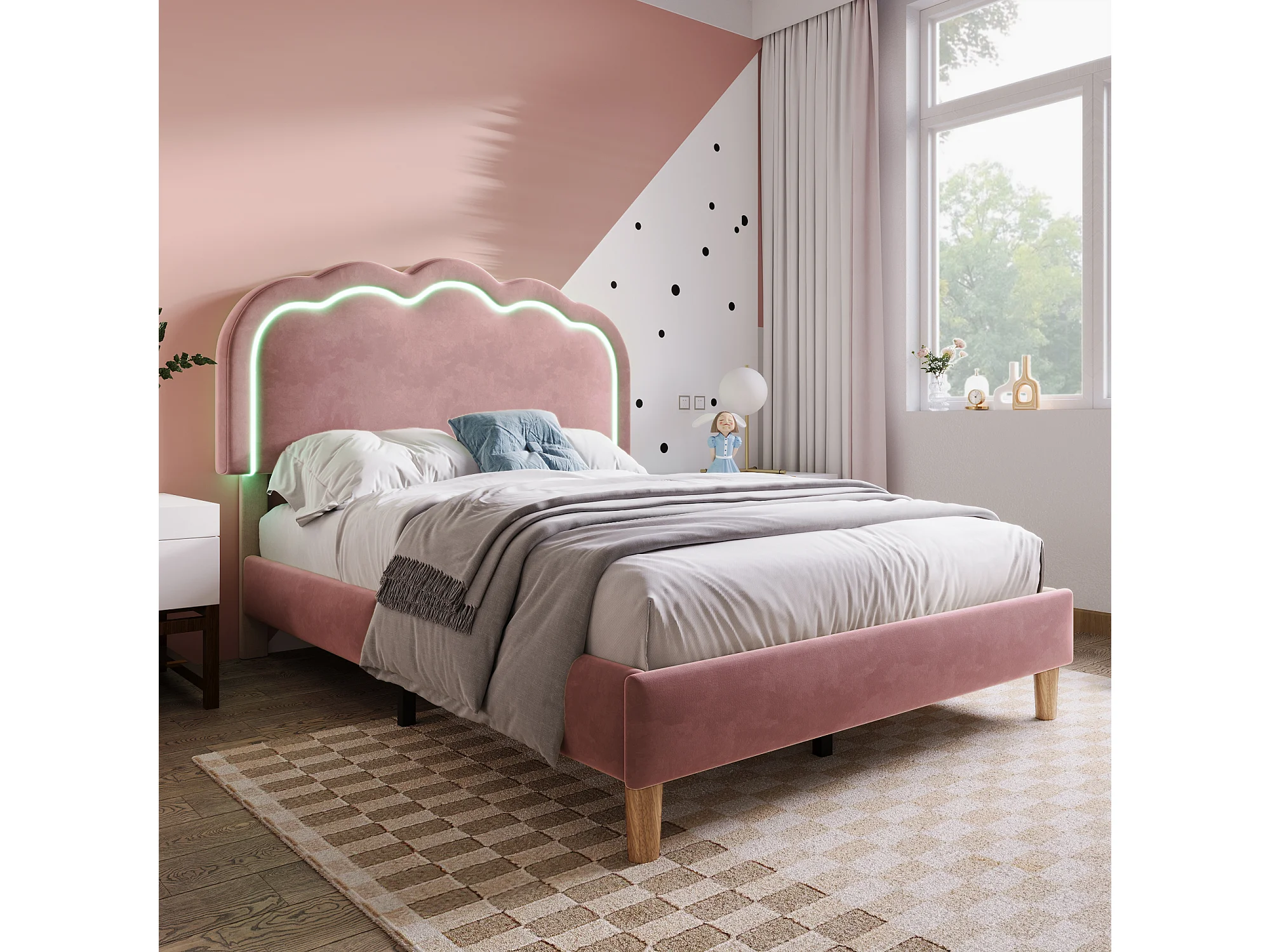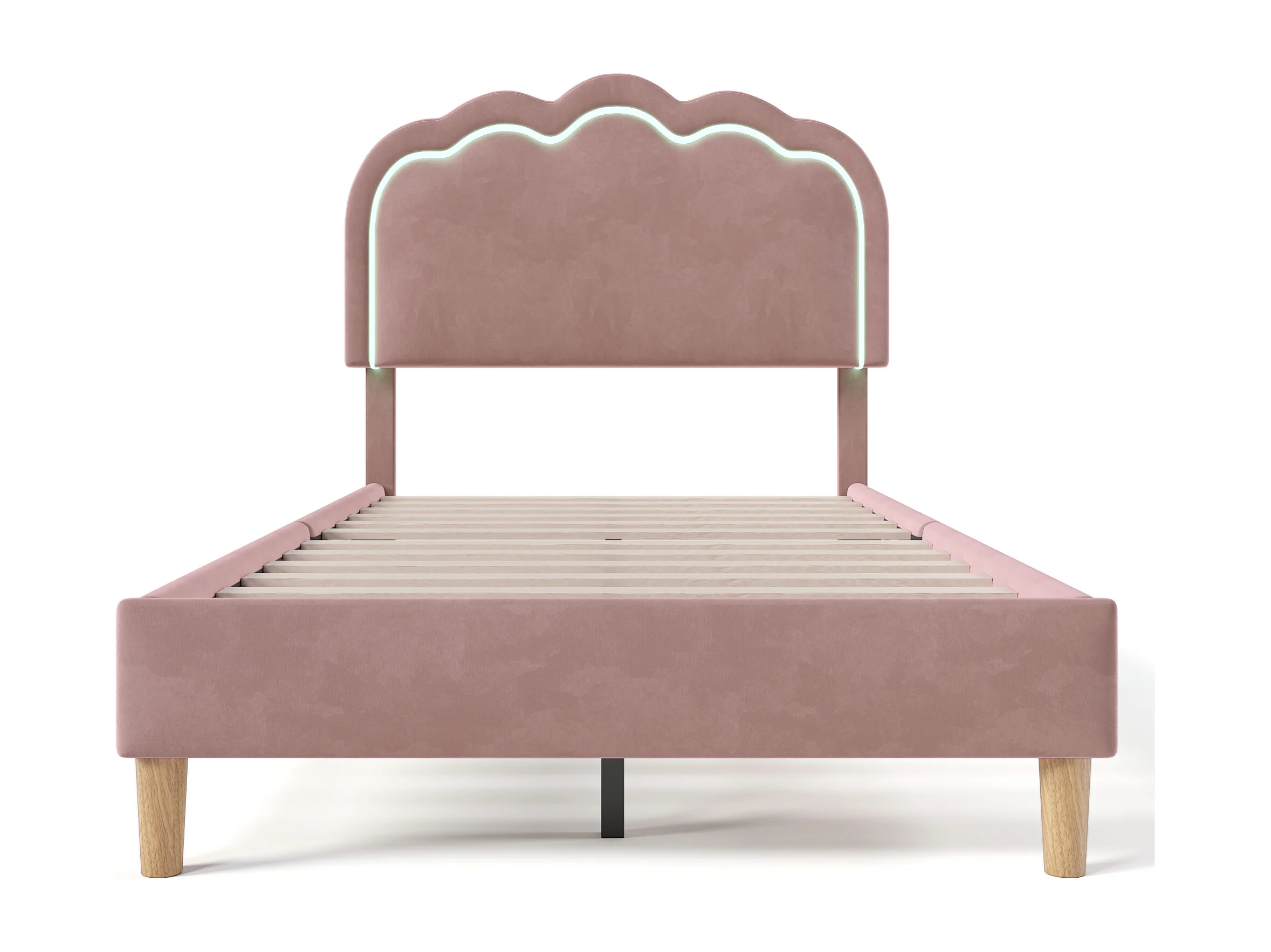 Haobosic - Lit Polster LED 90 x 200 cm avec Tête de Lit Ajustable, Structure de Lit en Velours Rose, Lit pour Chambre d'Adolescent(sans Matelas)