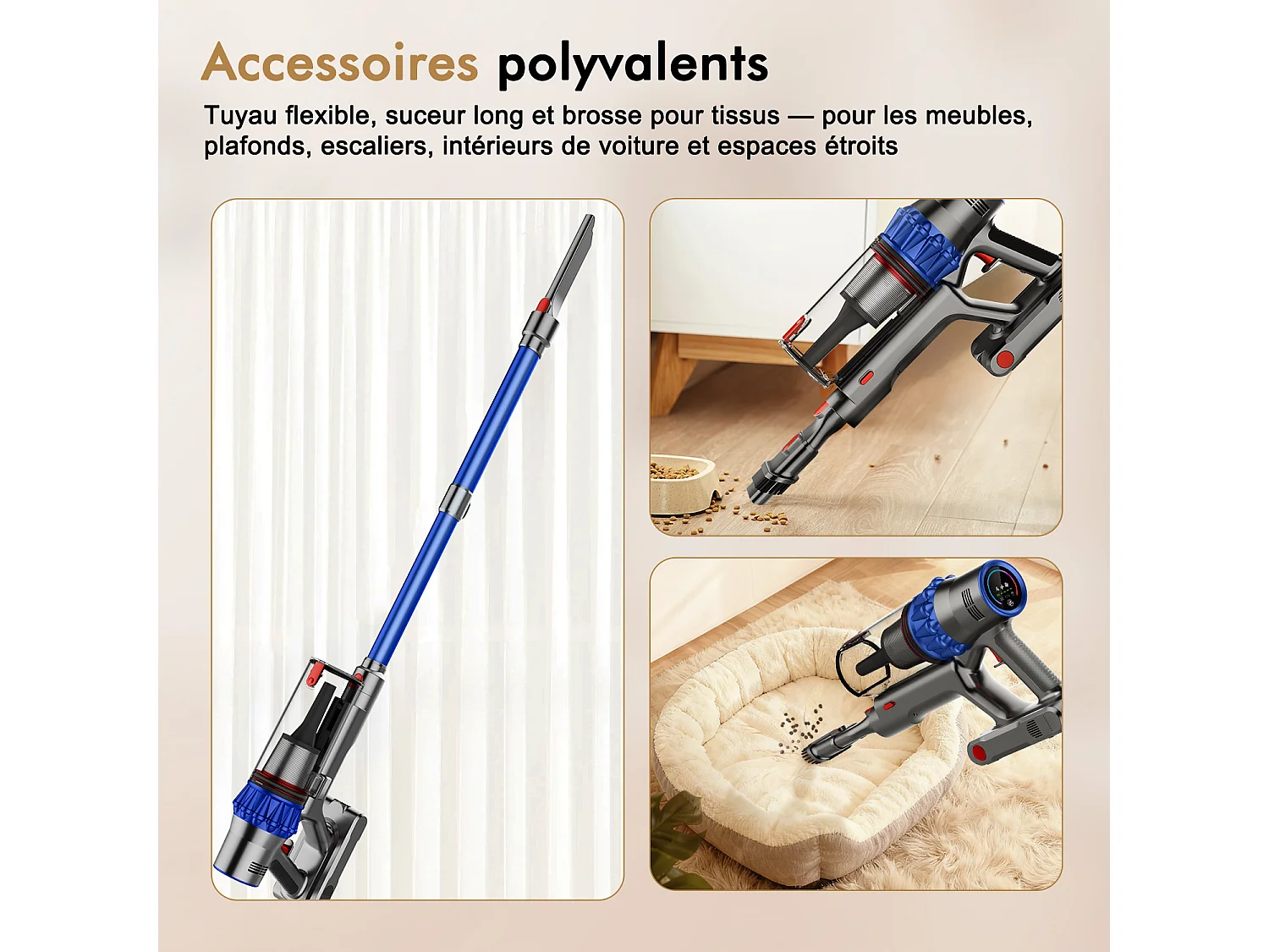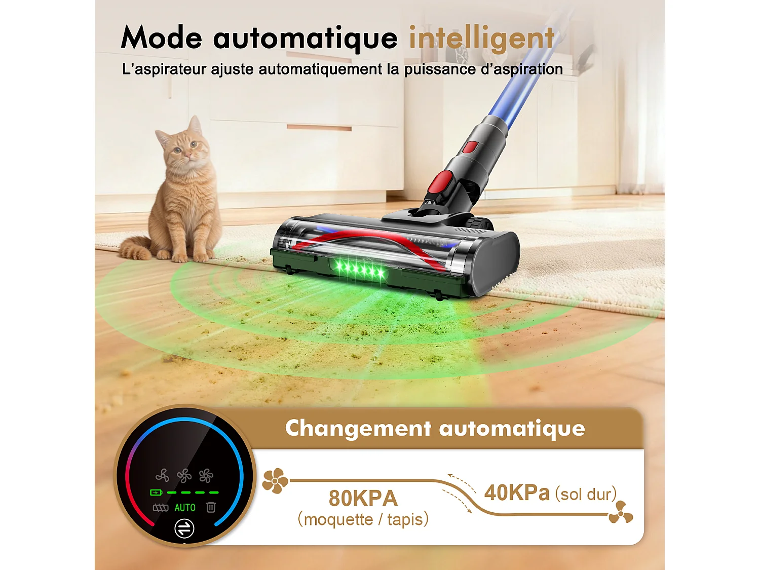 Hiazurm Aspirateur Balai Sans Fil - 80000 Pa - 3 Modes d’Aspiration - Affichage LED - 20-70 Min d’Autonomie - 1,8 L - Avec Brosse pour Meubles - 750W