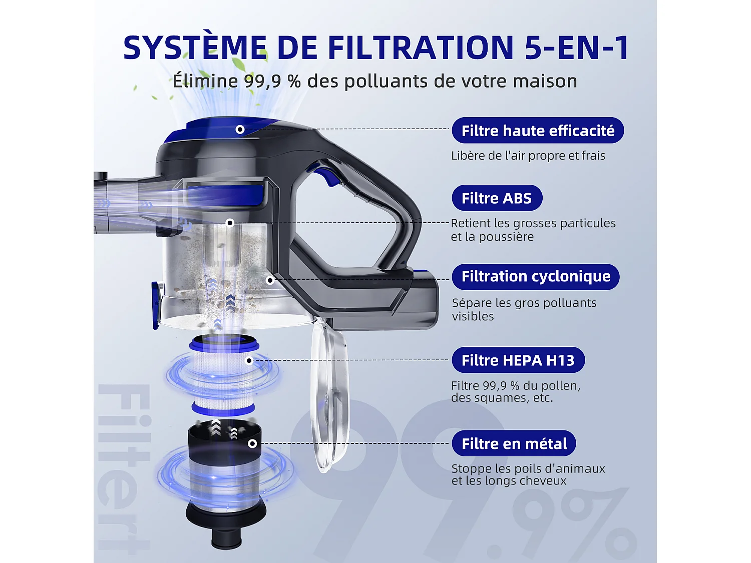 Aspirateur Balai sans fil, 50000Pa/500 W, Autonomie Jusqu'à 70 Min, 2200mAh, Grande Capacité de 1,8 L
