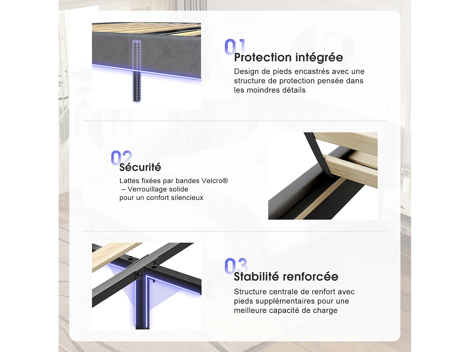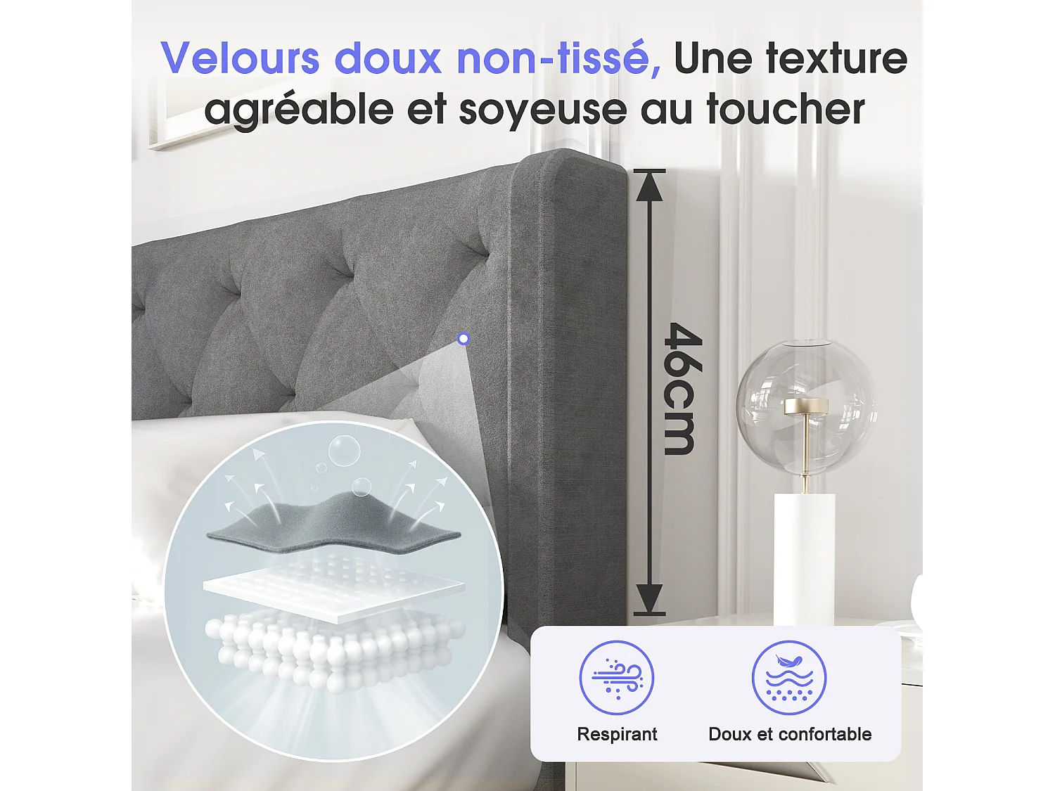 Hiazurm Lit - Lit Double 140x200 cm - Avec Tête de Lit en Velours de Luxe - Cadre en Acier Renforcé - Sommier à Lattes en Bois Massif