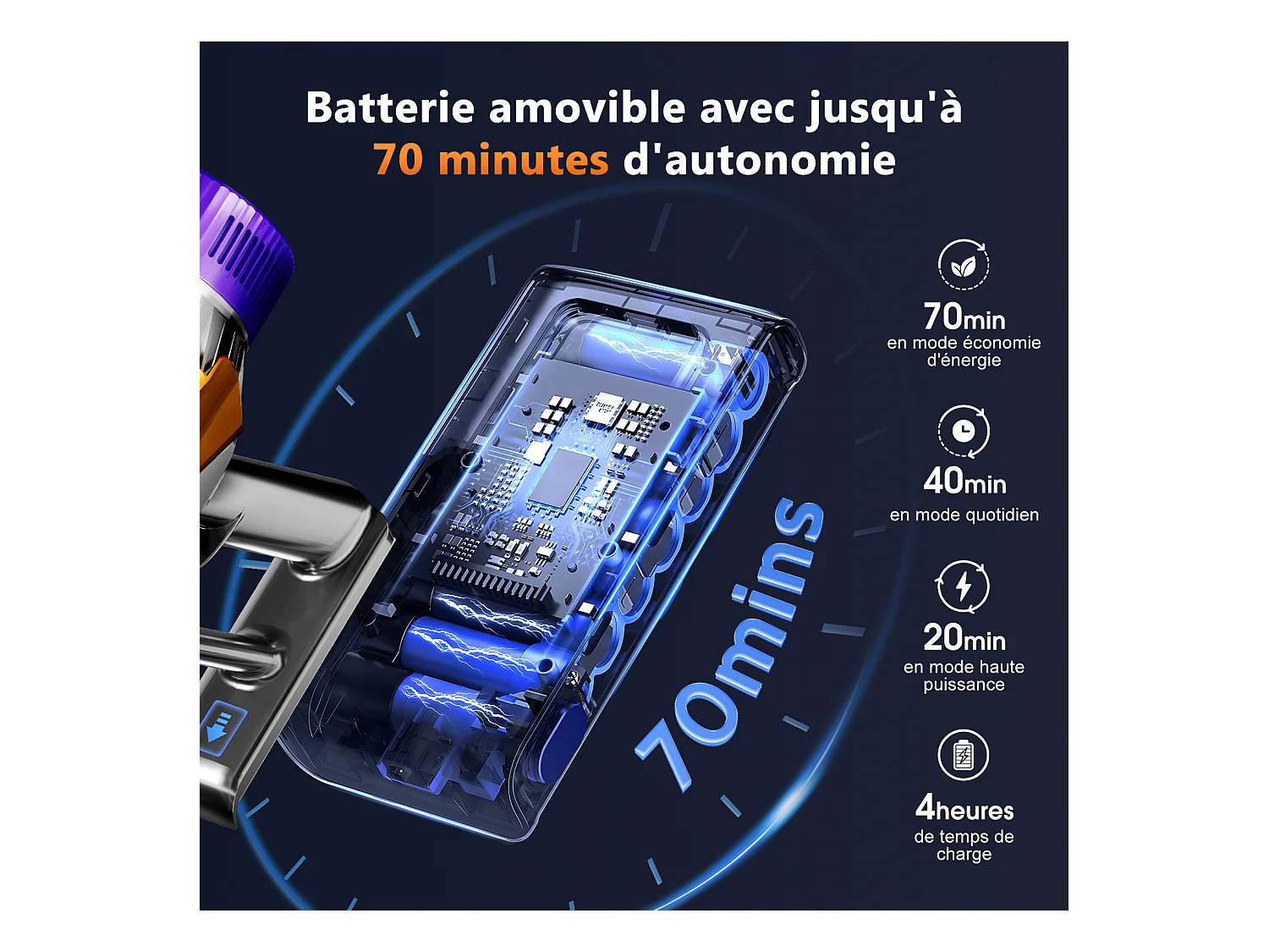 Hiazurm Aspirateur Sans Fil - 65000Pa Aspirateur - 3 Niveaux de Puissance d'Aspiration - Écran LED - 20-70 Min d'Autonomie - 1,8L - 550W - Violet