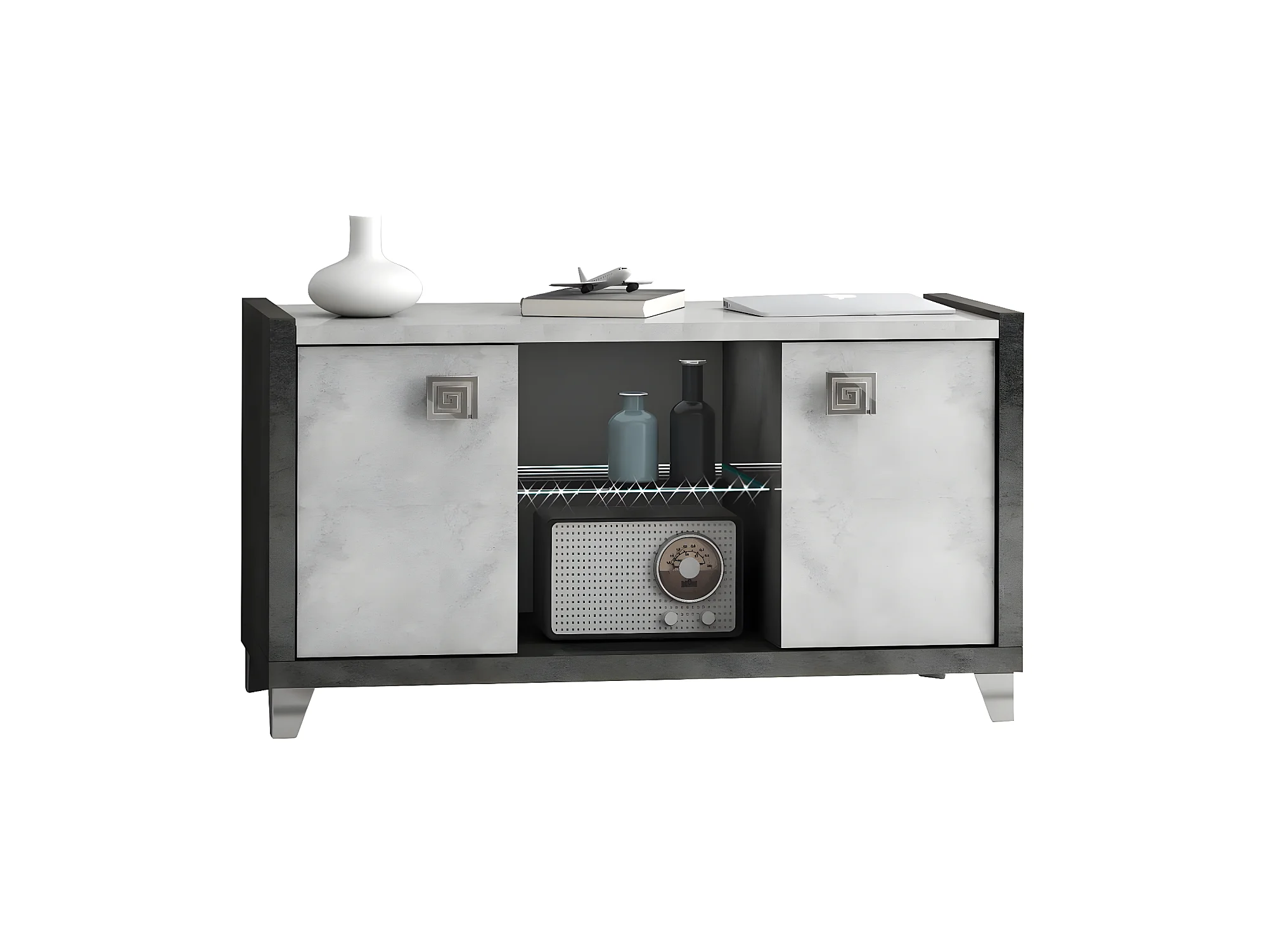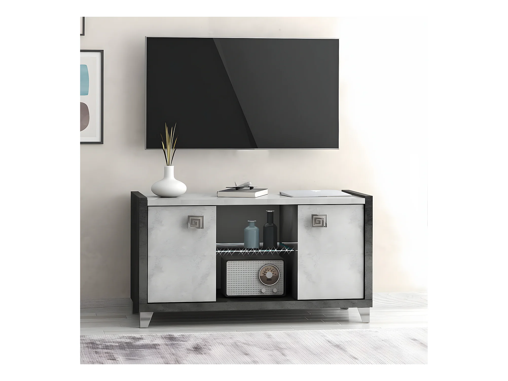 HOFFMAN - Meuble TV 2 Portes 105cm Gris Aspect Pierre avec Led