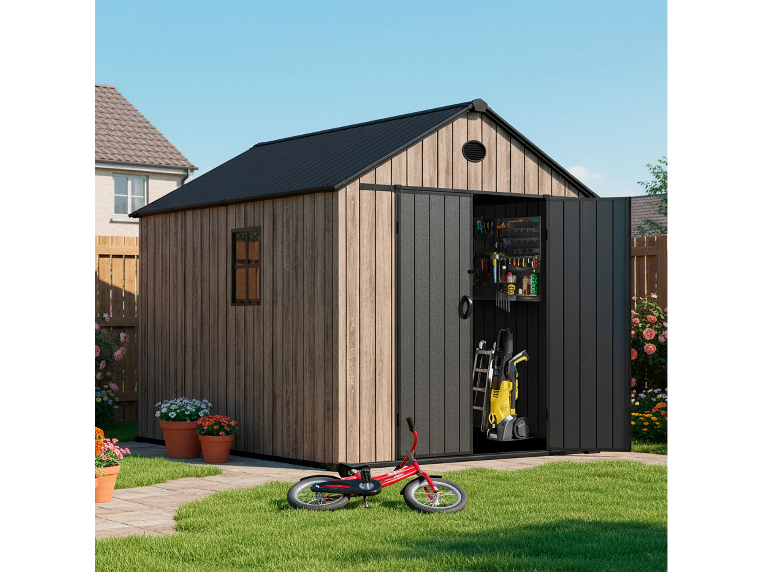 Hoggar – Abri de jardin en résine 6,41 m² Oak O60 – Sol – Fenêtre – Effet bois premium – Double porte large – Protection UV et imperméable – Fermeture avec loquet