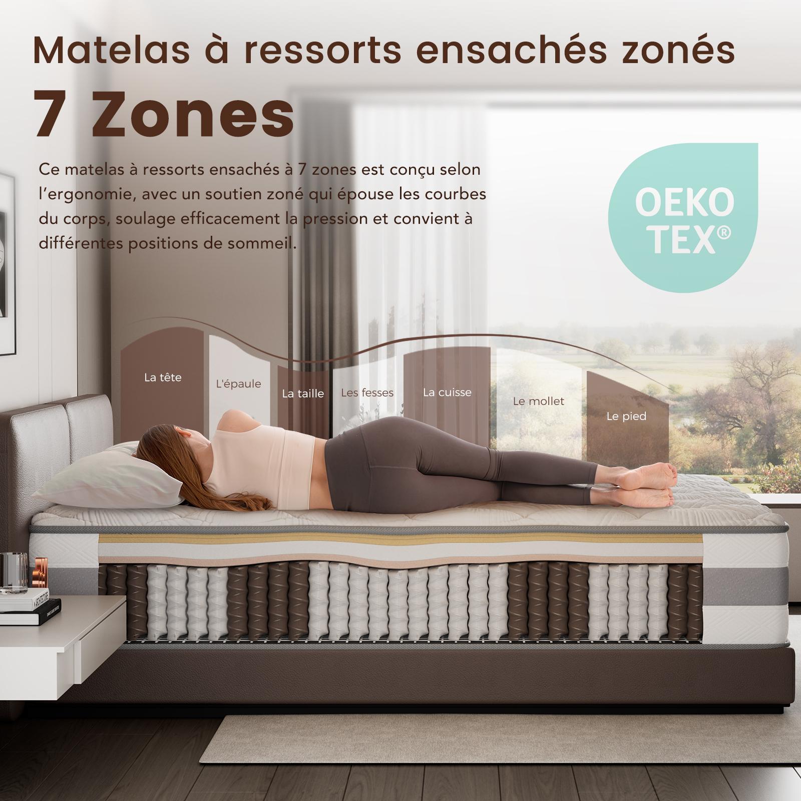 Matelas 90 x 190 cm ressorts ensachés 7 zones, soutien ferme H3, mousse confort ép. 25 cm - HOMAVO