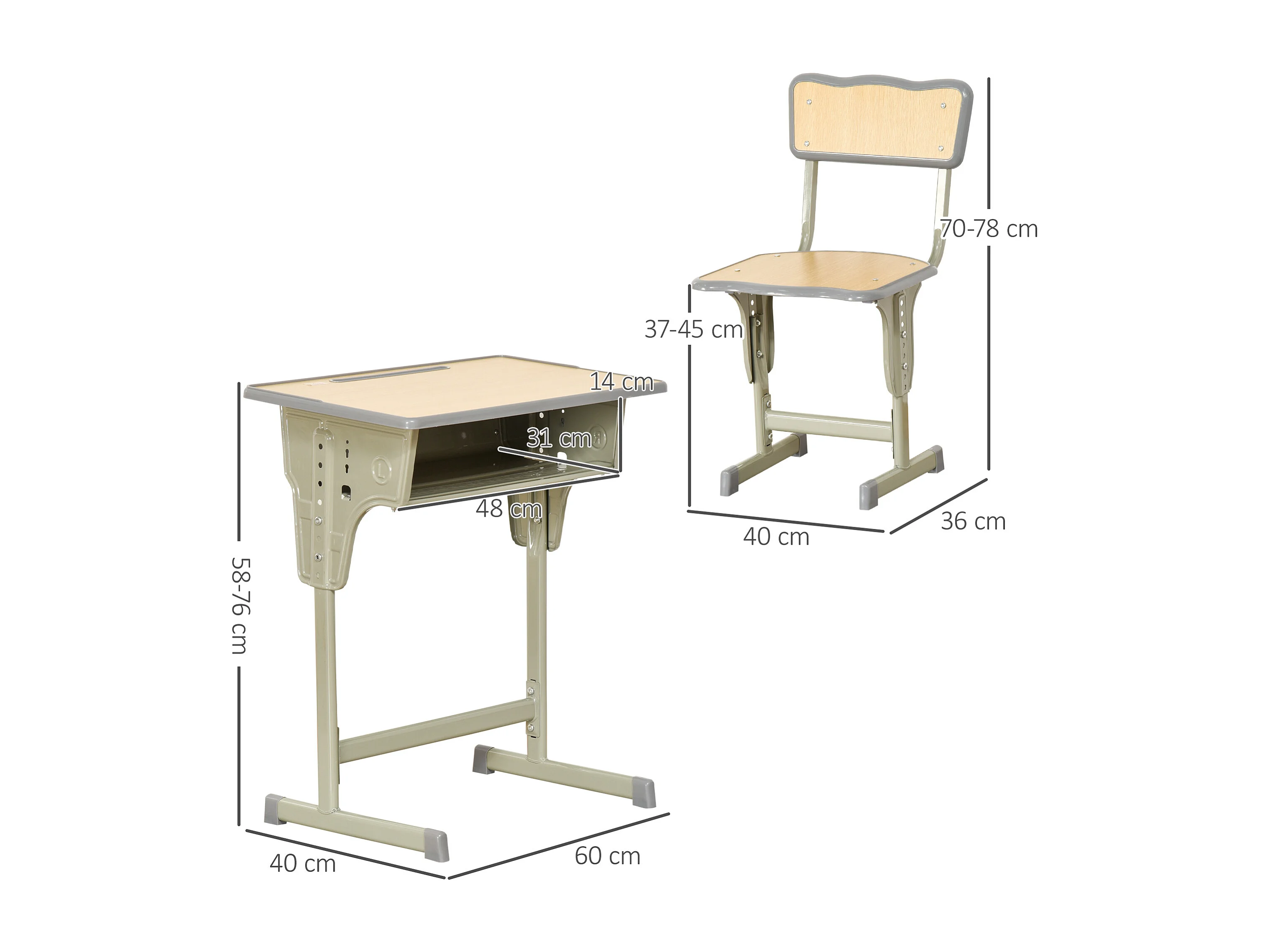 HOMCOM Bureau enfant Vintage style pupitre d'écolier - ensemble bureau et chaise réglable - case de rangement, bracket, range-stylos - acier kaki MDF aspect bois clair