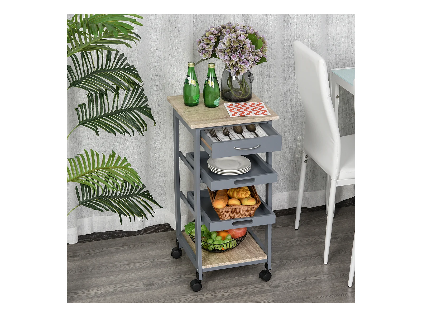 Chariot de service desserte de cuisine à roulettes panier + 2 plateaux amovibles, tiroir, étagère MDF chêne clair bois pin gris