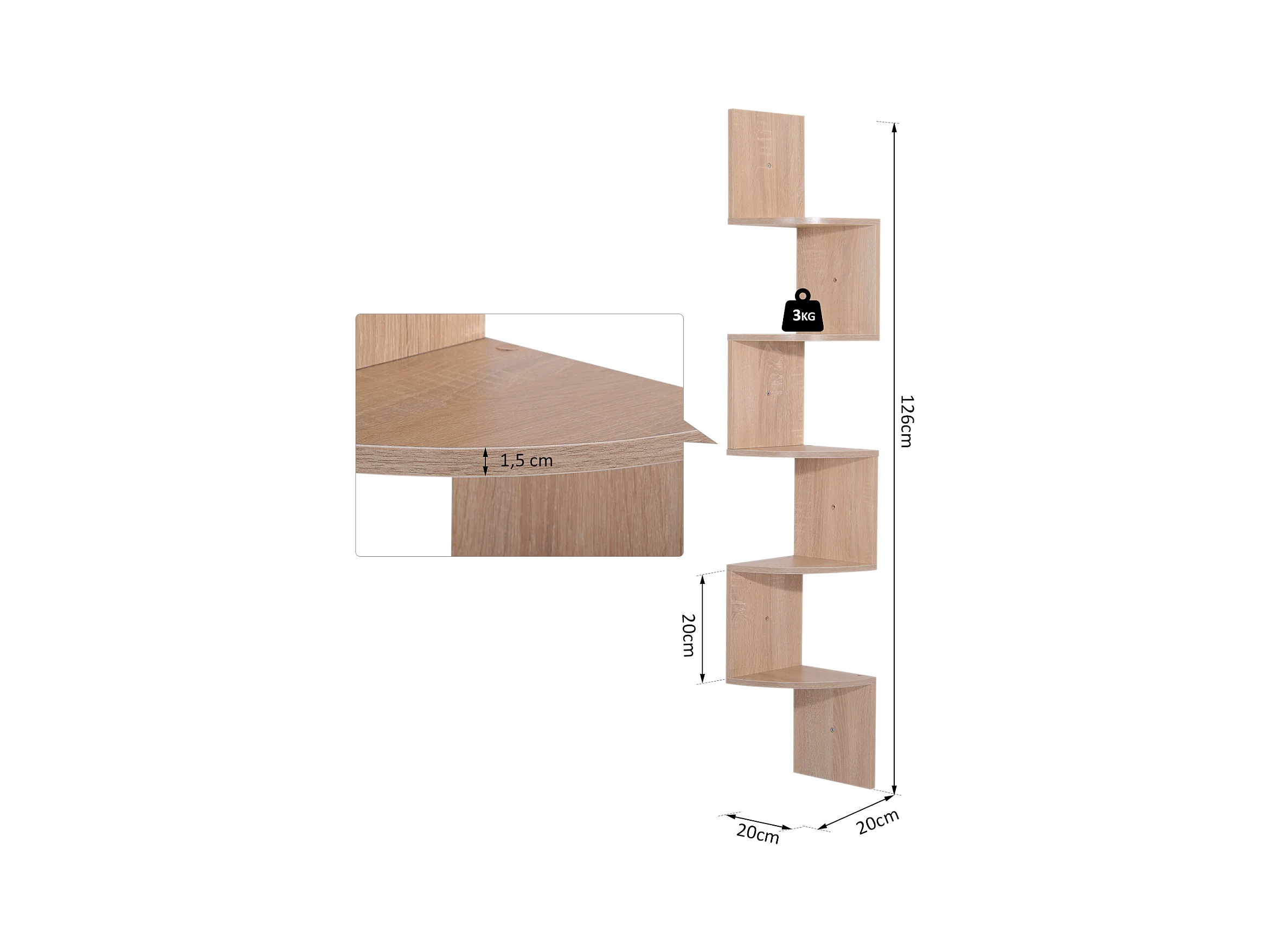 Étagère d'angle étagère de rangement design contemporain zig zag 20L x 20l x 126H cm 5 niveaux panneaux de particules chêne clair