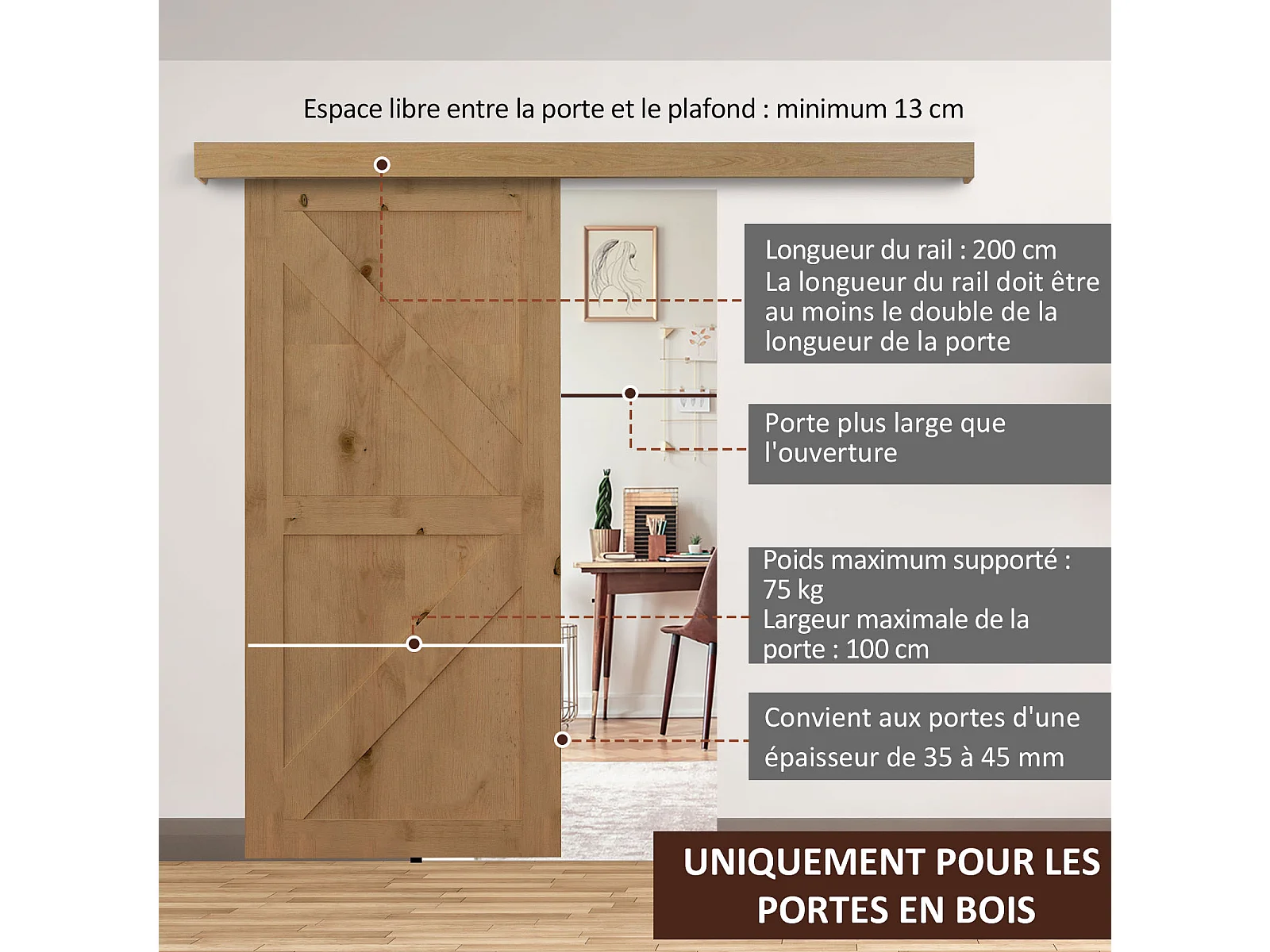 Kit de porte coulissante système galandage pour porte épaisseur 35-45 mm longueur rail 2 m charge max. 90 Kg aluminium coffrage MDF inclus