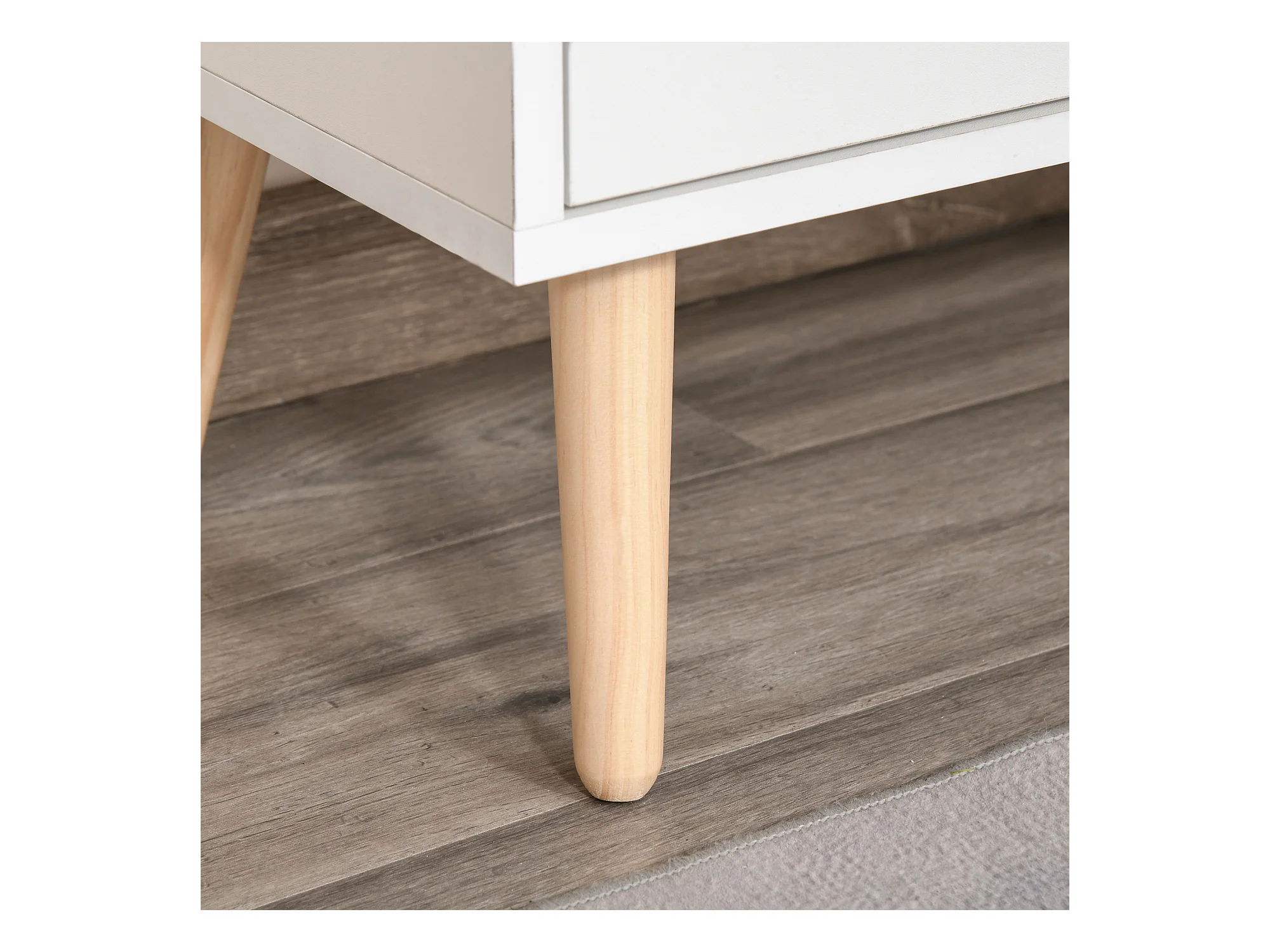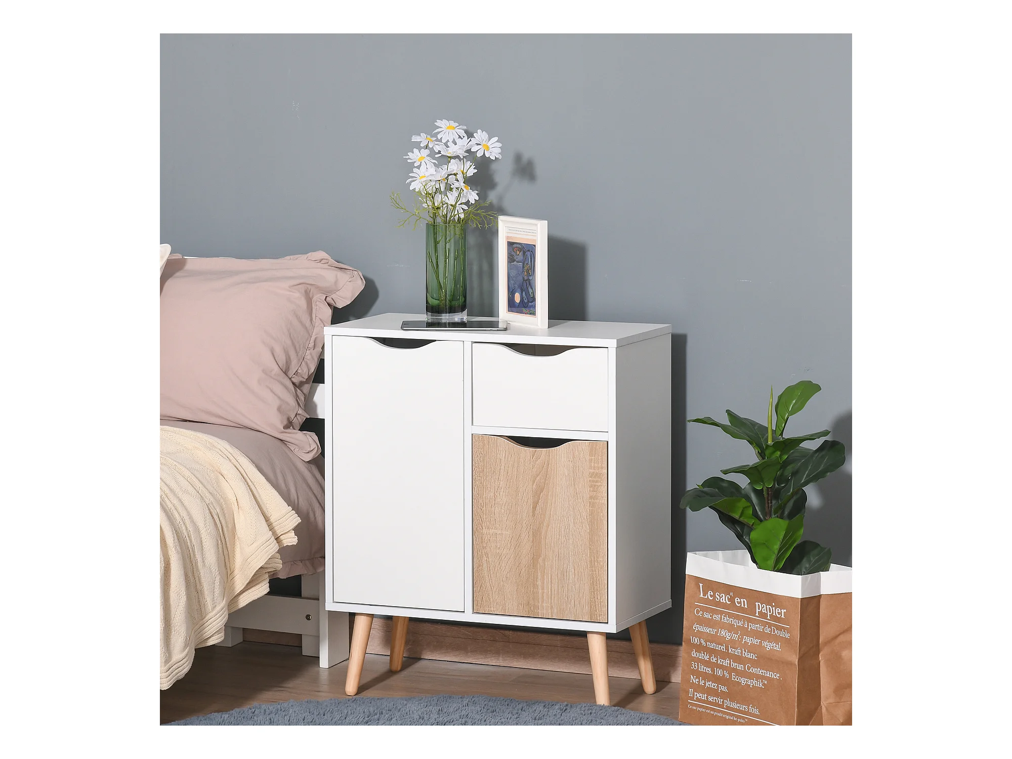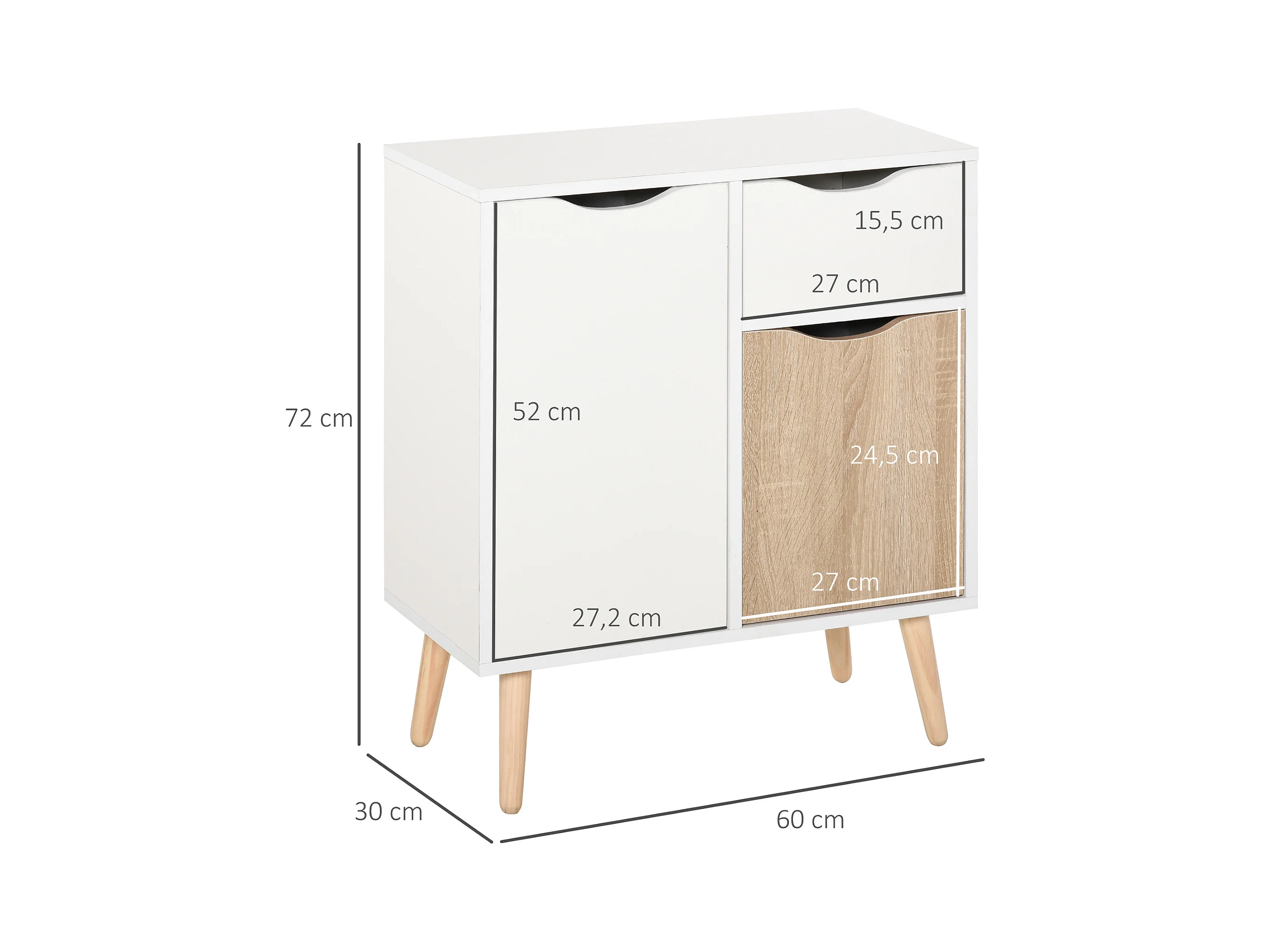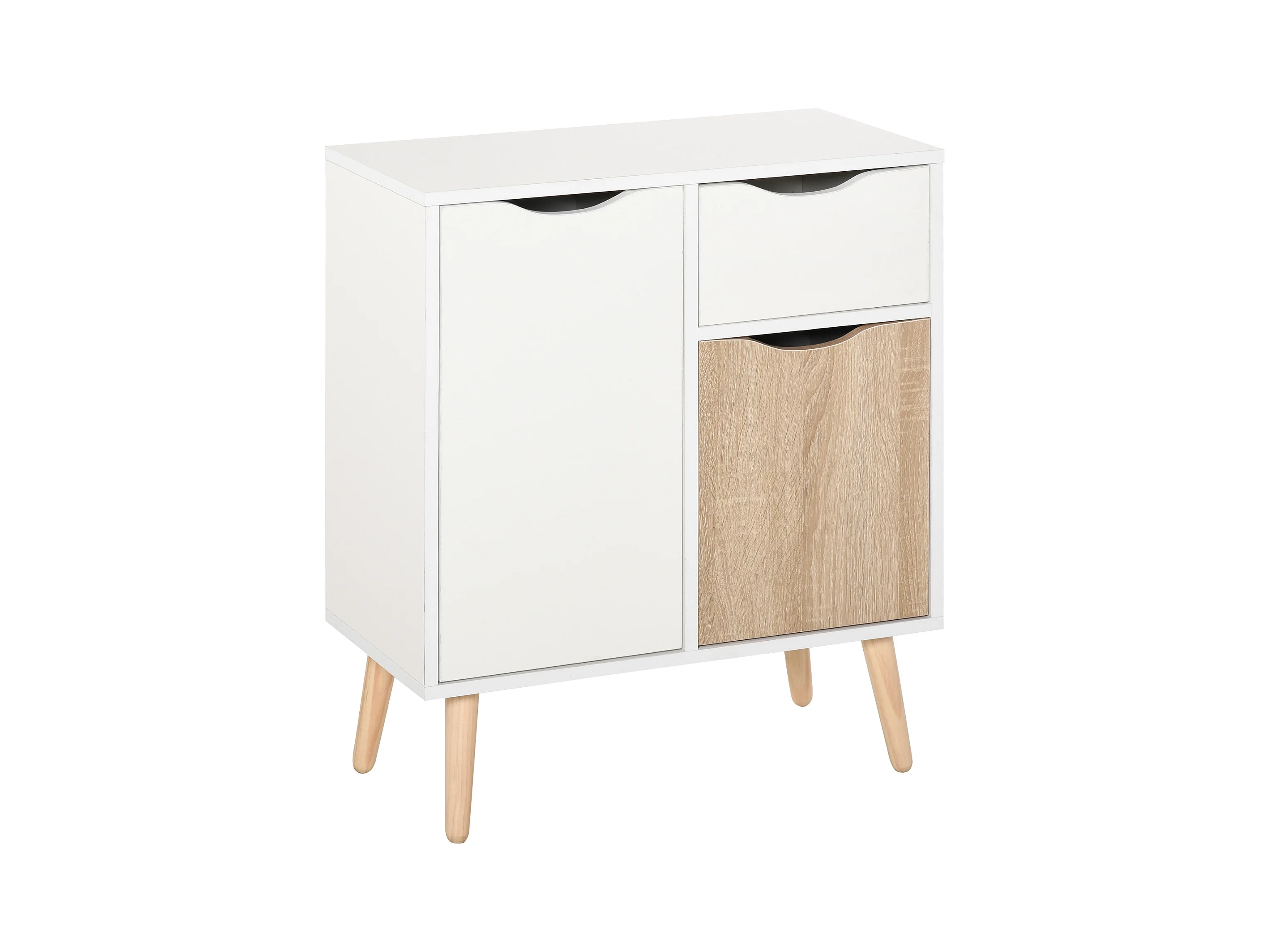 HOMCOM Meuble de rangement design scandinave 2 placards tiroir coulissant pieds bois massif pin panneaux particules blanc chêne clair