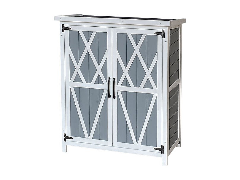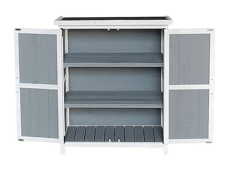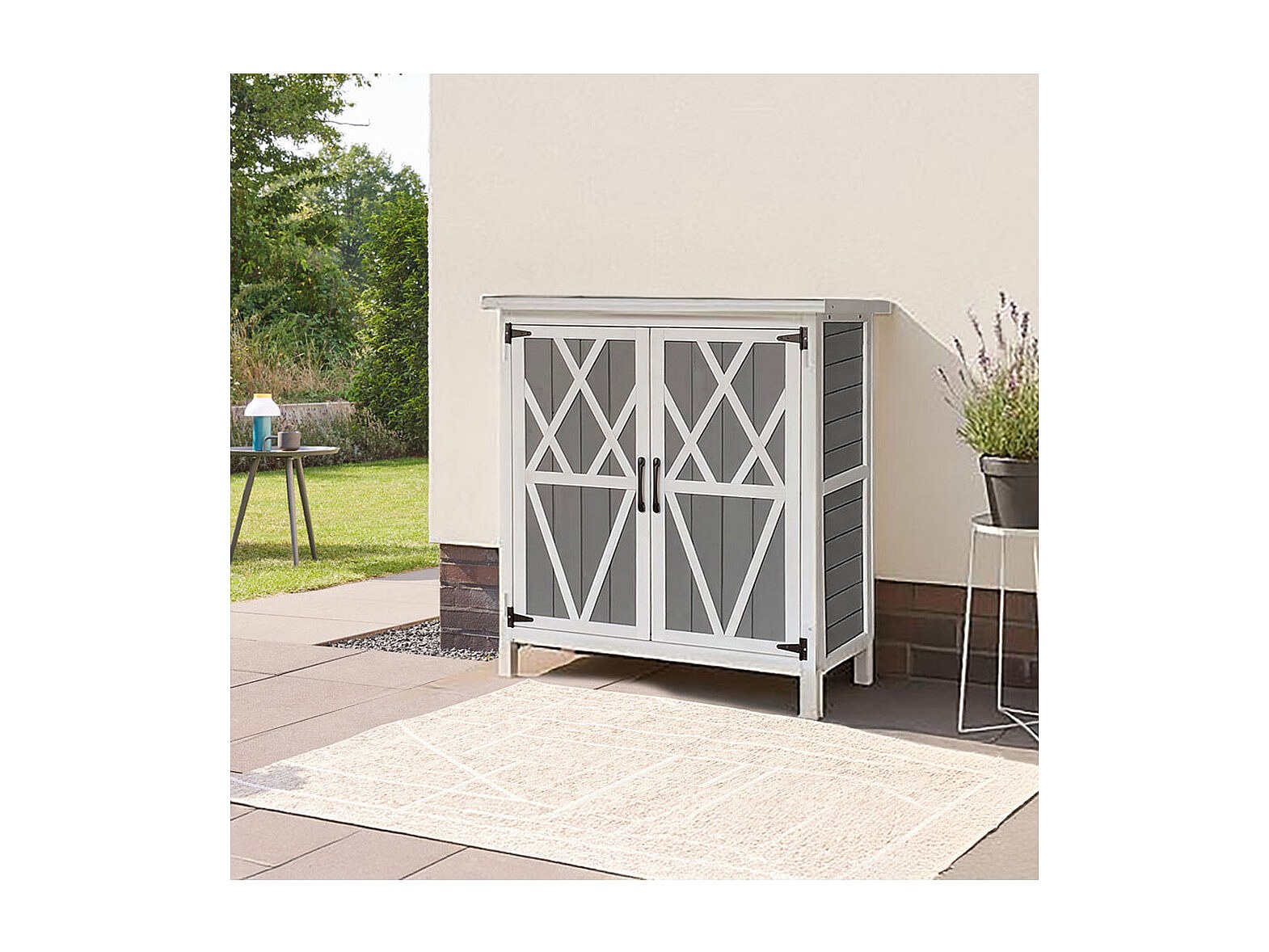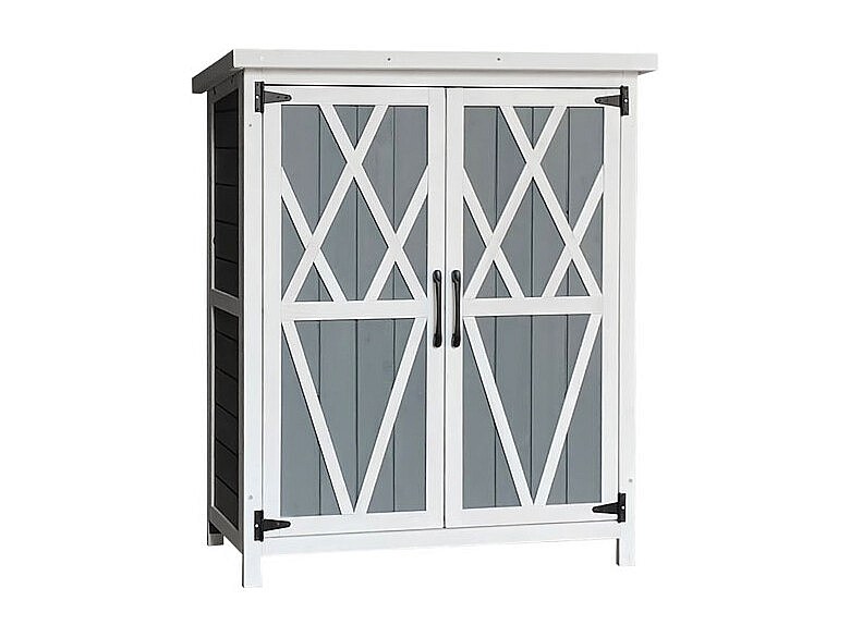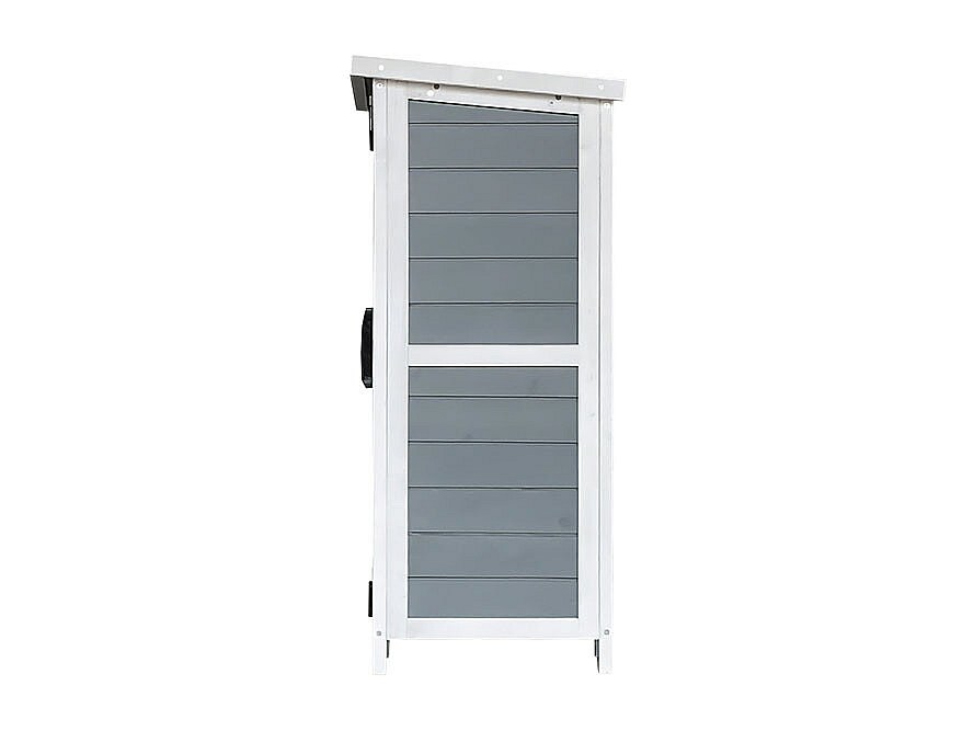 Armoire abri de jardin remise pour outils - grande porte verrouillable loquet - 2 étagères - toit bitumé incliné bois de sapin blanc gris
