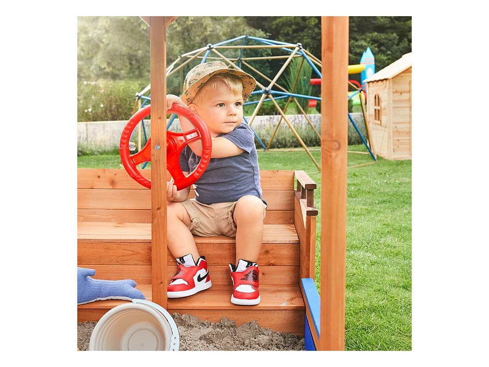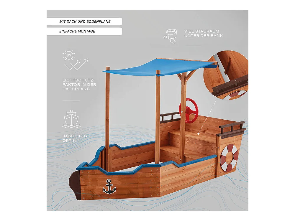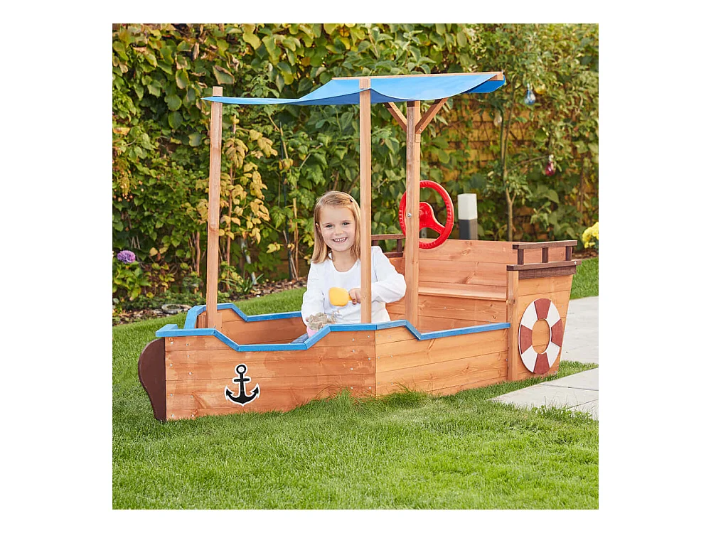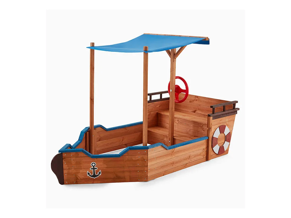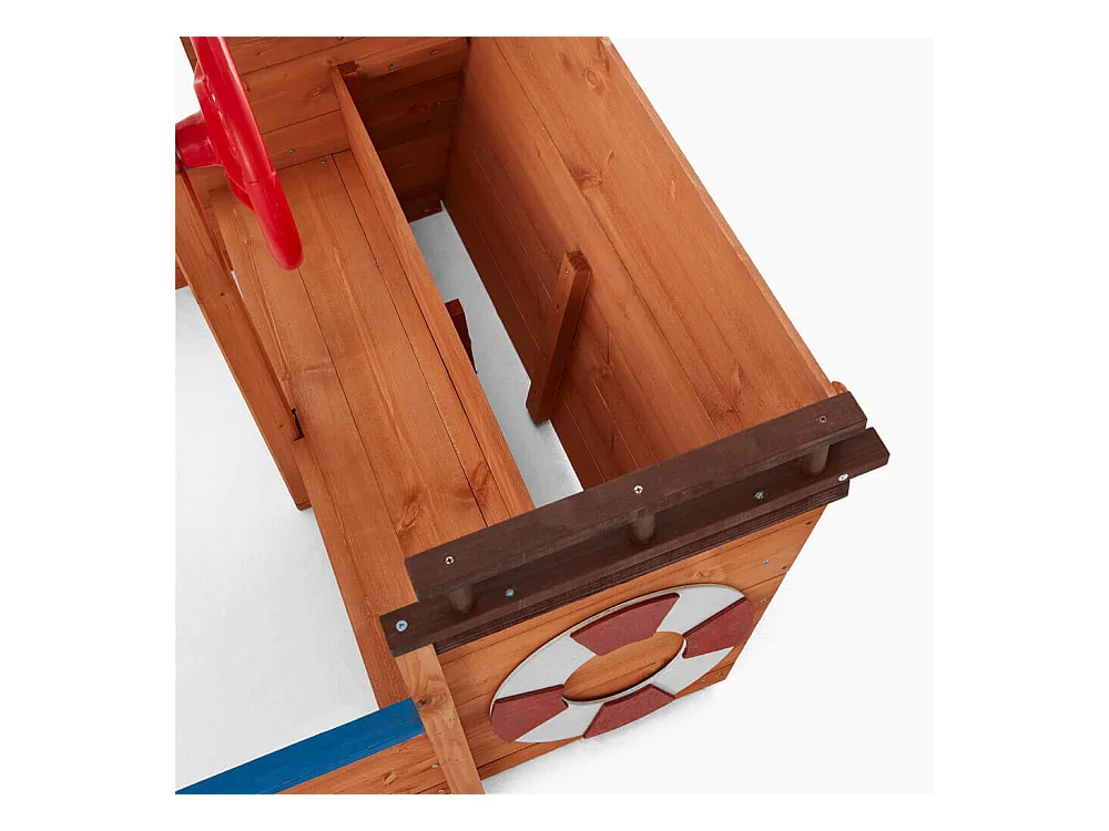 Bac à sable bateau de pirate - banc, coffre rangement, gouvernail, drapeau, bâche - bois sapin pré-huilé