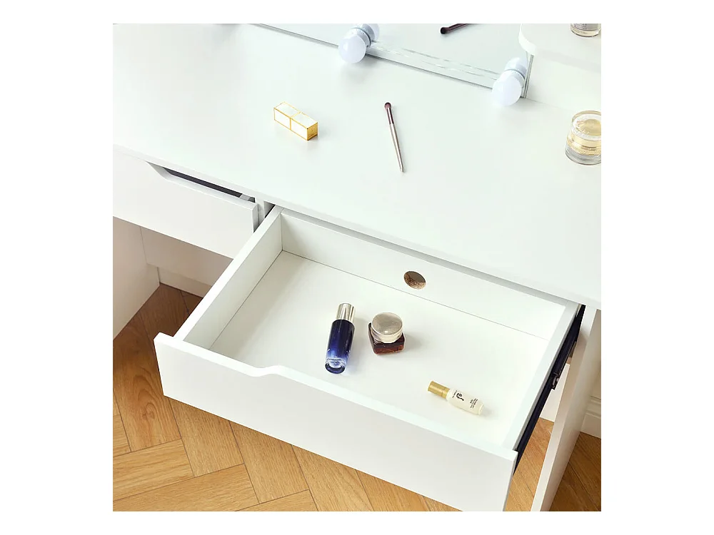 Coiffeuse avec miroir et éclairage LED - 2 tiroirs et une armoire amovible - Blanc (tabouret non inclus)