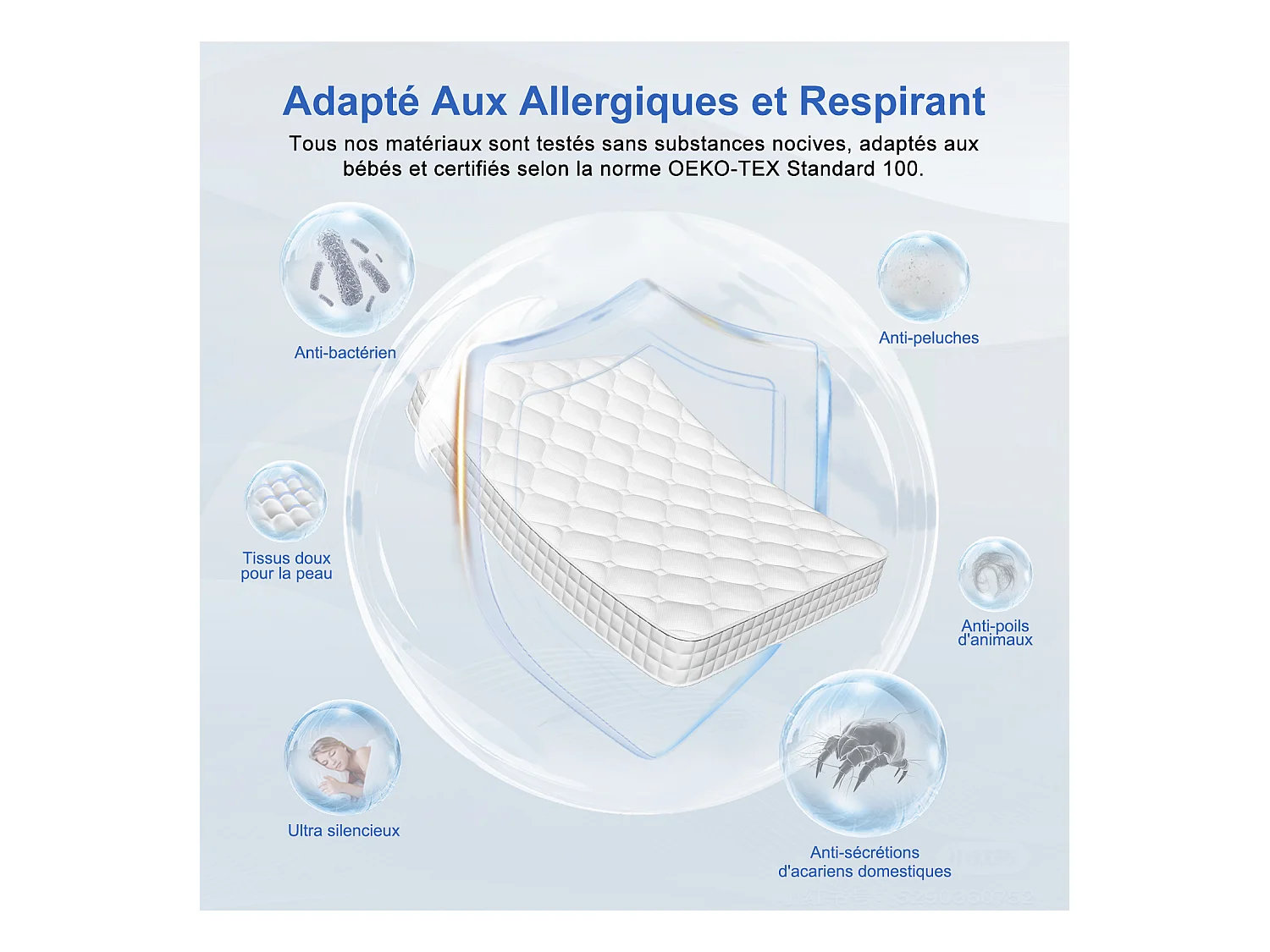 Matelas ressorts 90x190x22cm, multiples tailles, ergonomique 7 zones, avec housse, mousse mémoire, anti-acariens et antibactérien