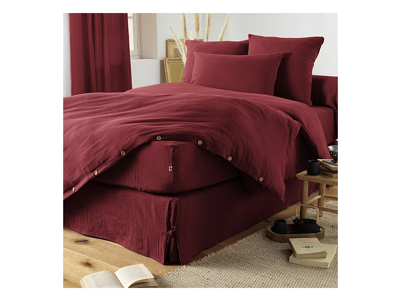 Taie d'oreiller brodée double gaze de coton bordeaux 50x70 cm