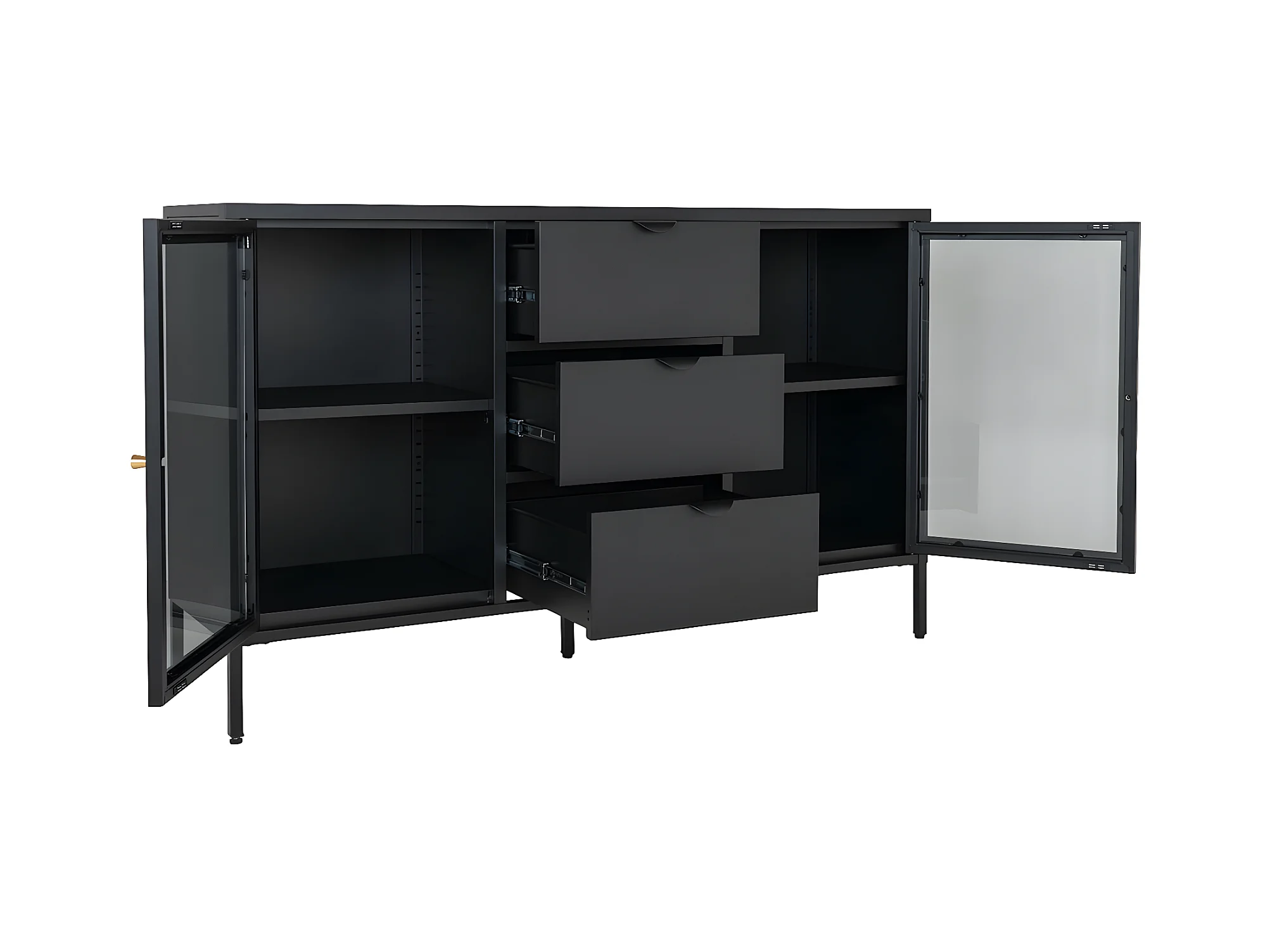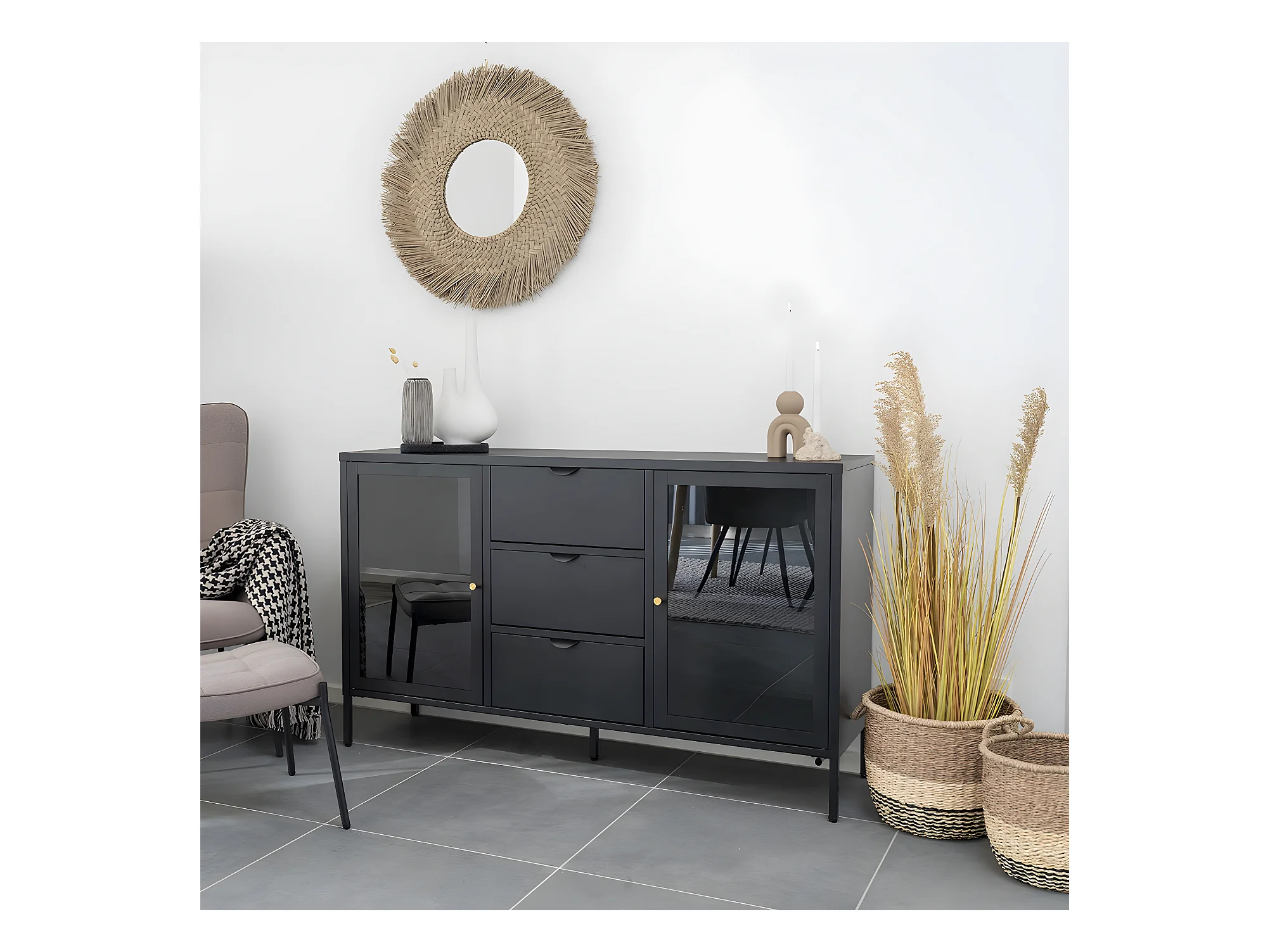 HUGO - Buffet 2 Portes Vitrées 3 Tiroirs en Métal Laqué Noir