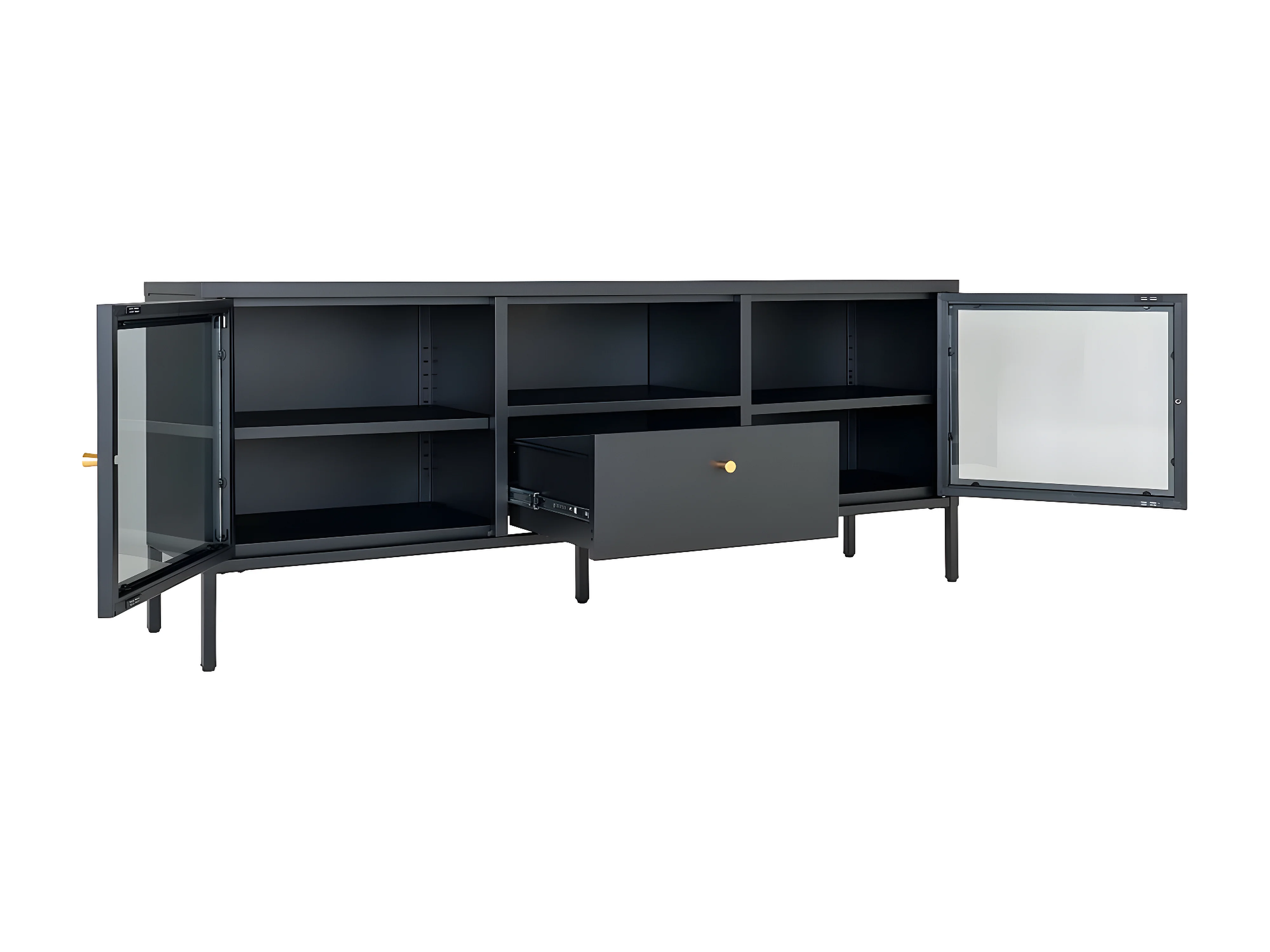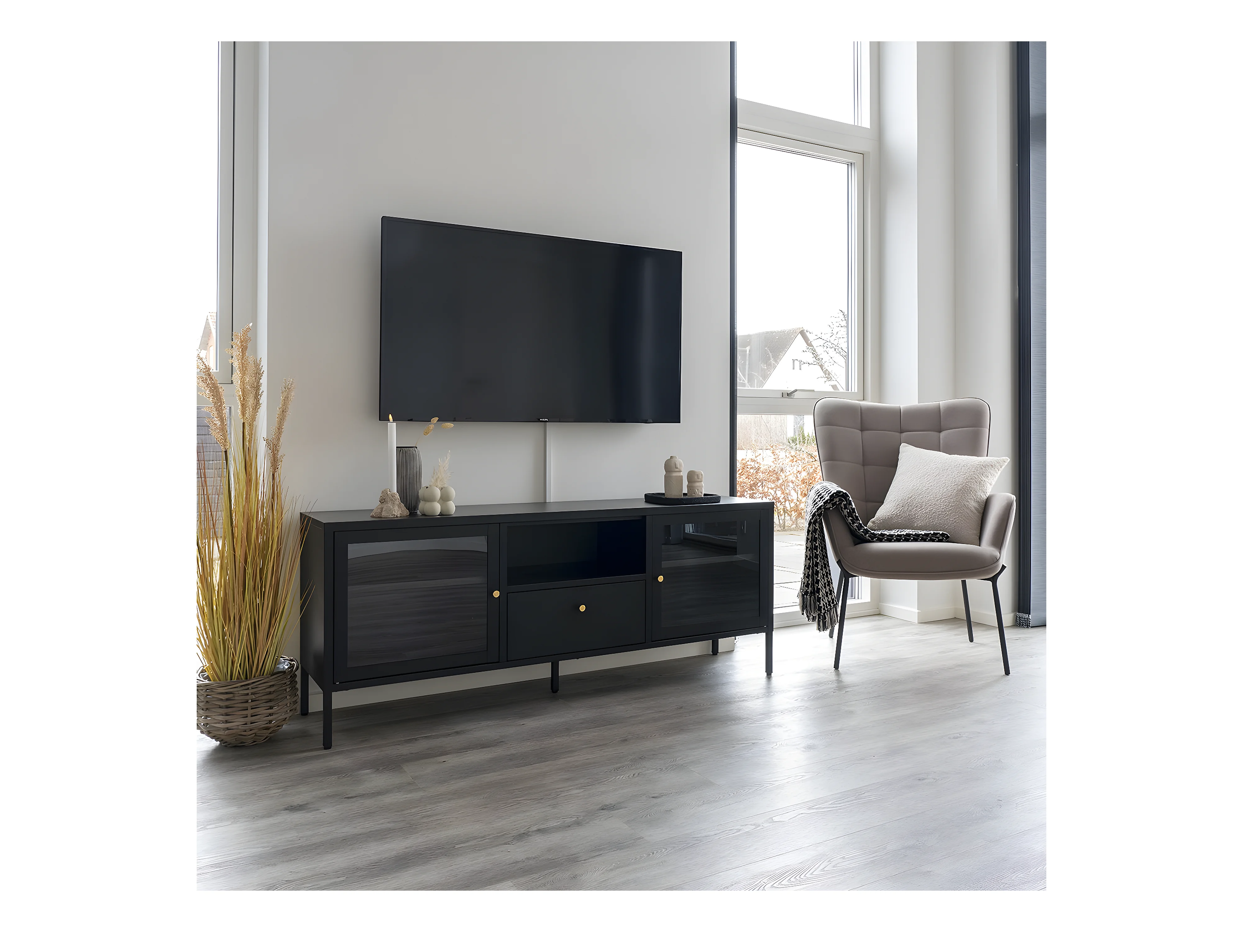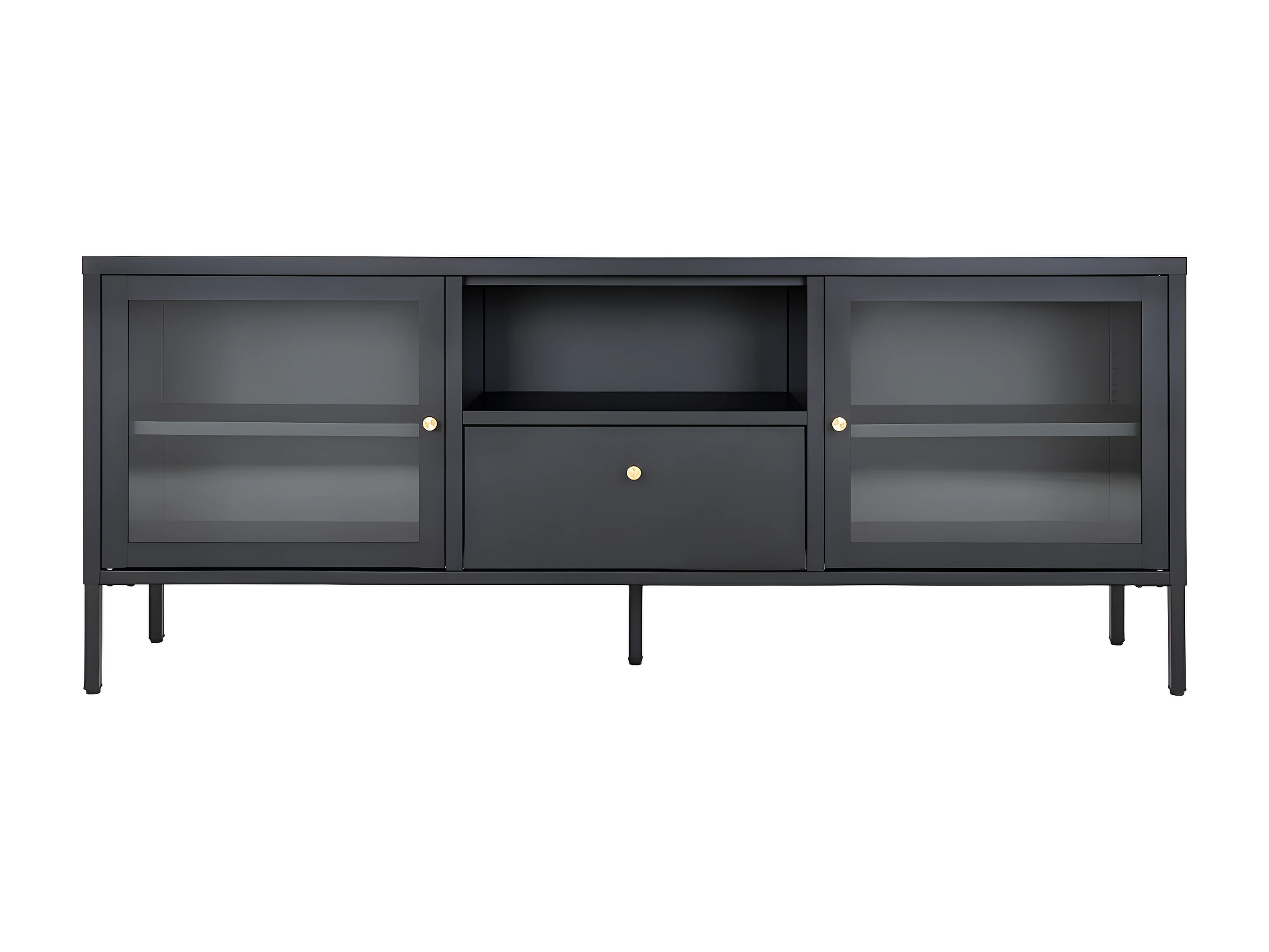 HUGO - Meuble TV 2 Portes Vitrées 1 Tiroir 1 Niche en Métal Laqué Noir