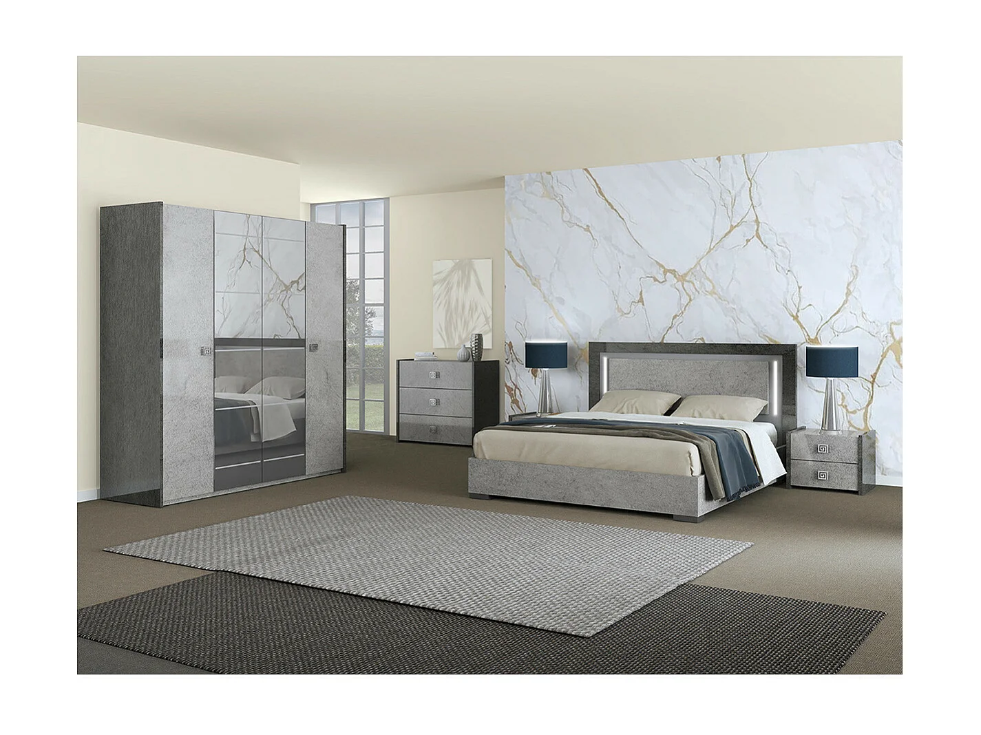 HYDE - Armoire 4 Portes avec Miroir Gris Effet Pierre