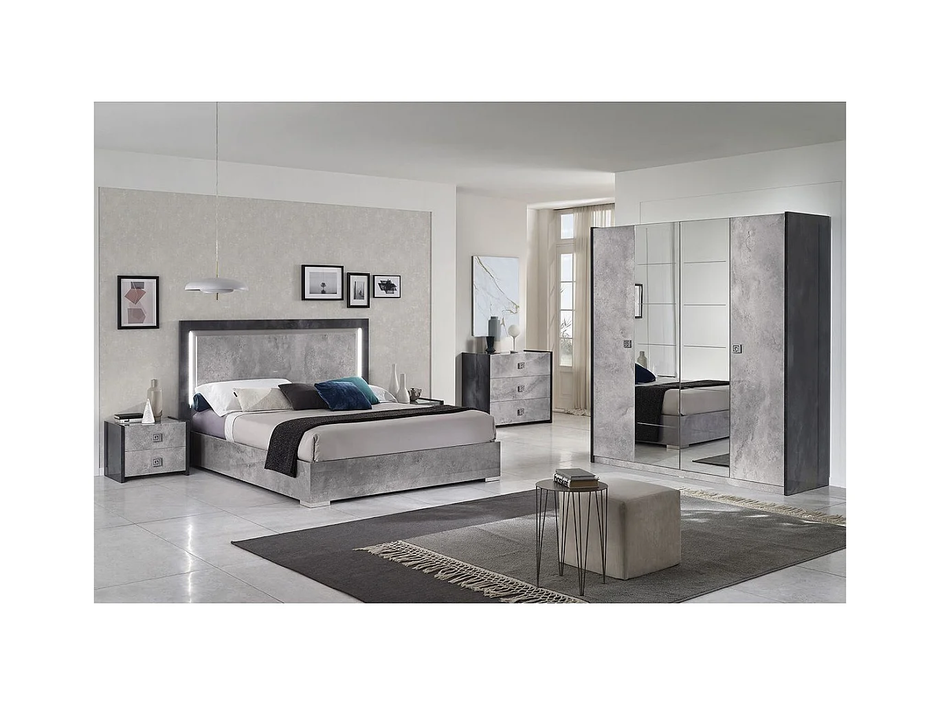 HYDE - Chambre Complète 160x200cm Gris Effet Pierre avec Leds