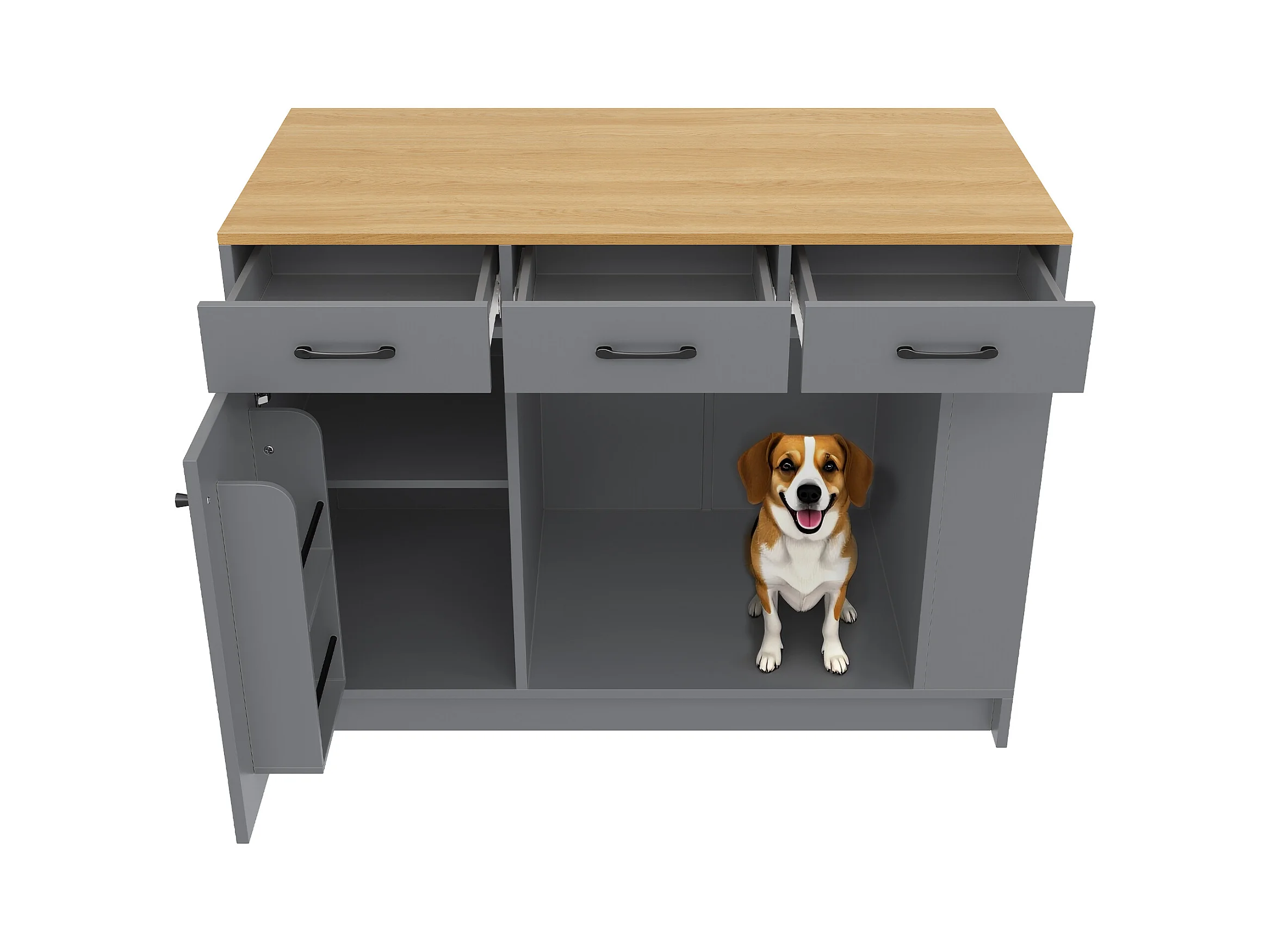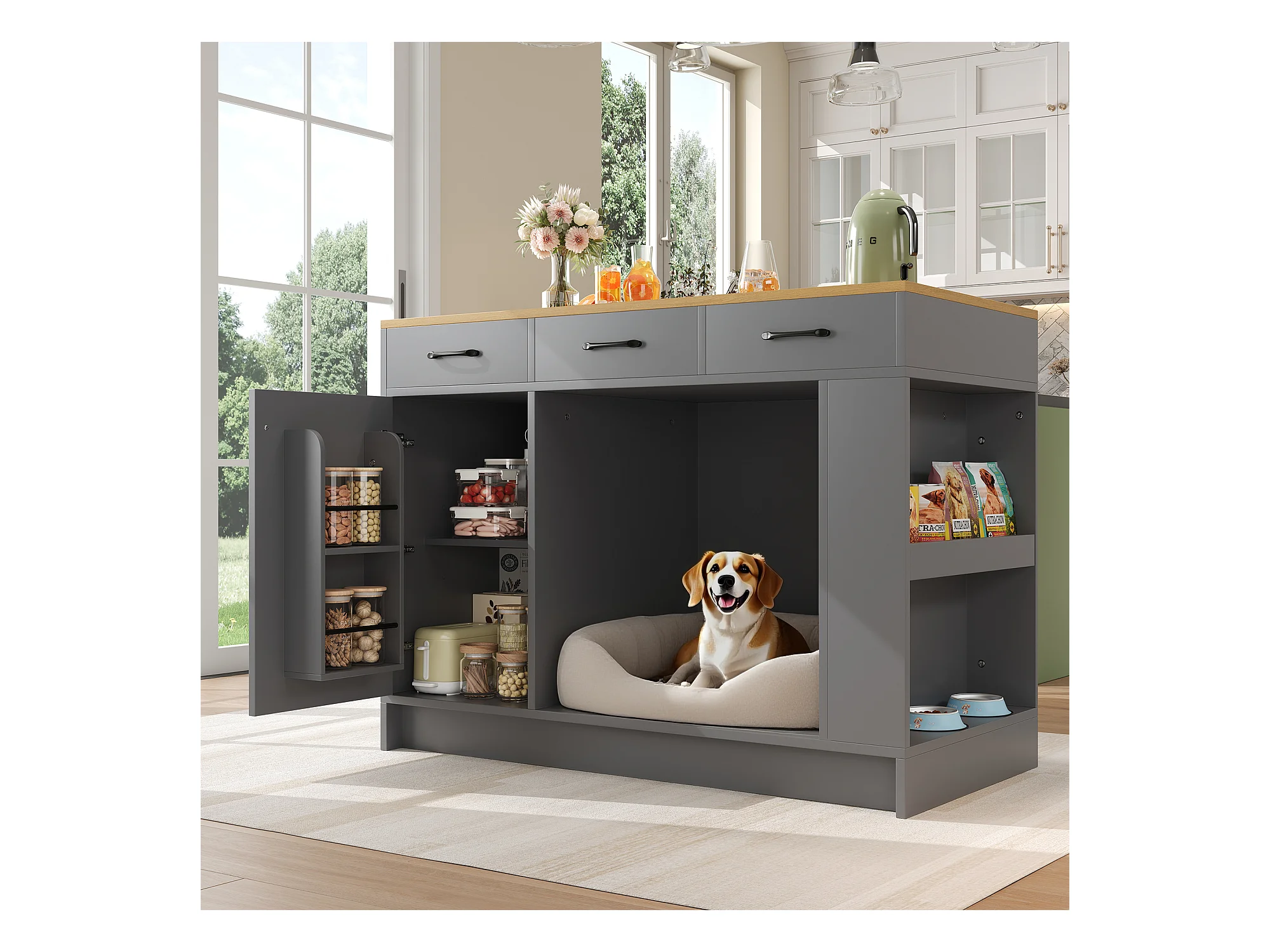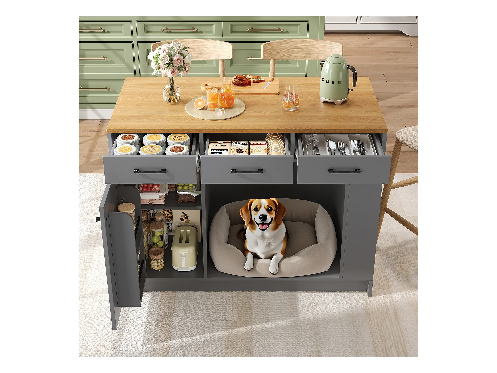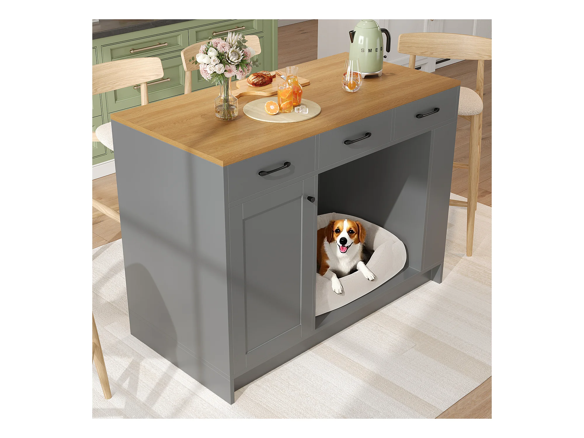 îlot central de cuisine 120x60x90 cm - avec 3 tiroirs et 1 porte - étagères ouvertes - espace de repos pour animaux - gris+naturel