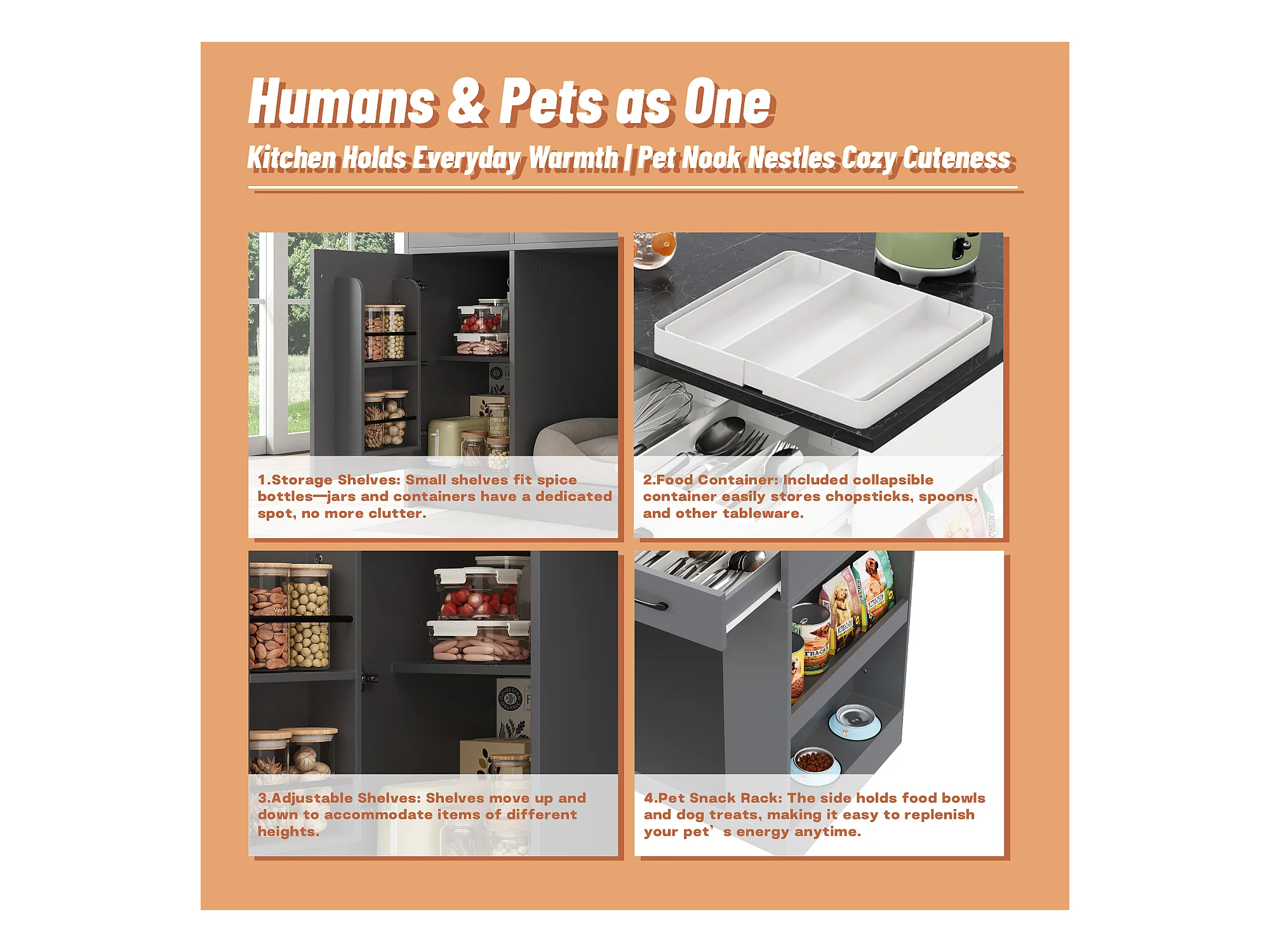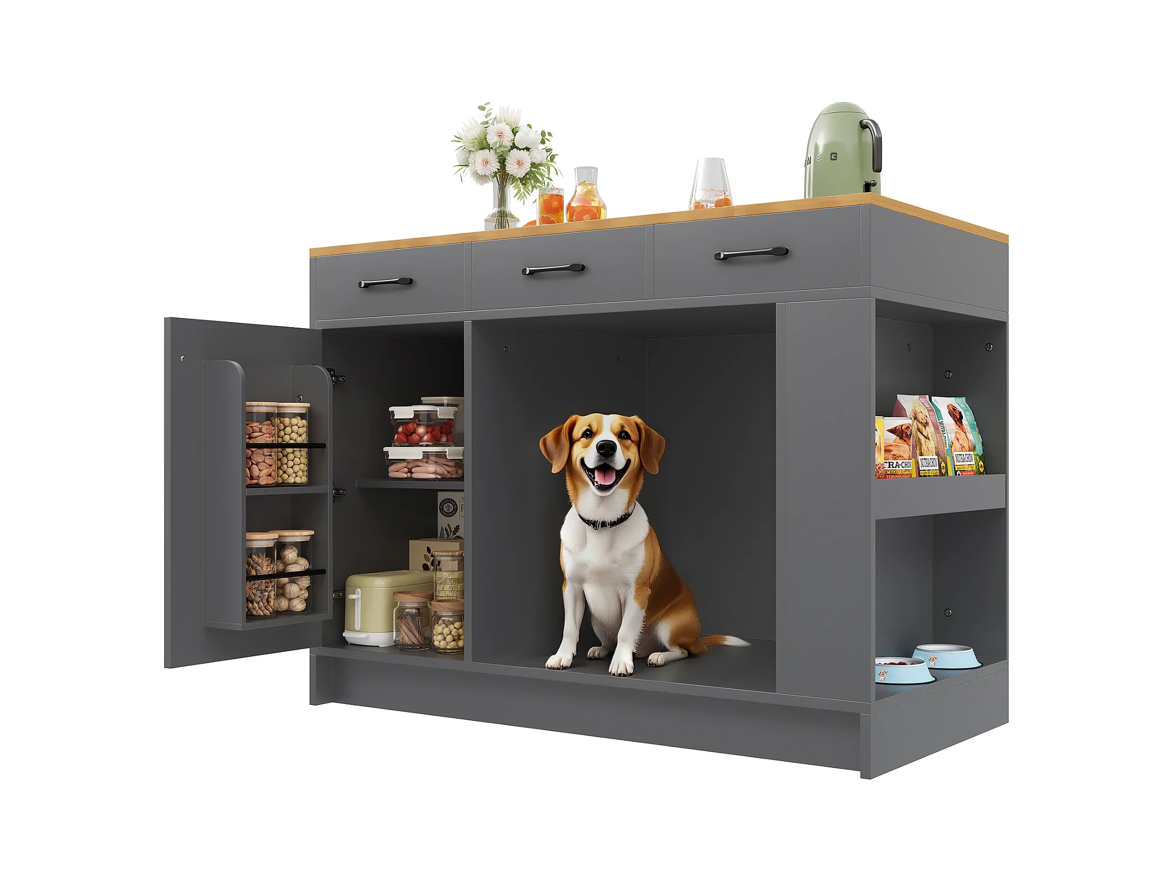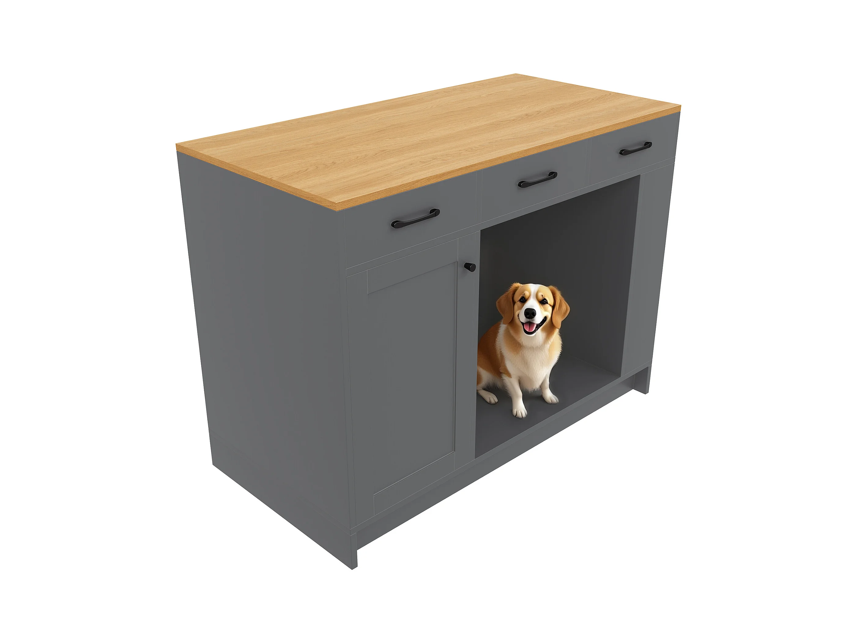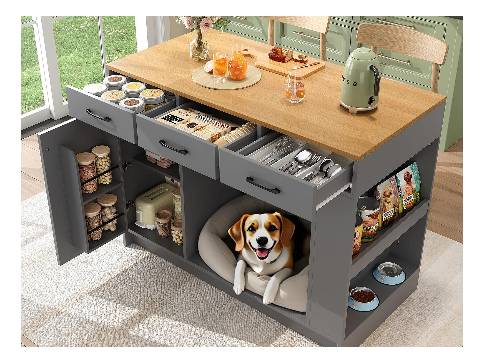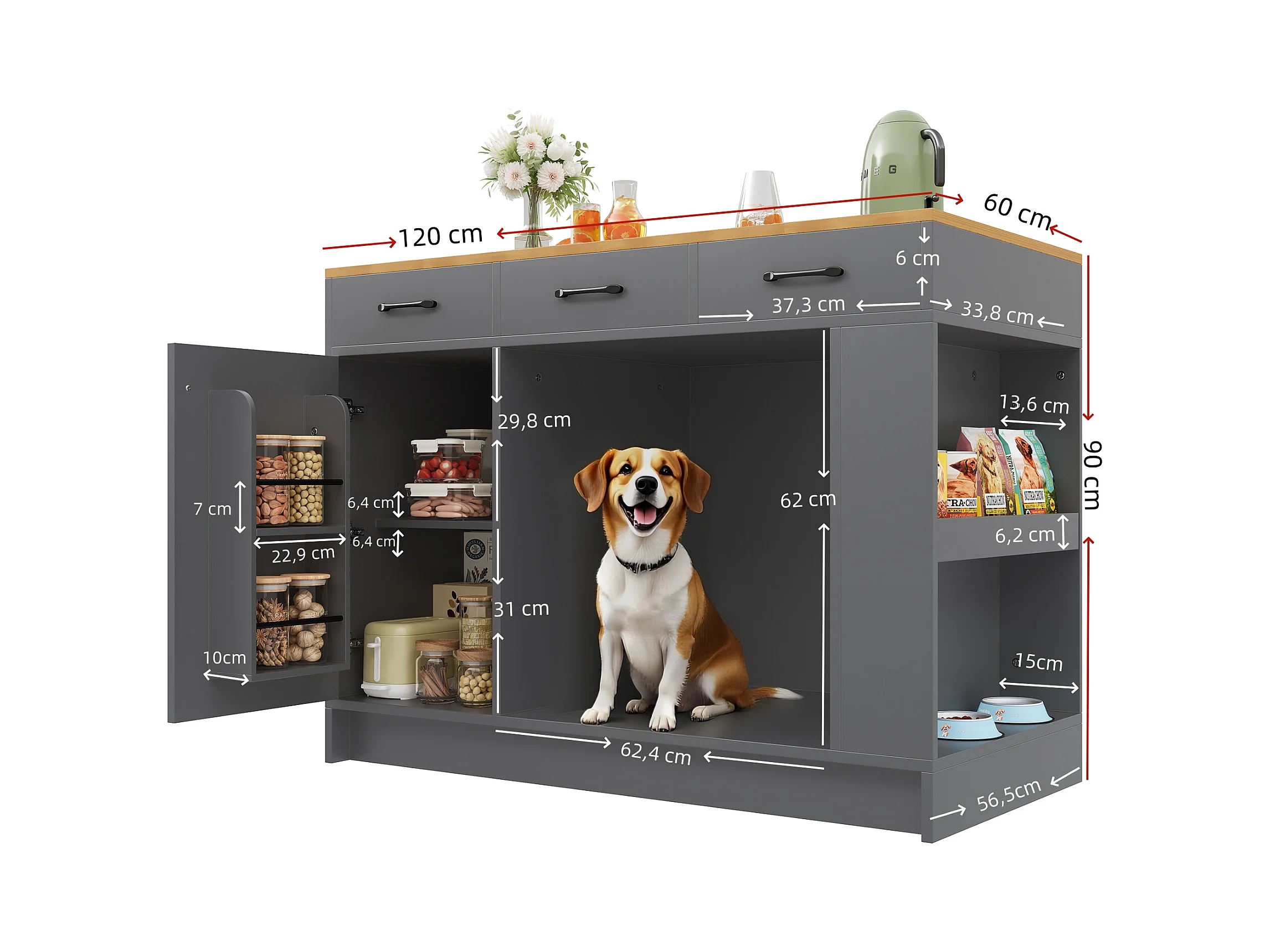 îlot central de cuisine 120x60x90 cm - avec 3 tiroirs et 1 porte - étagères ouvertes - espace de repos pour animaux - gris+naturel