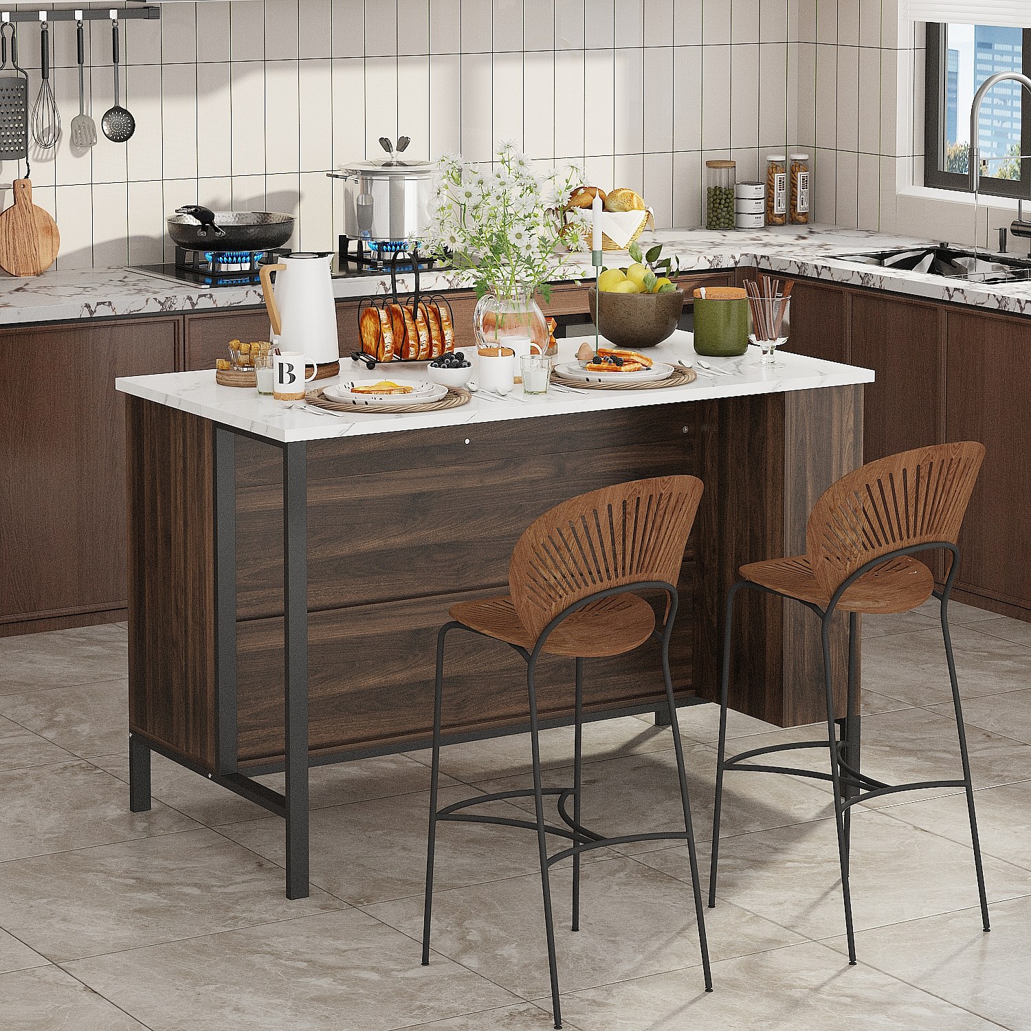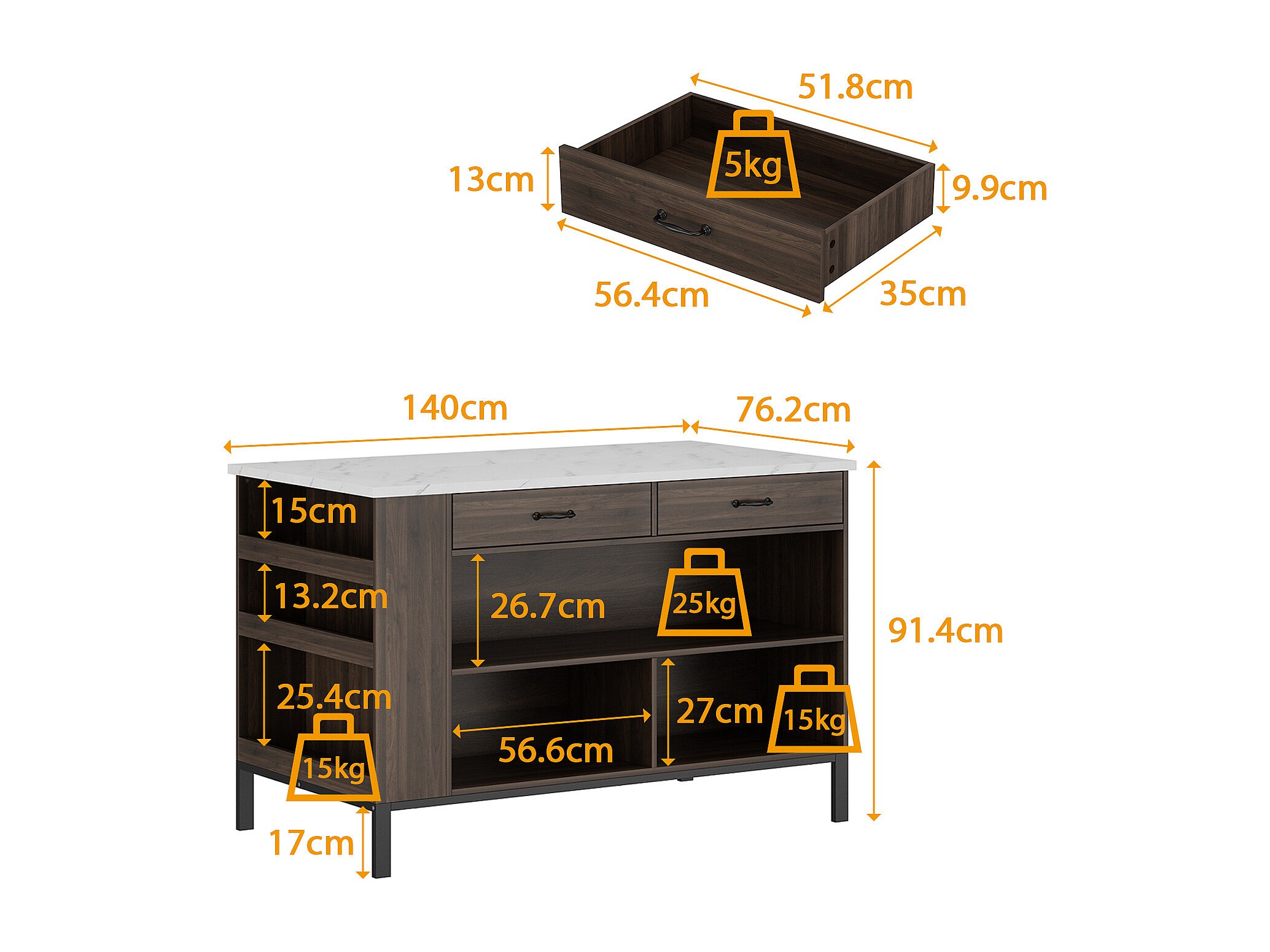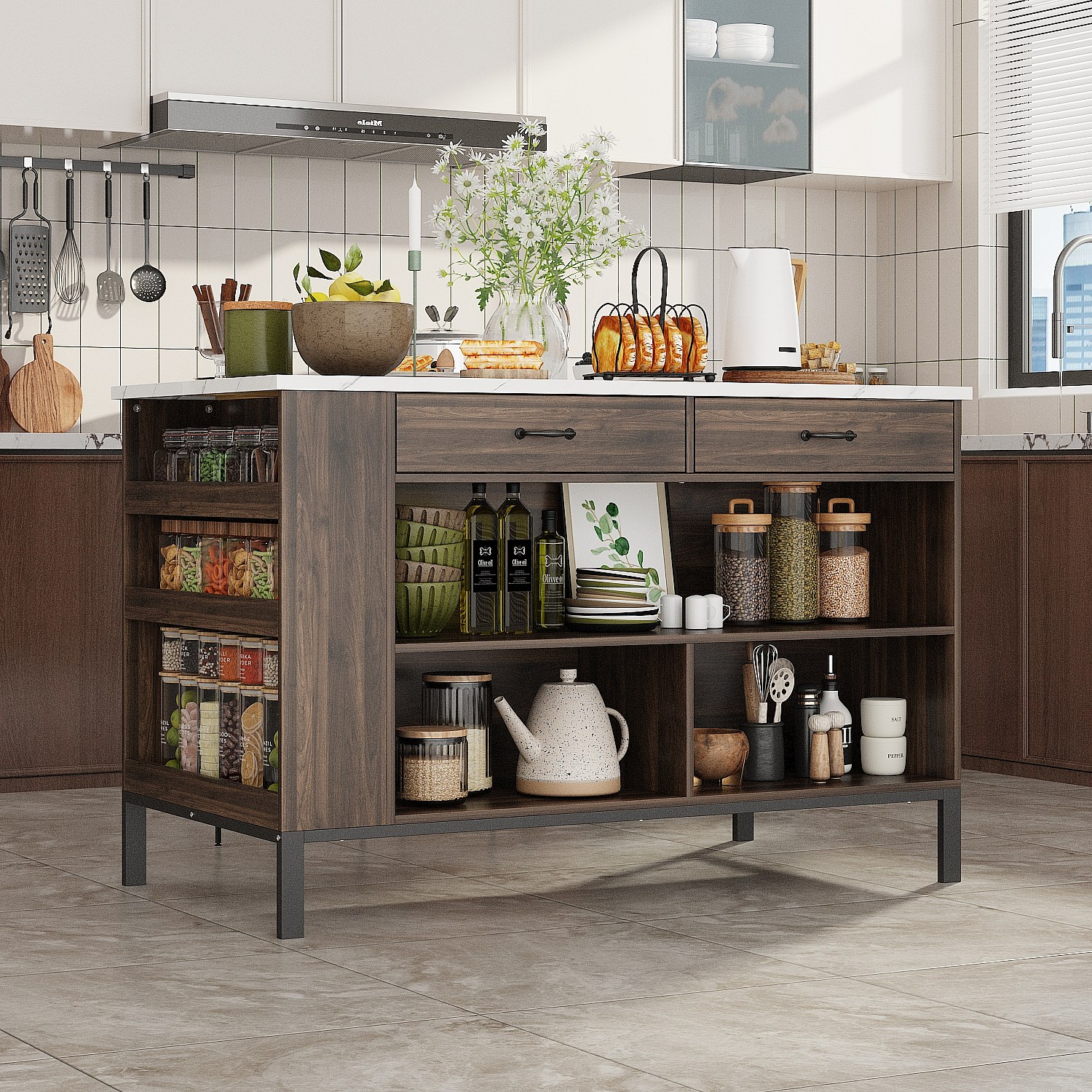 Îlot Central de Cuisine, 2 Tiroirs et 6 Compartiment, Grand Plan de Travail, Multi-Rangements, Style Industriel, 140x76.2x91.4 cm