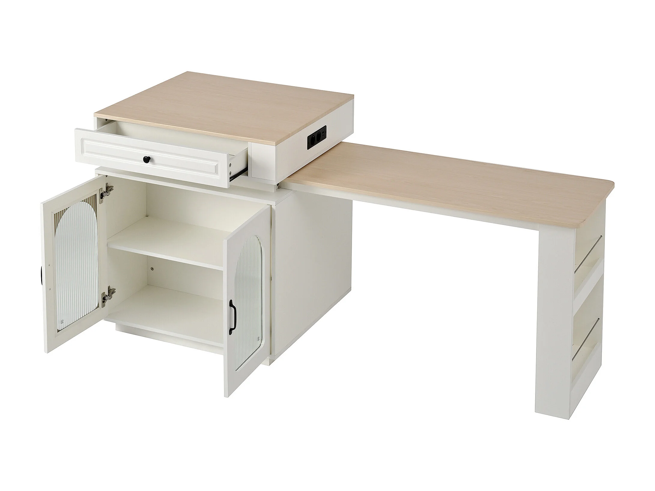 Îlot central de cuisine avec 2 portes verre et tiroir - Table extensible et LED,USB/Type-C - Plateau woodgrain