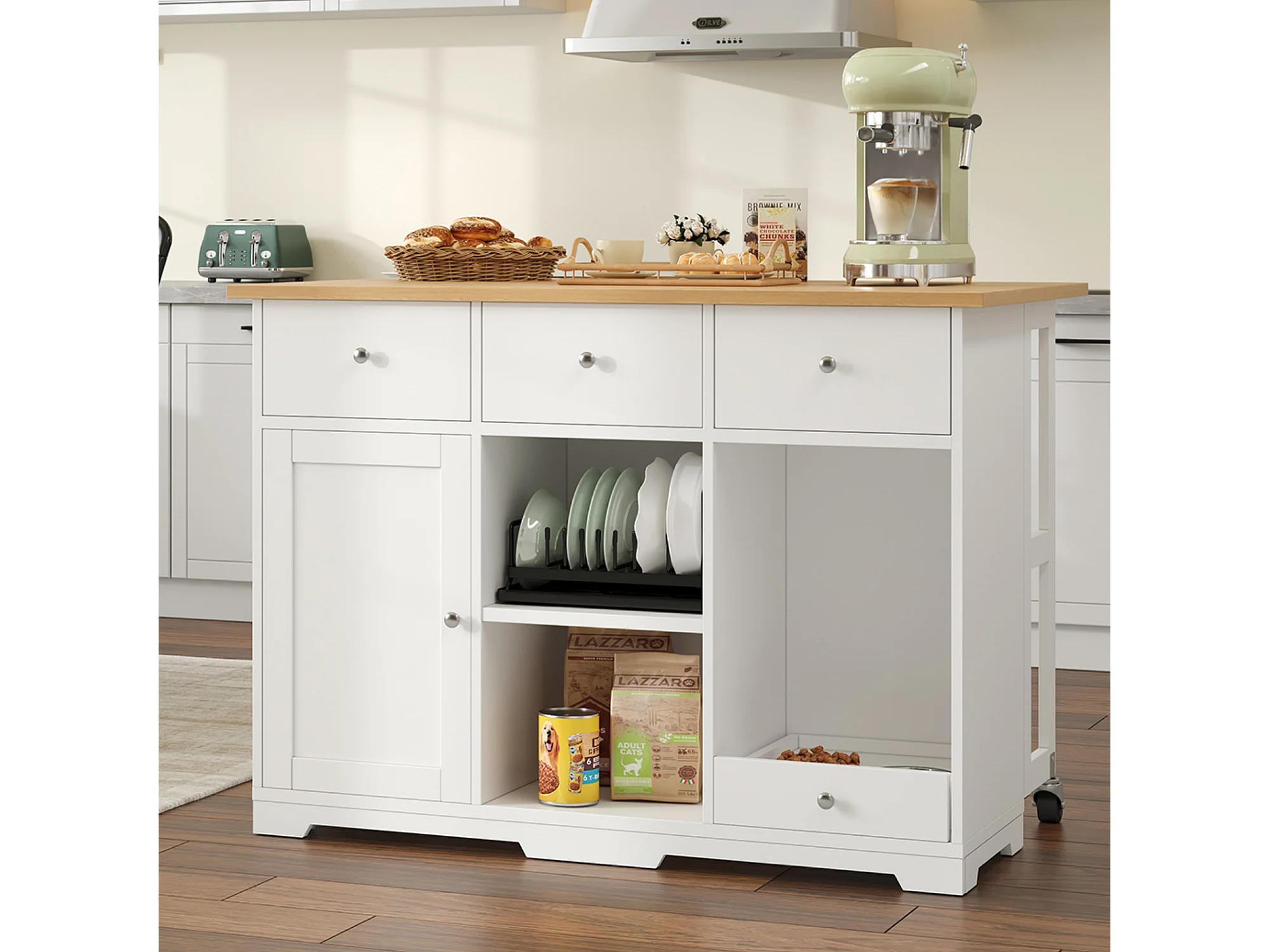 Îlot central de cuisine avec 3 tiroirs et gamelle pour animaux - Blanc et naturel clair