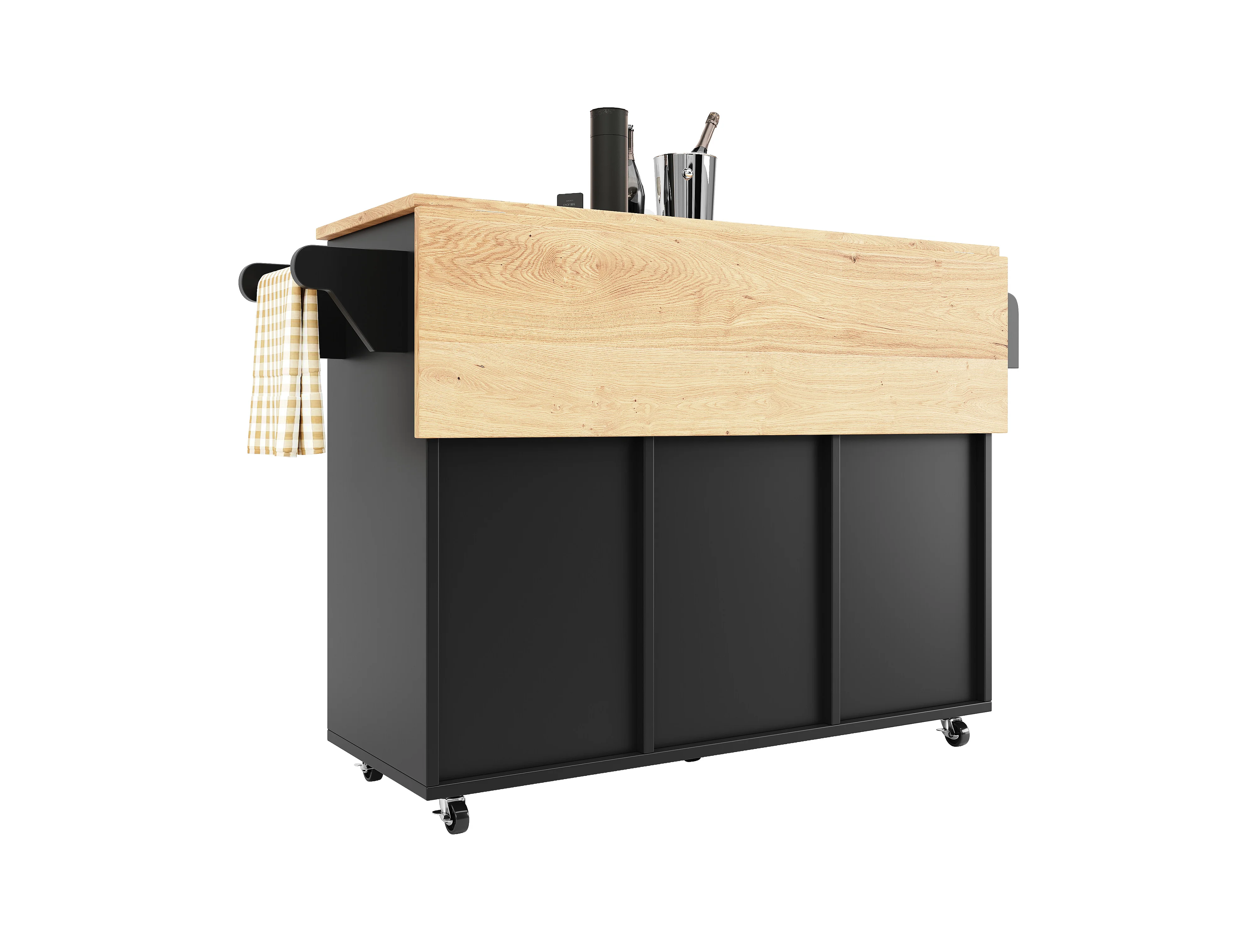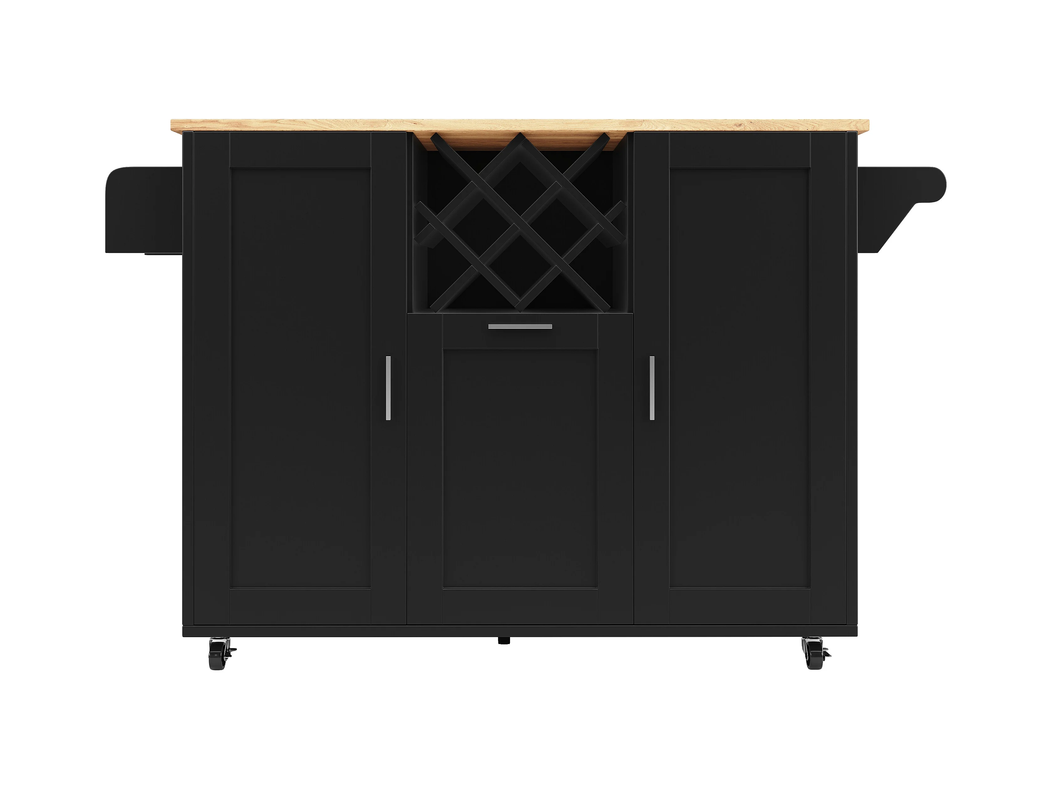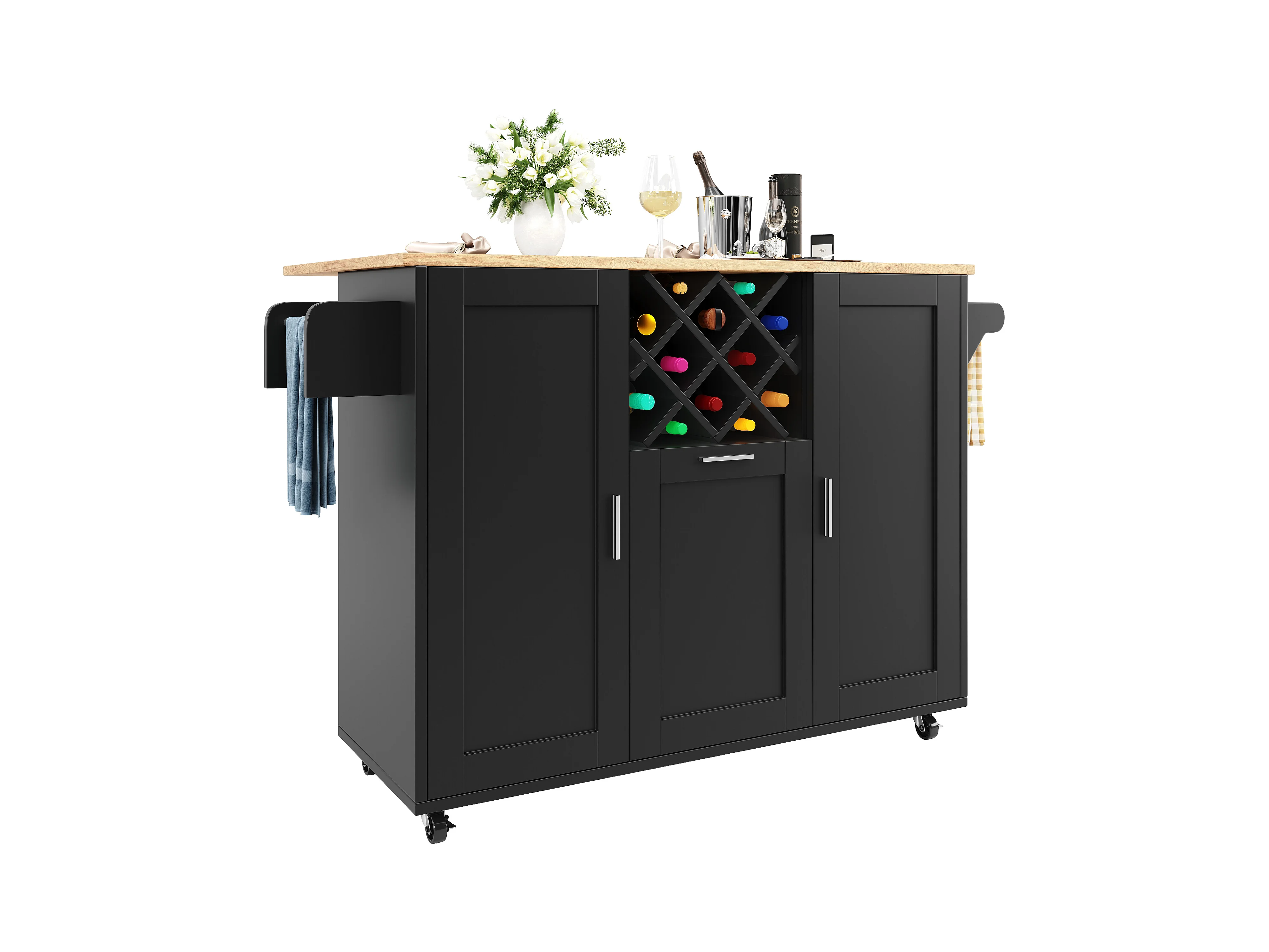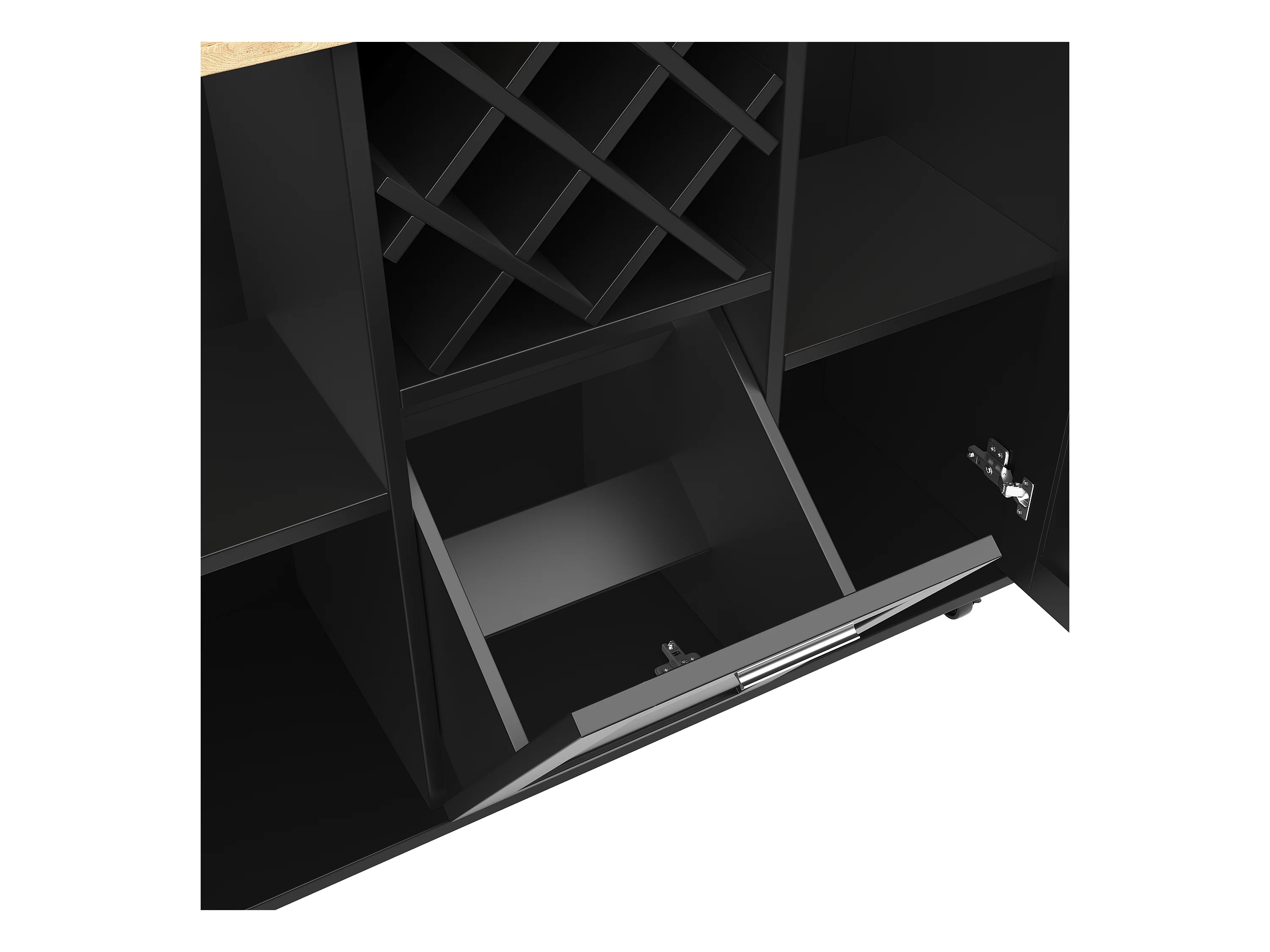 Ilot central de cuisine mobile avec 3 portes et 12 Porte-Bouteilles - Plateau extensible - 183x43(76)x92cm - Bois MDF - Noir et naturel
