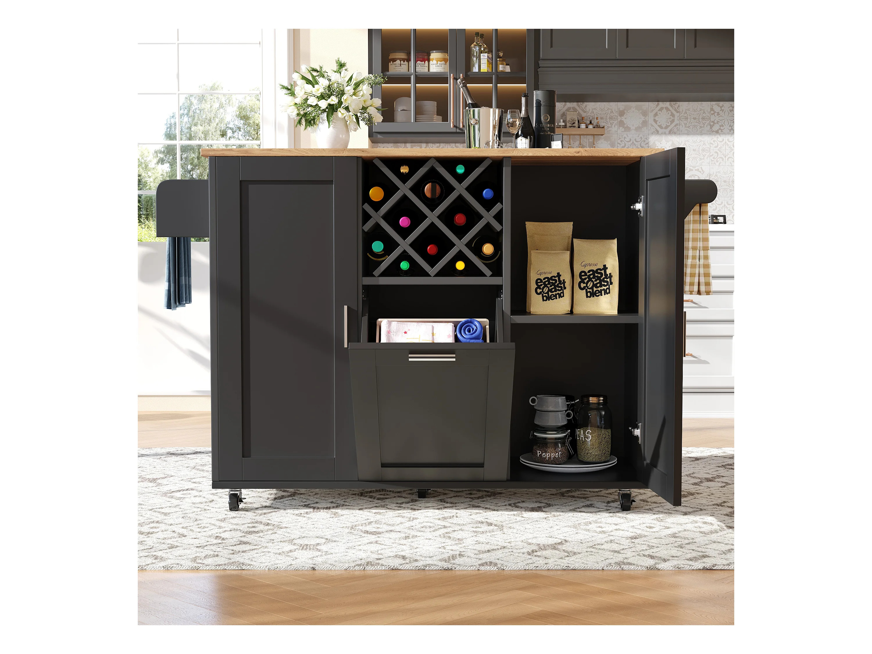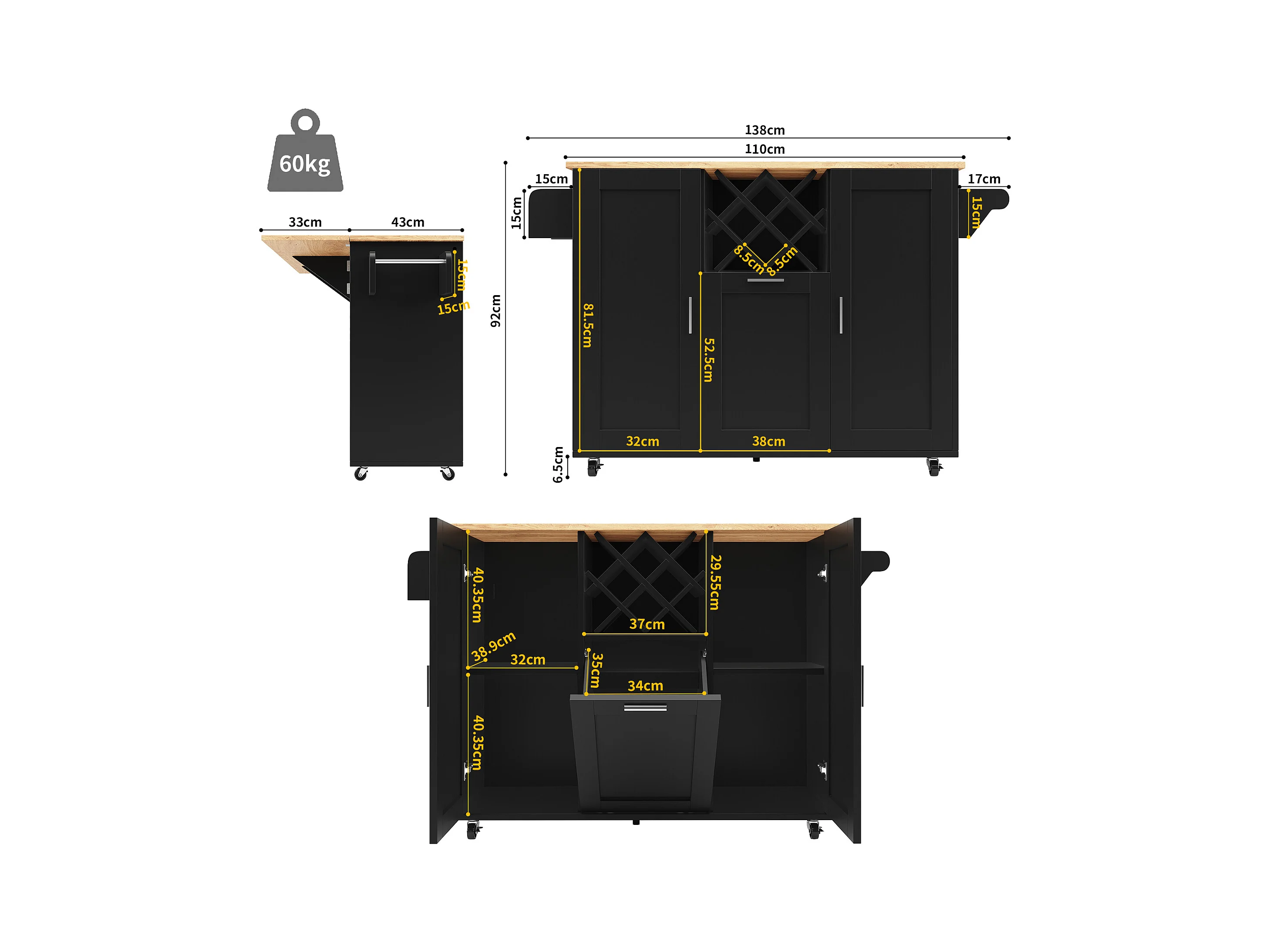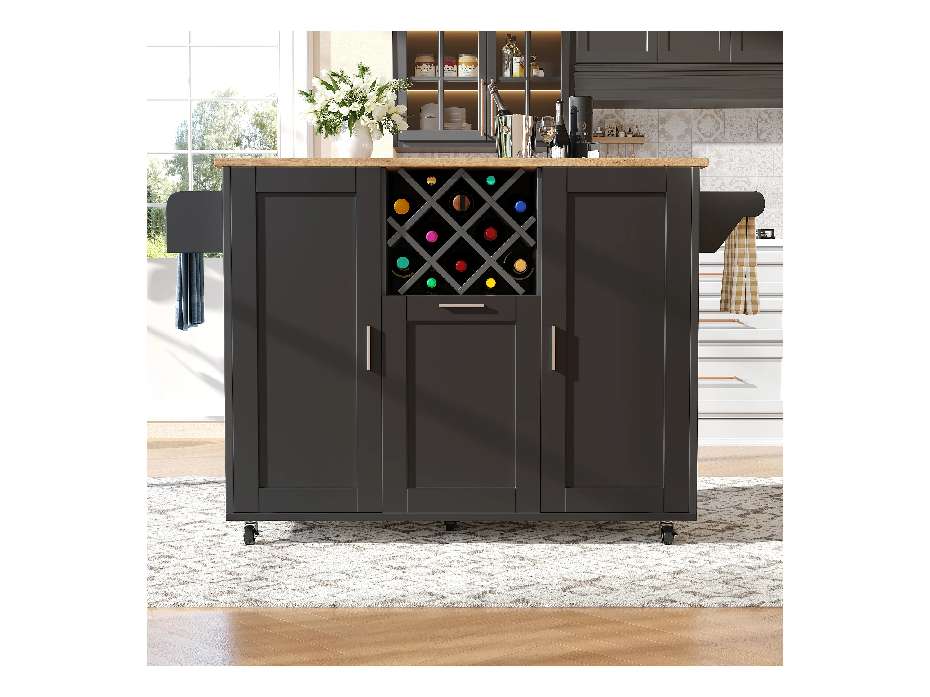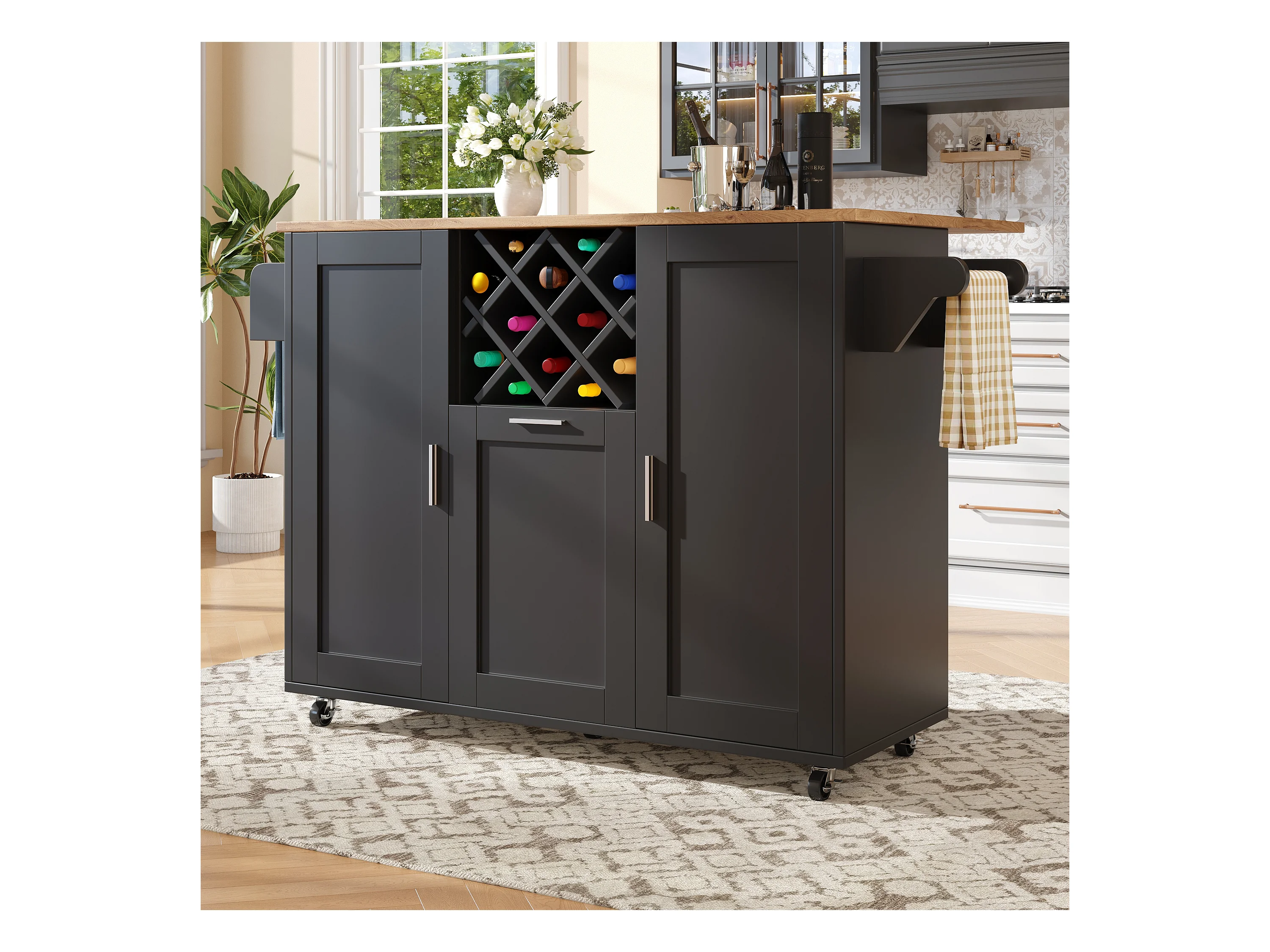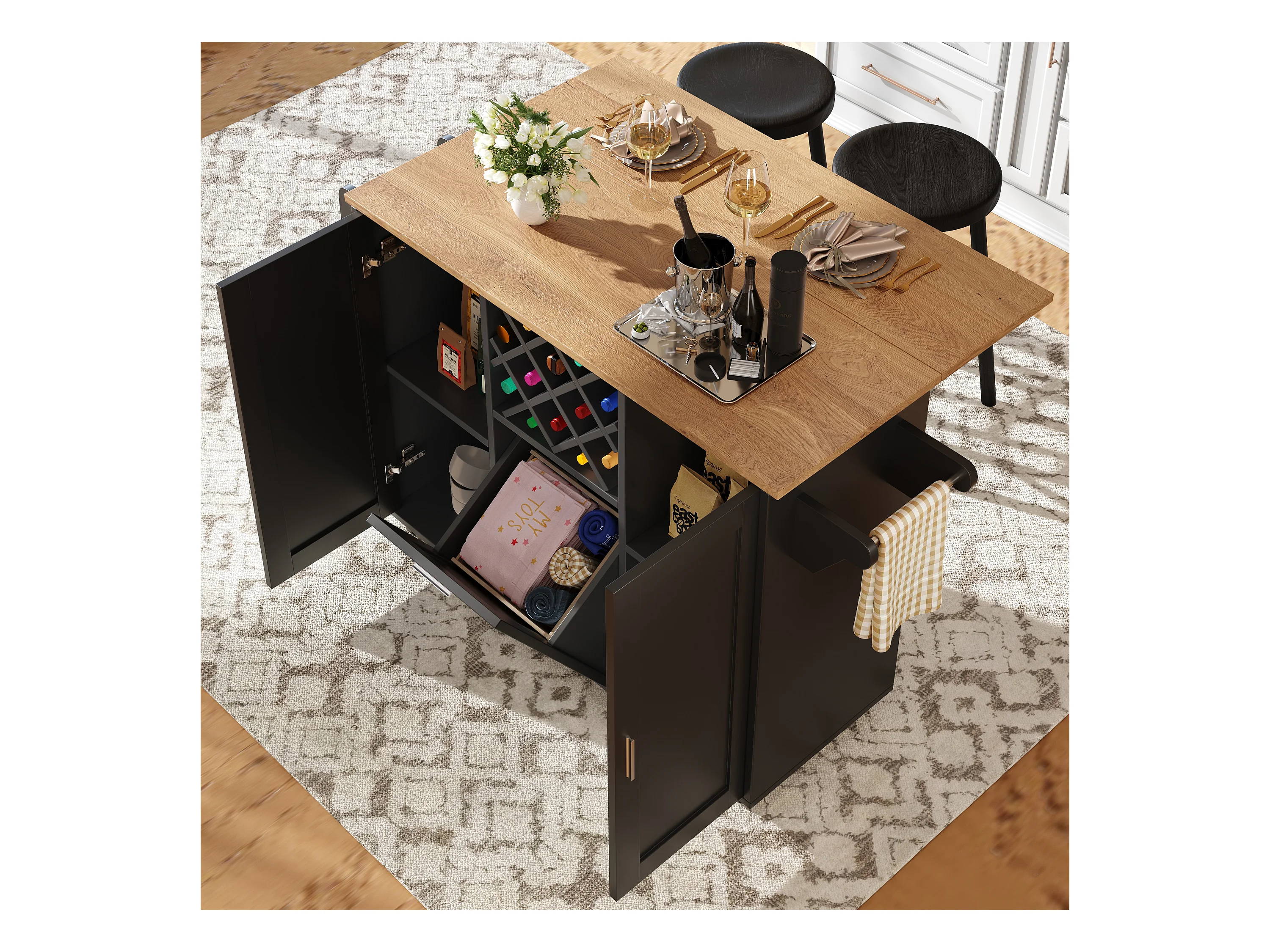 Ilot central de cuisine mobile avec 3 portes et 12 Porte-Bouteilles - Plateau extensible - 183x43(76)x92cm - Bois MDF - Noir et naturel