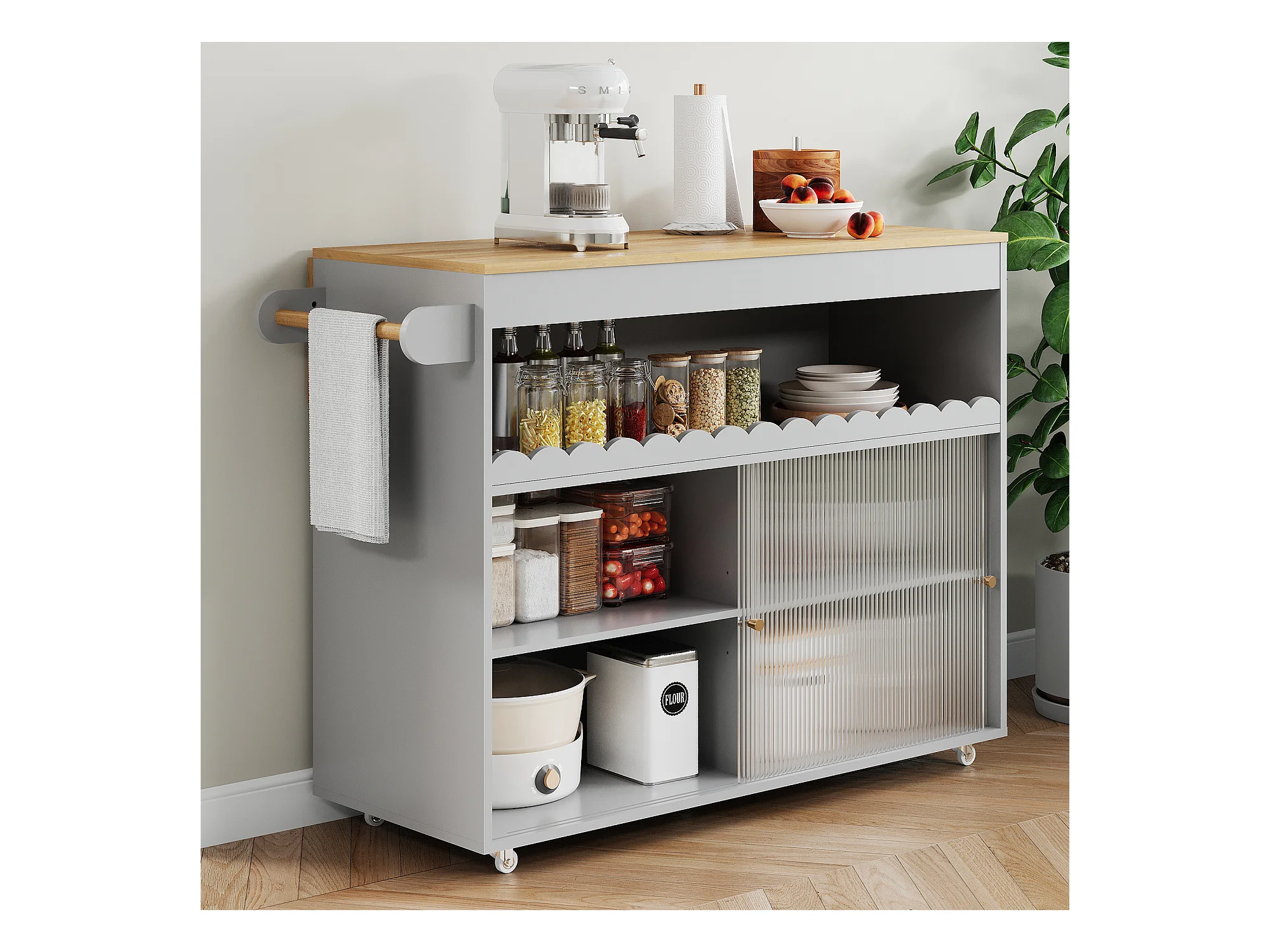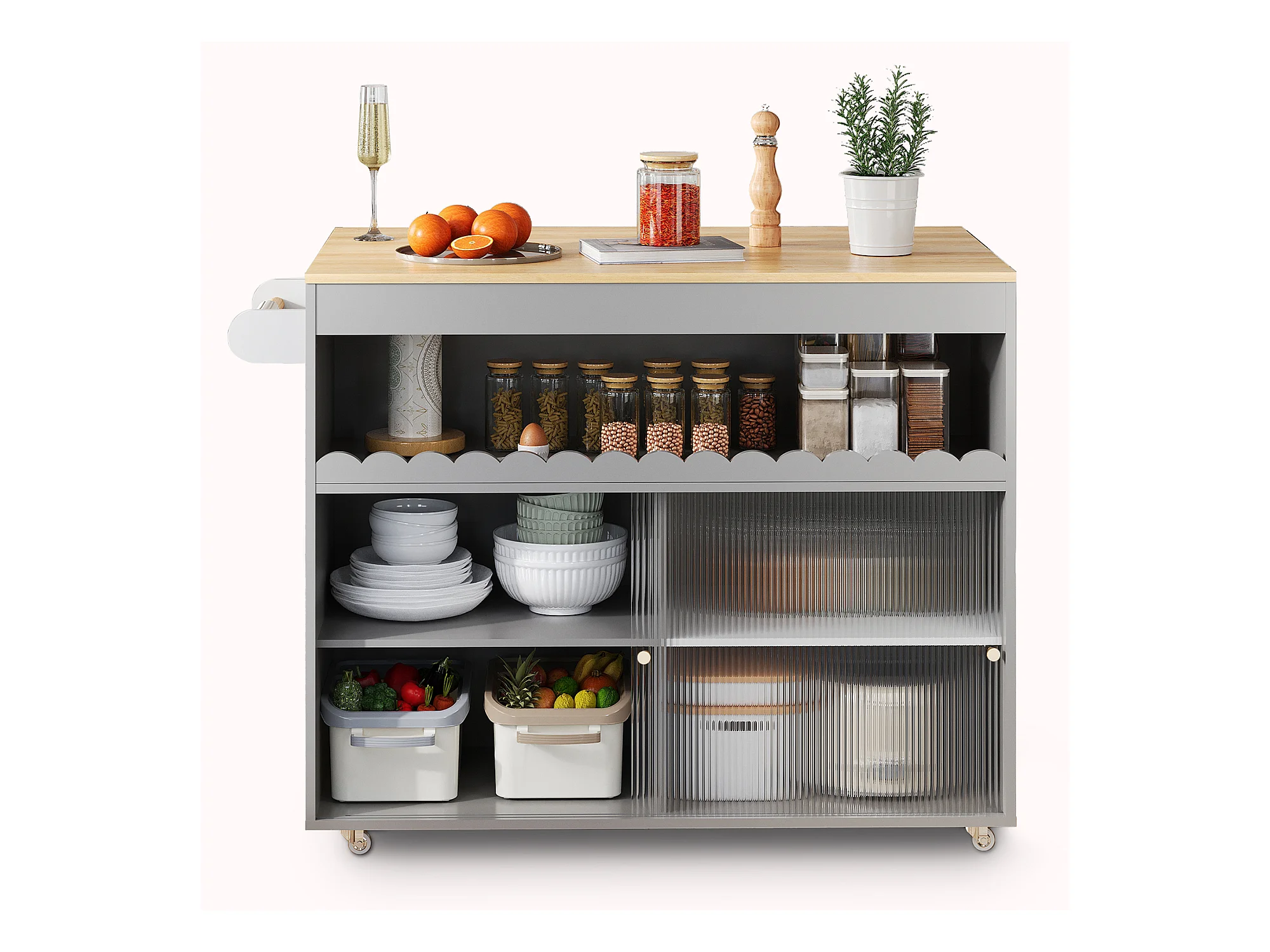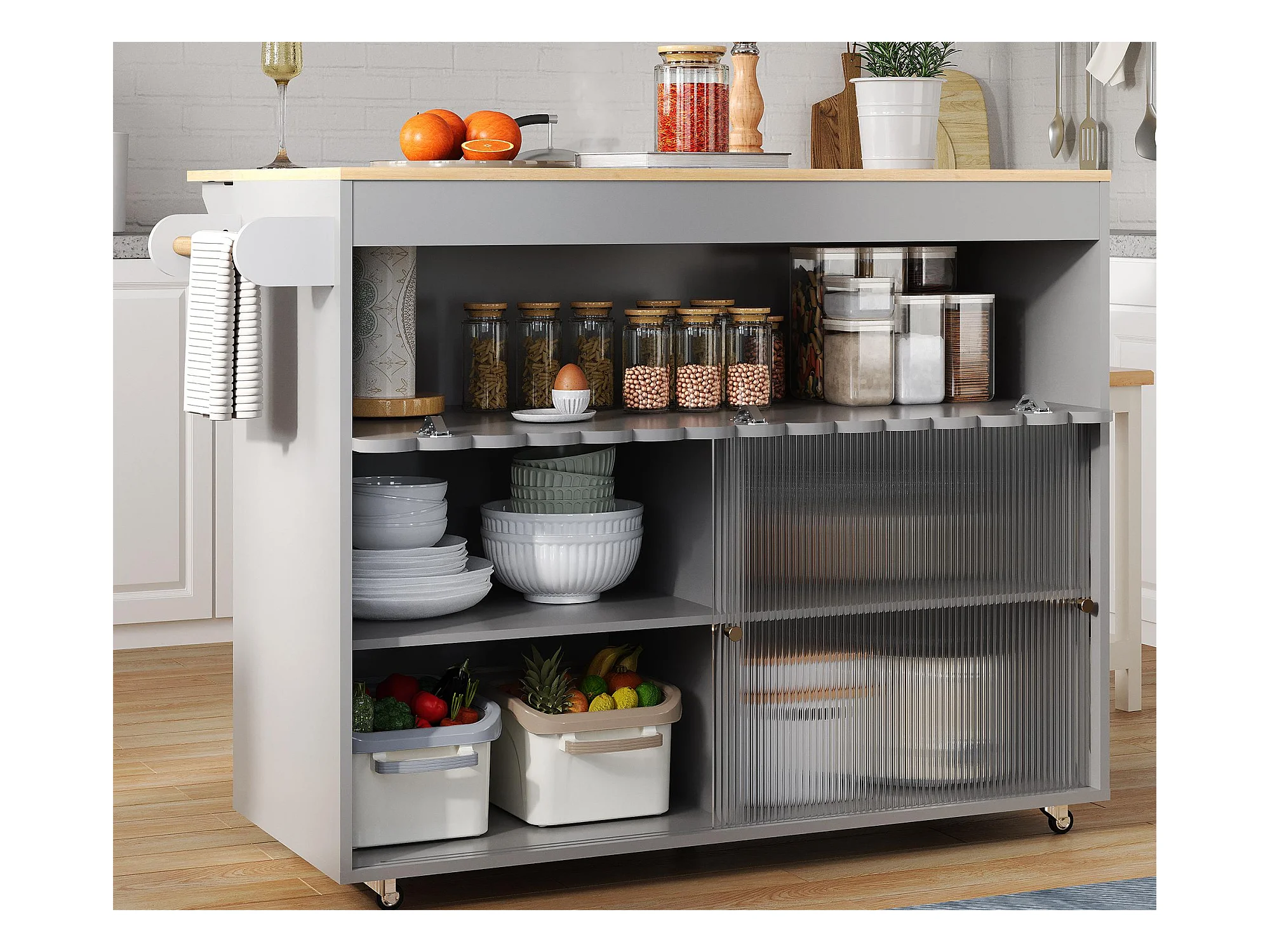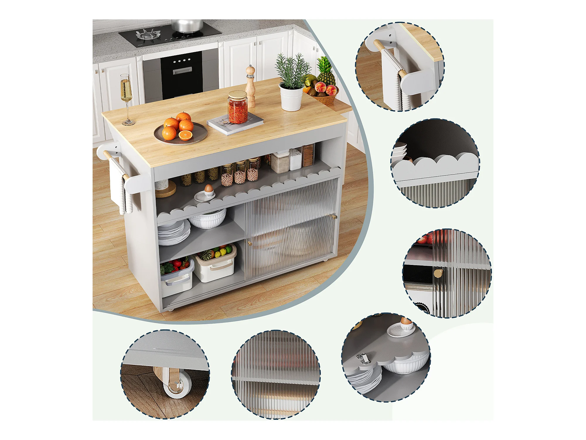 Ilot central de cuisine mobile - plateau extensible - 2 portes coulissante - avec porte-serviettes - MDF - Gris