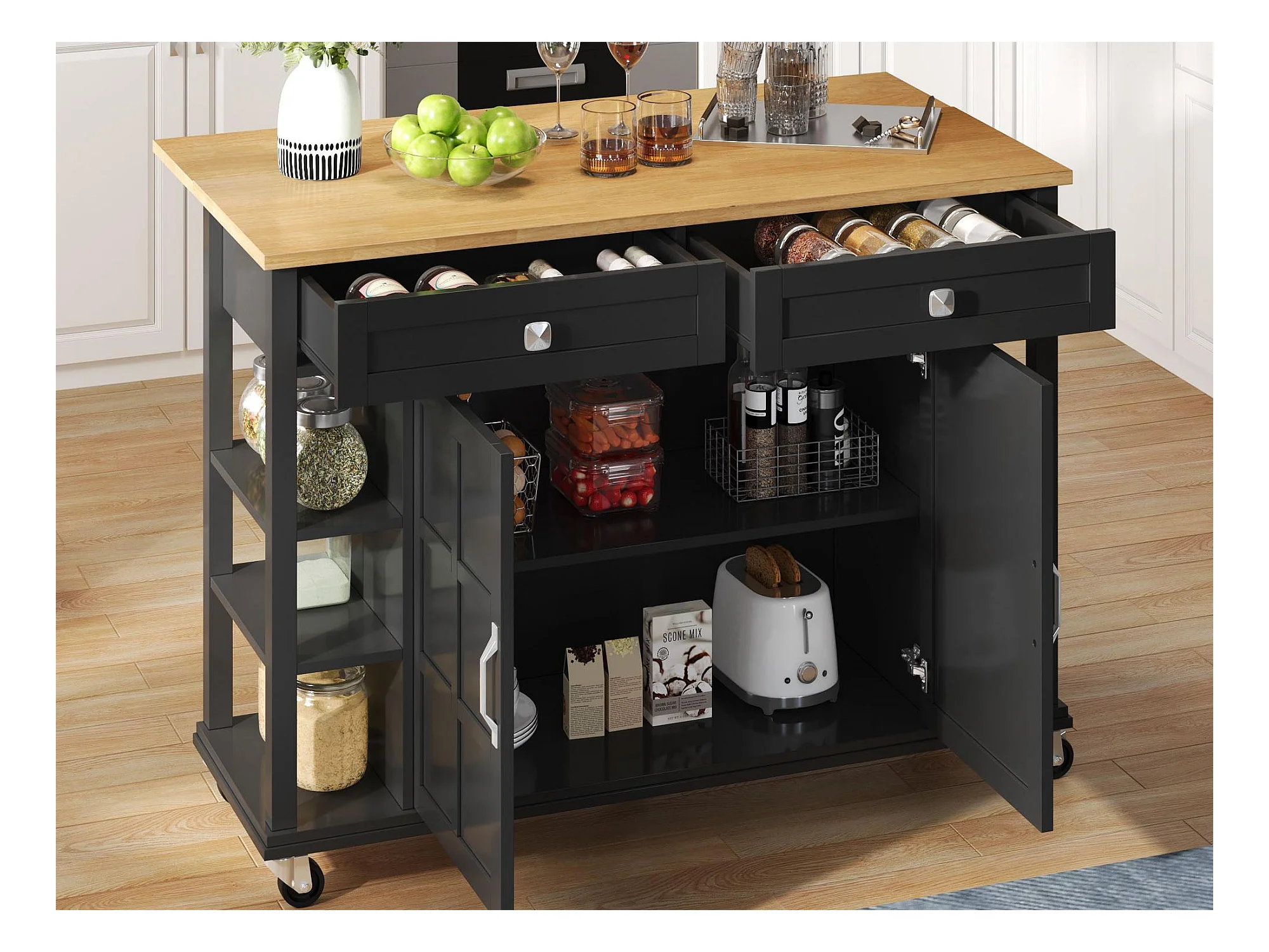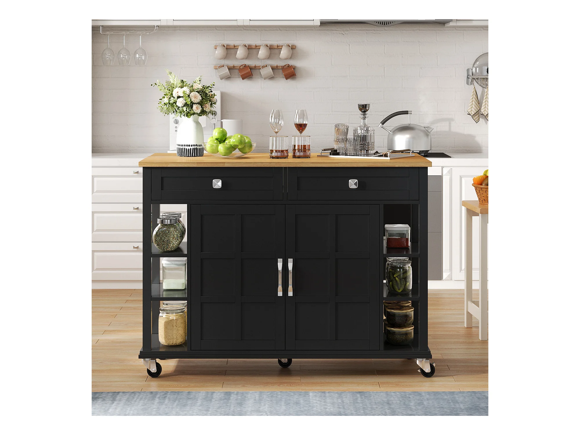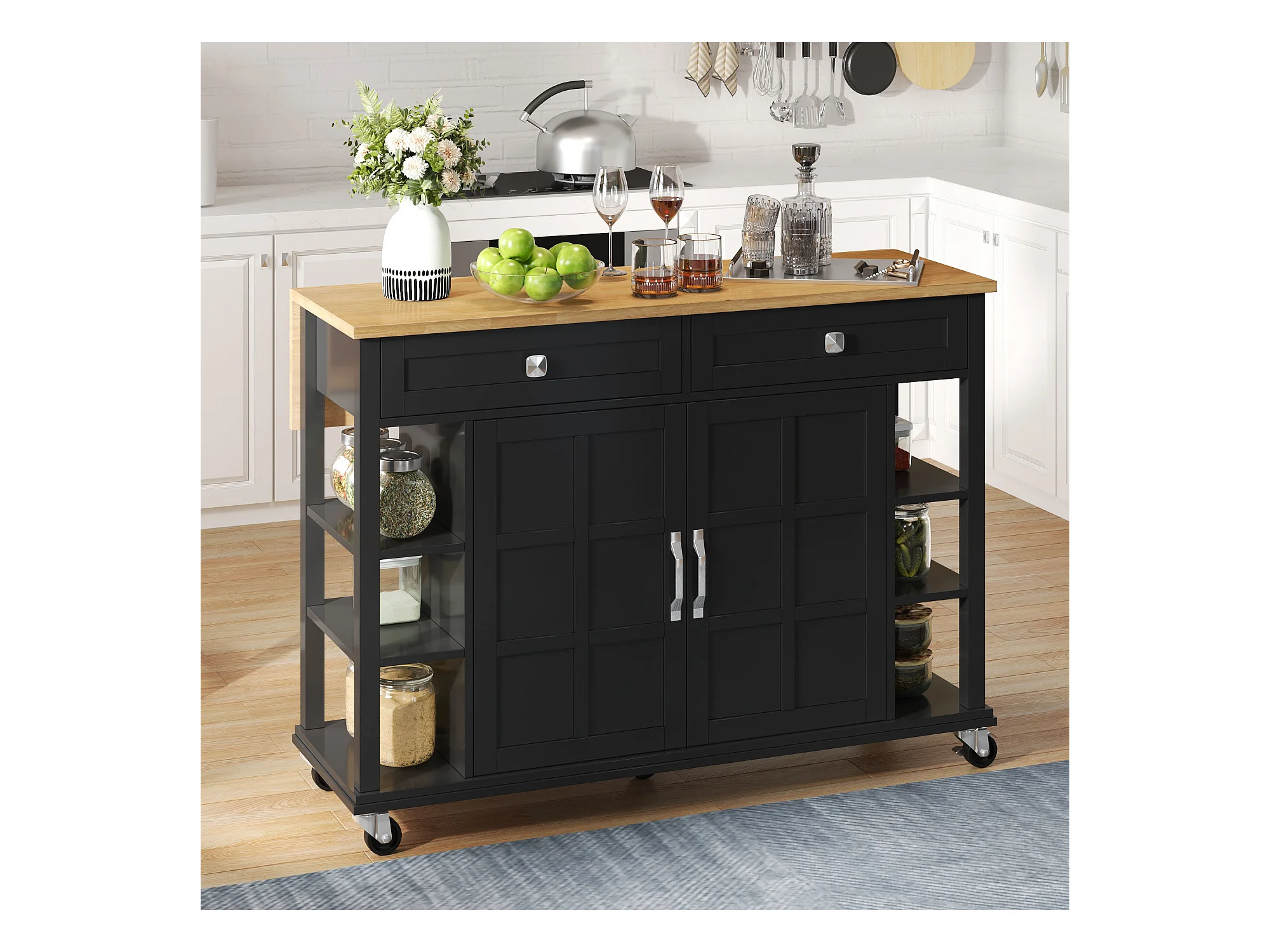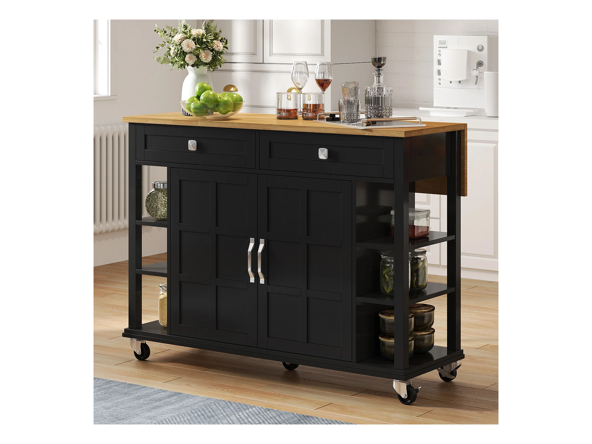 Ilot central de cuisine mobile - plateau extensible - 2 tiroirs et 2 portes - MDF - Noir
