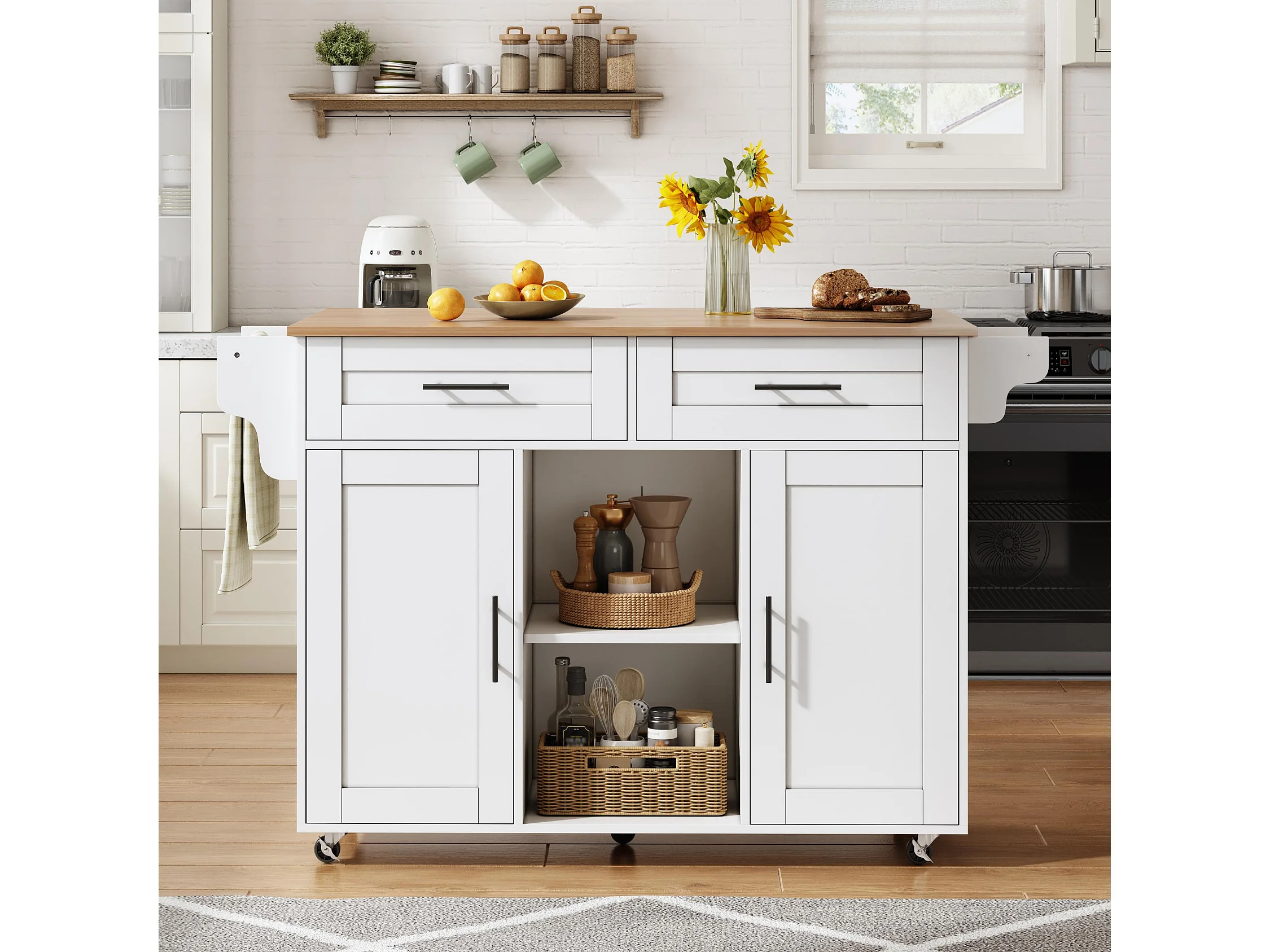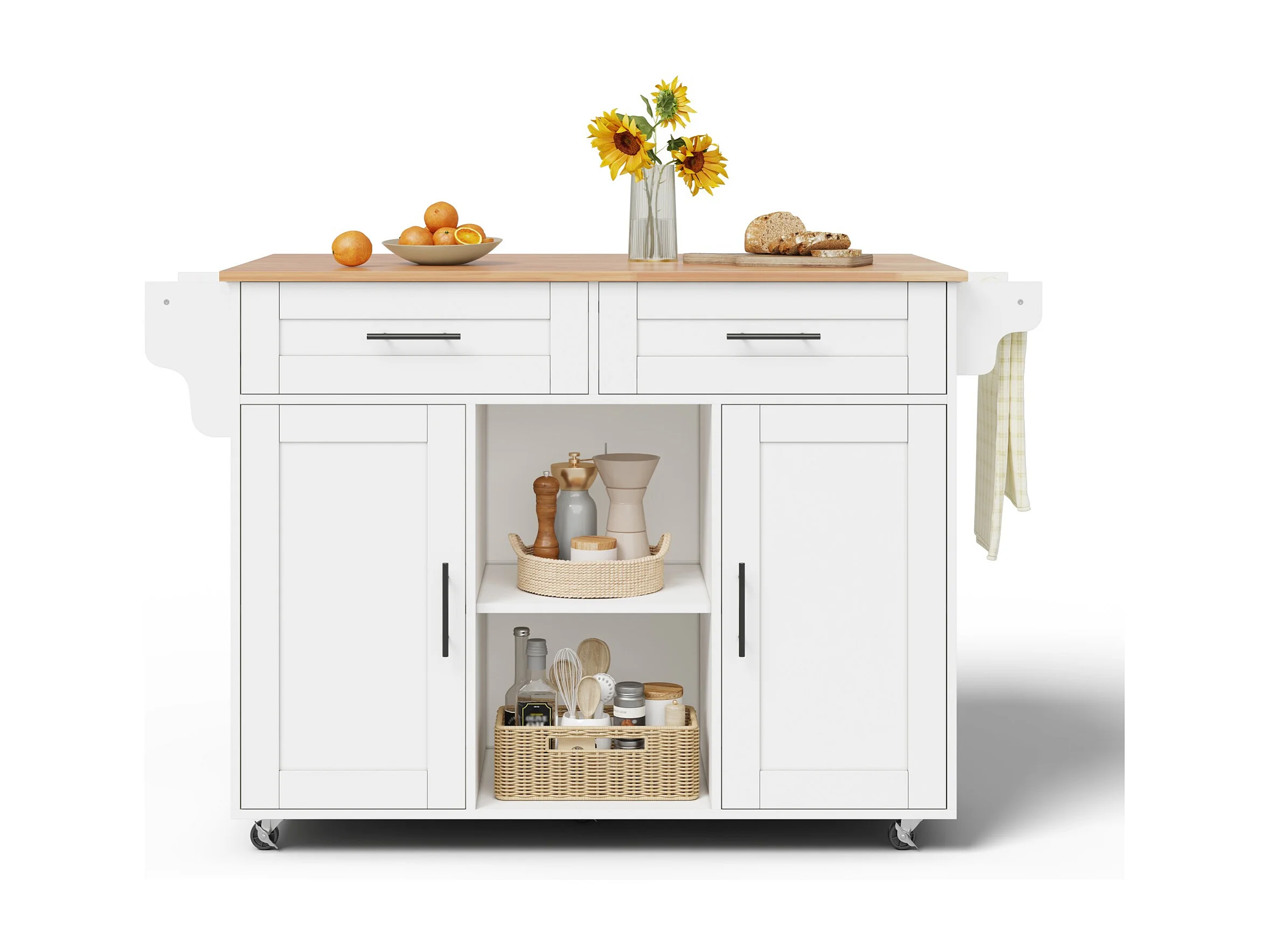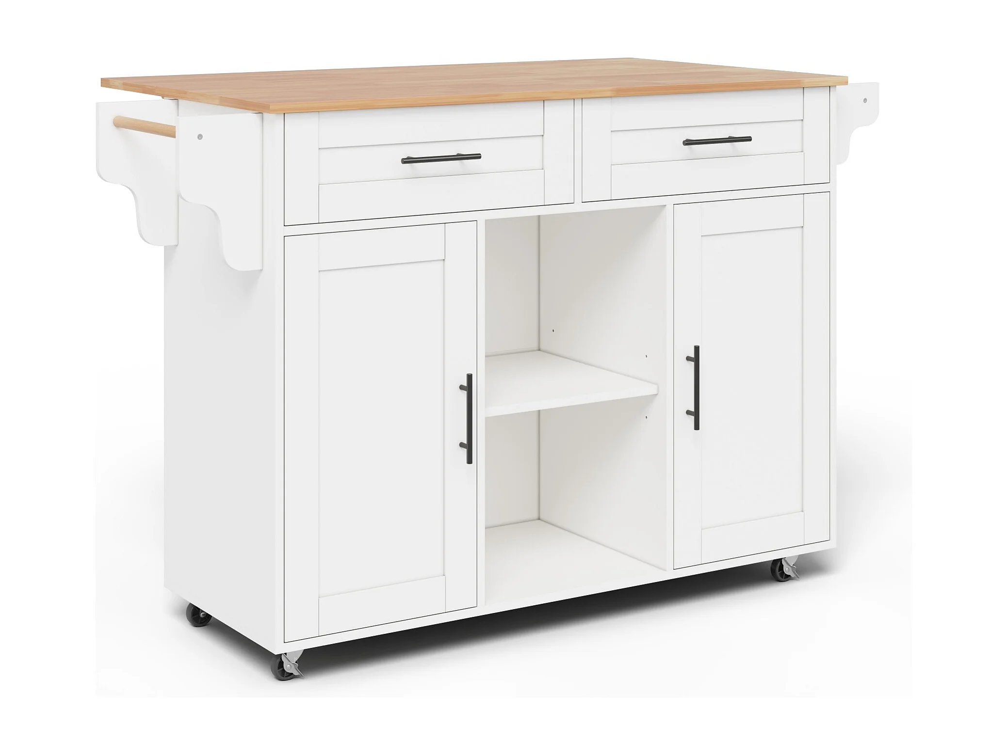 Îlot central de cuisine mobile - table à manger pliable - avec 2 portes et 2 tiroirs - avec porte-serviettes à vin et roulettes - Blanc
