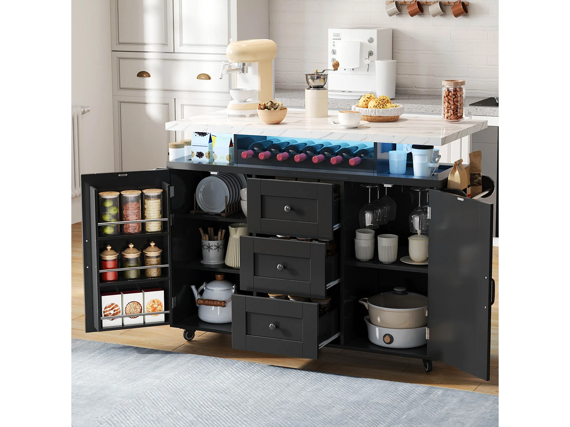 Îlot central de cuisine mobile - table à manger pliable - avec LED - avec 2 portes et 3 tiroirs - avec porte-verres à vin et roulettes - Noir