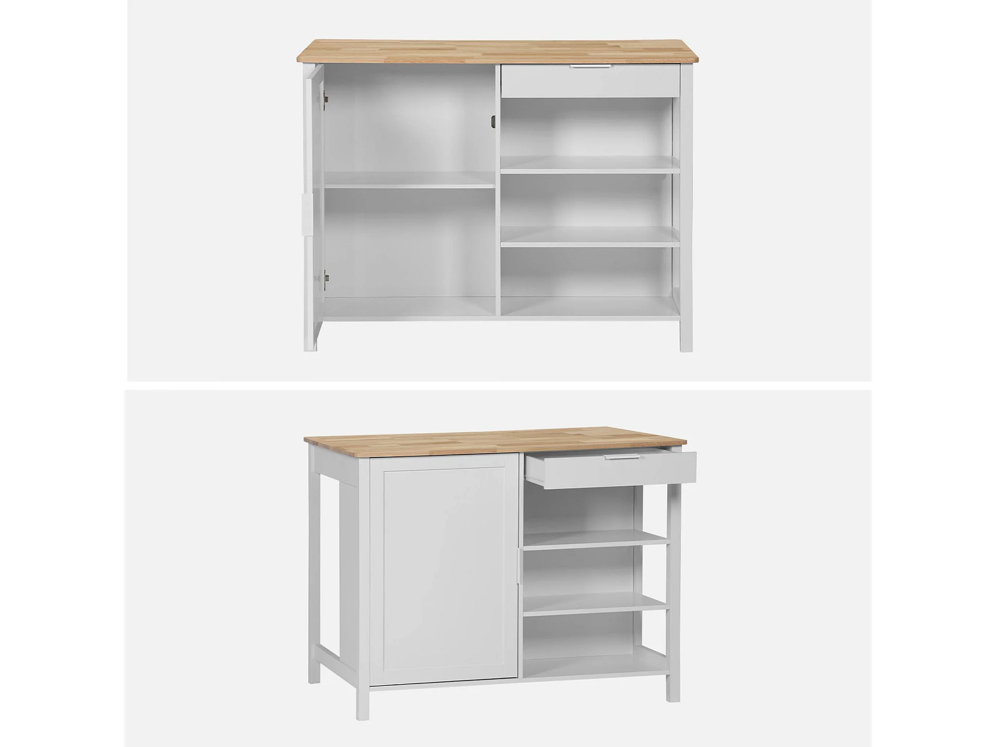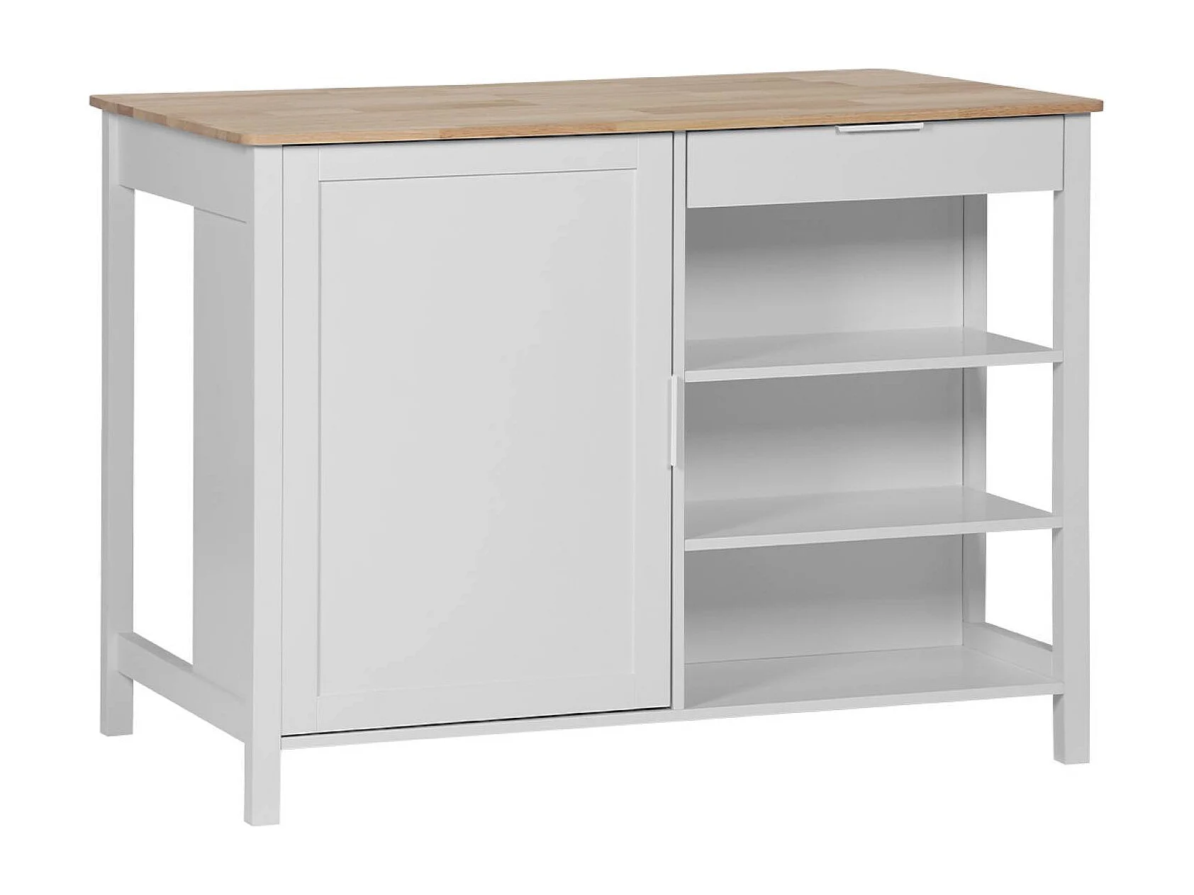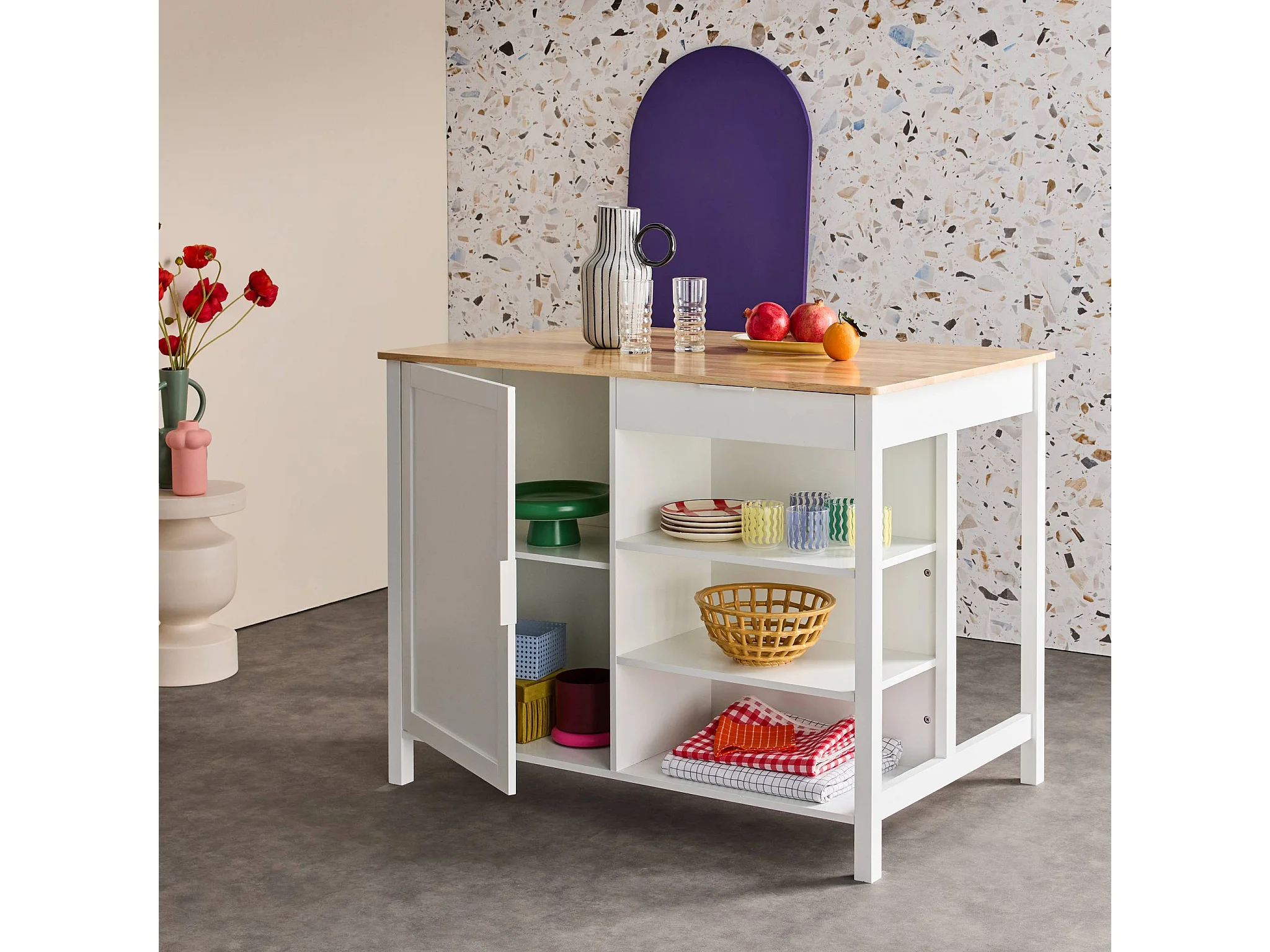 Îlot central de cuisine MOLENE. plateau en bois d'hévéa. 120x75cm. blanc. 5 étagères. 1 porte. 1 tiroir. L 120 x P 75 x H 90cm