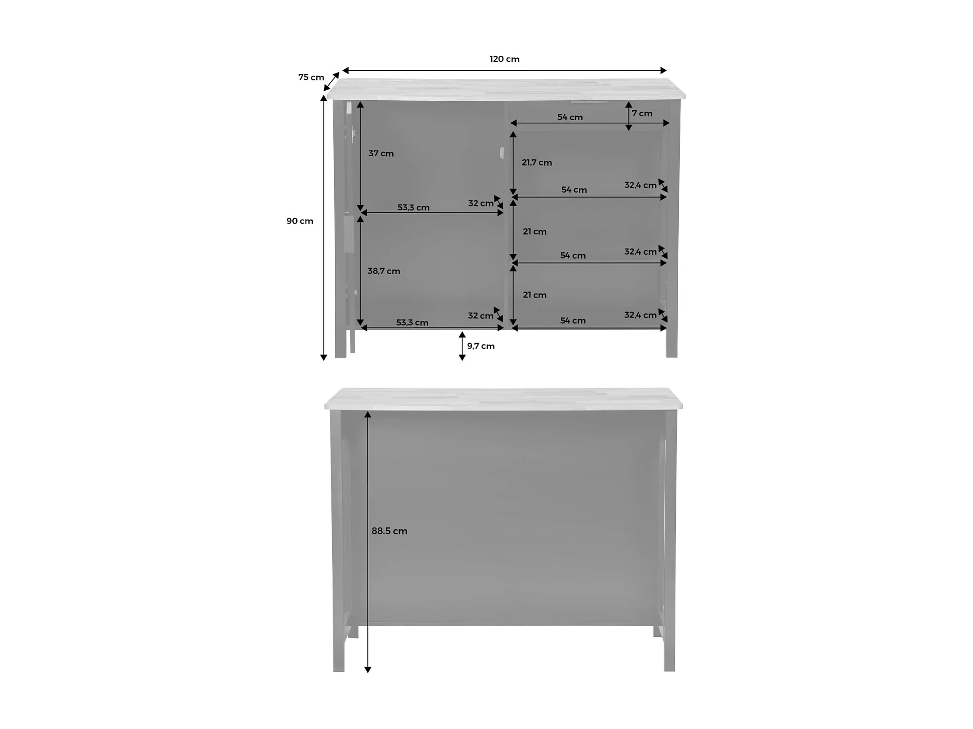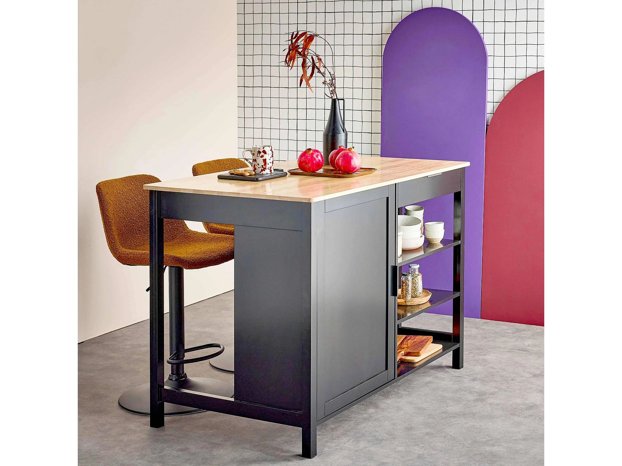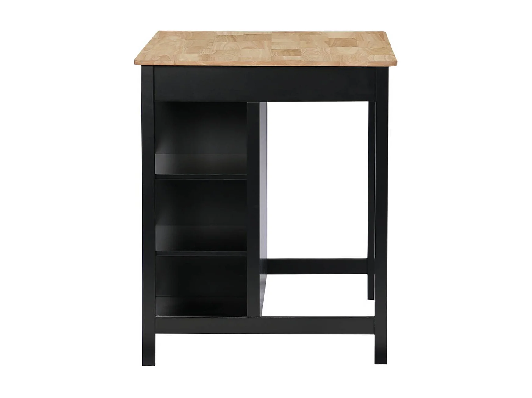 Îlot central de cuisine MOLENE. plateau en bois d'hévéa. 120x75cm. noir. 5 étagères. 1 porte. 1 tiroir. L 120 x P 75 x H 90cm
