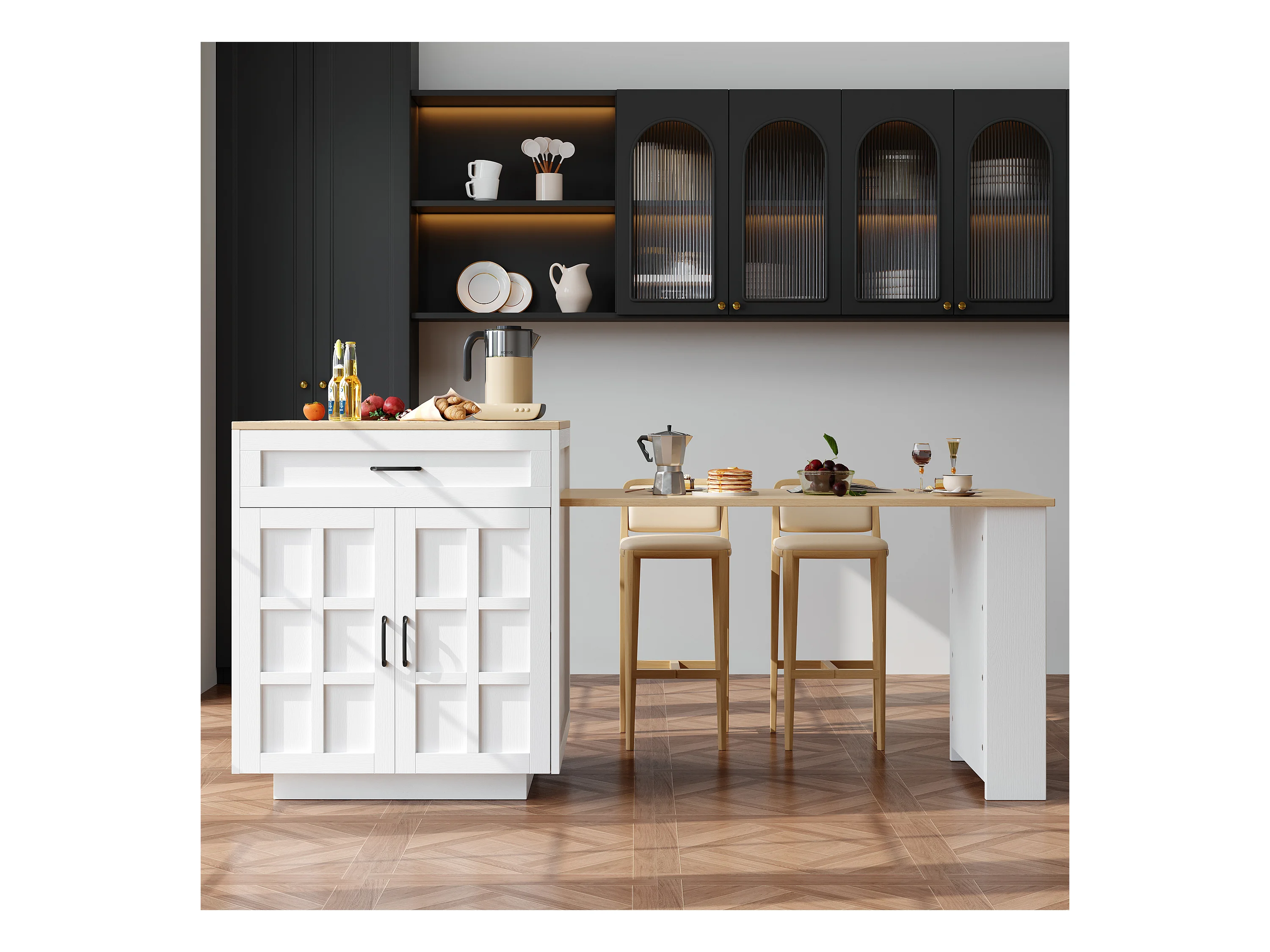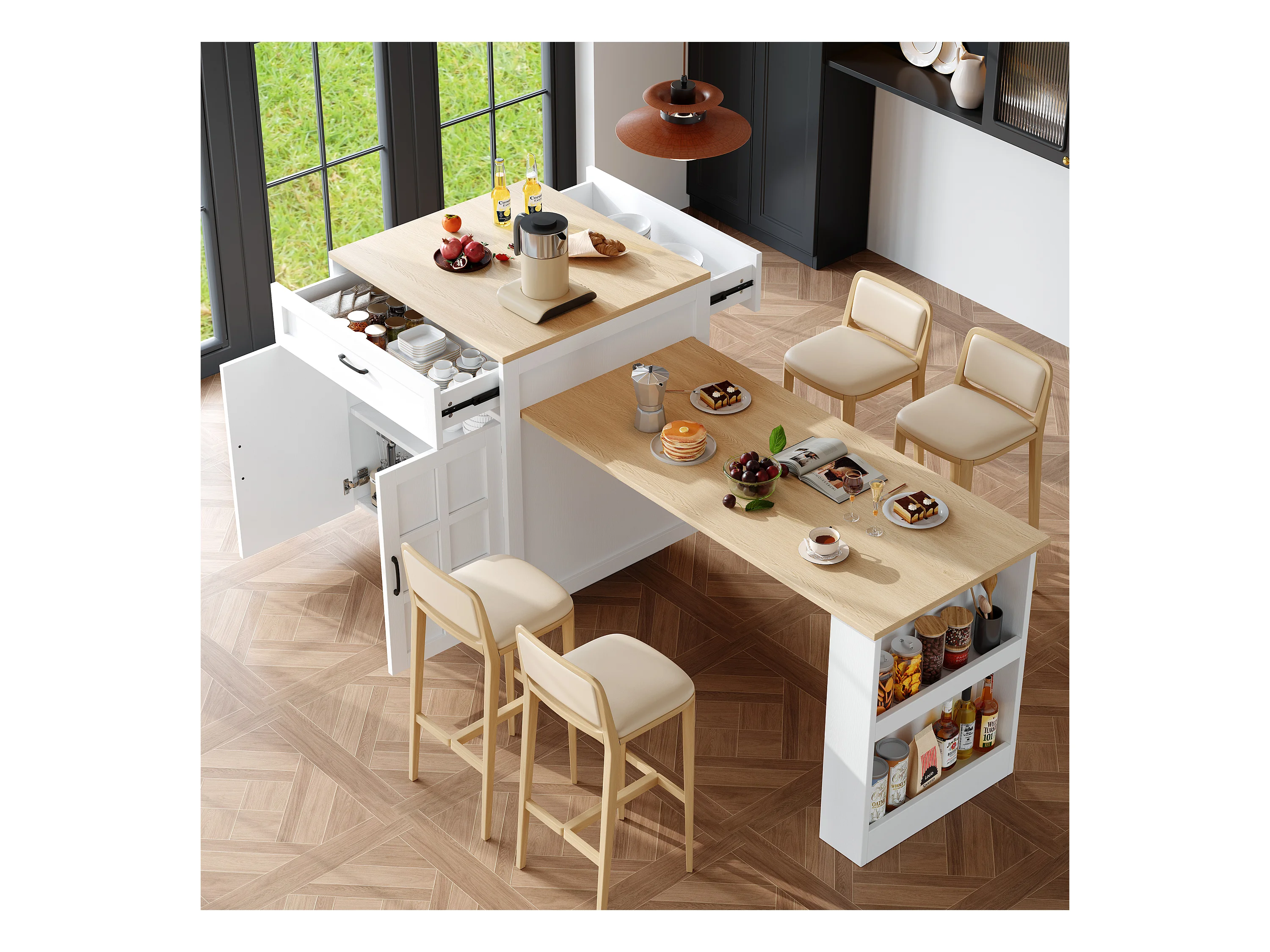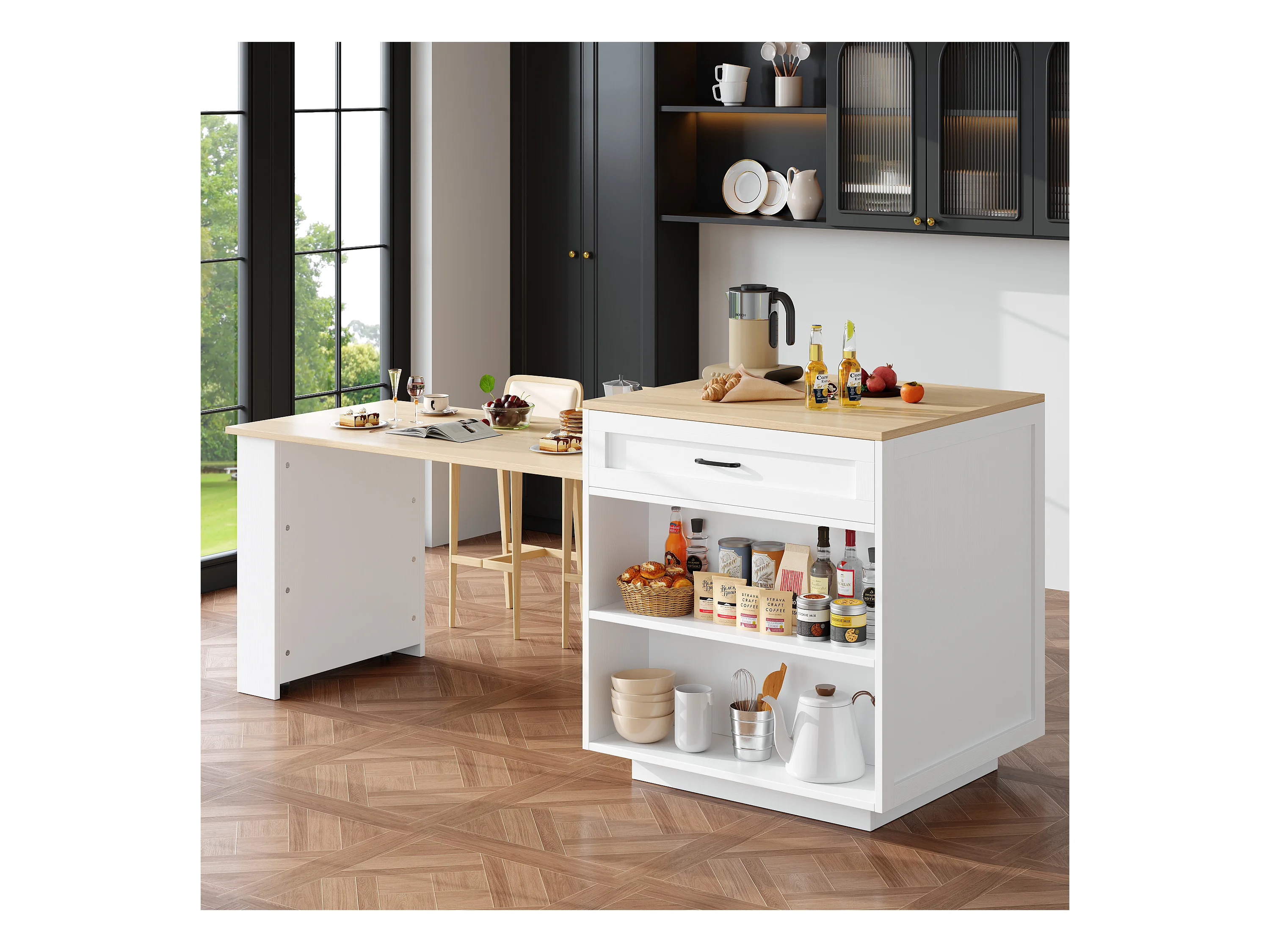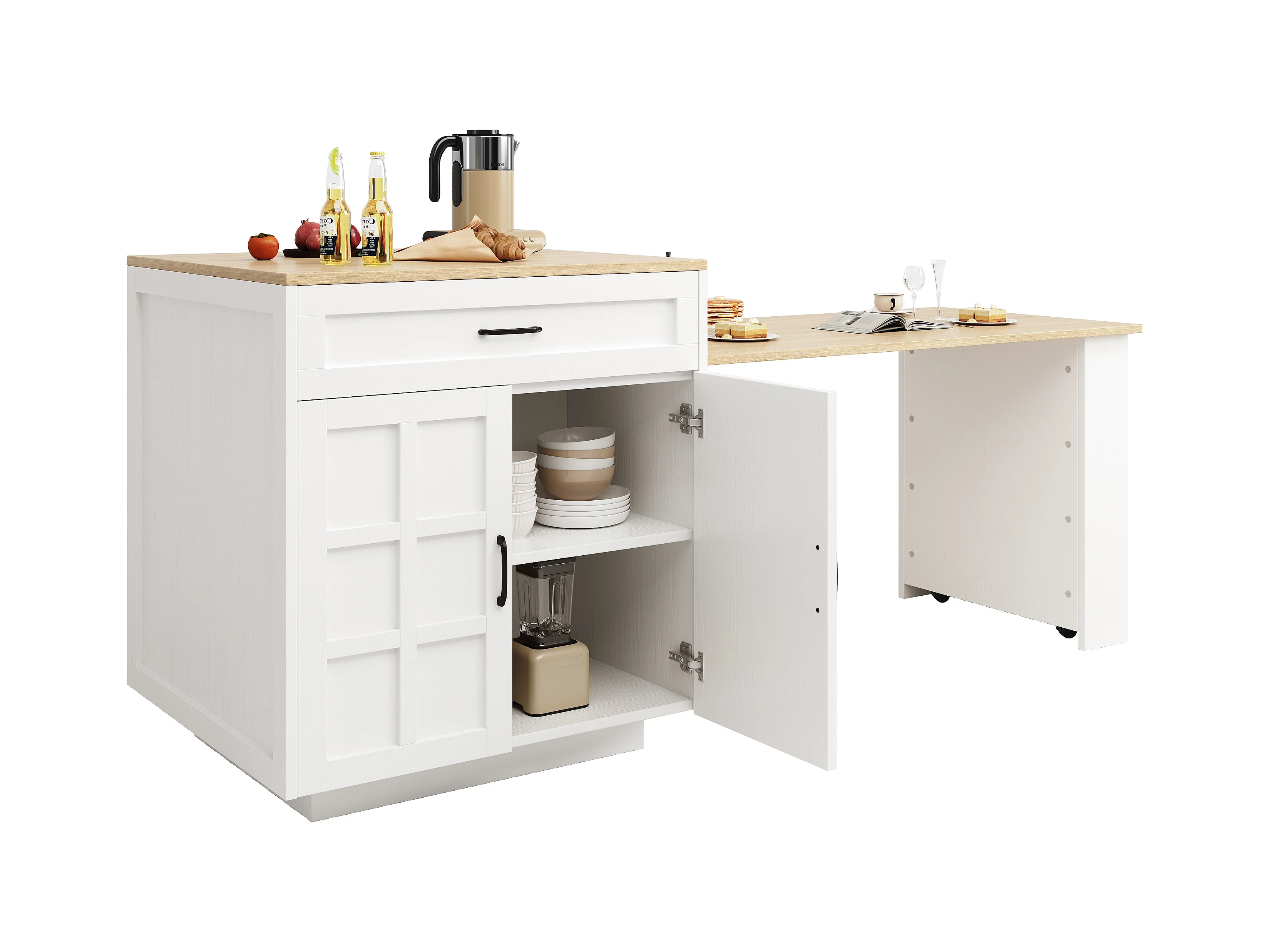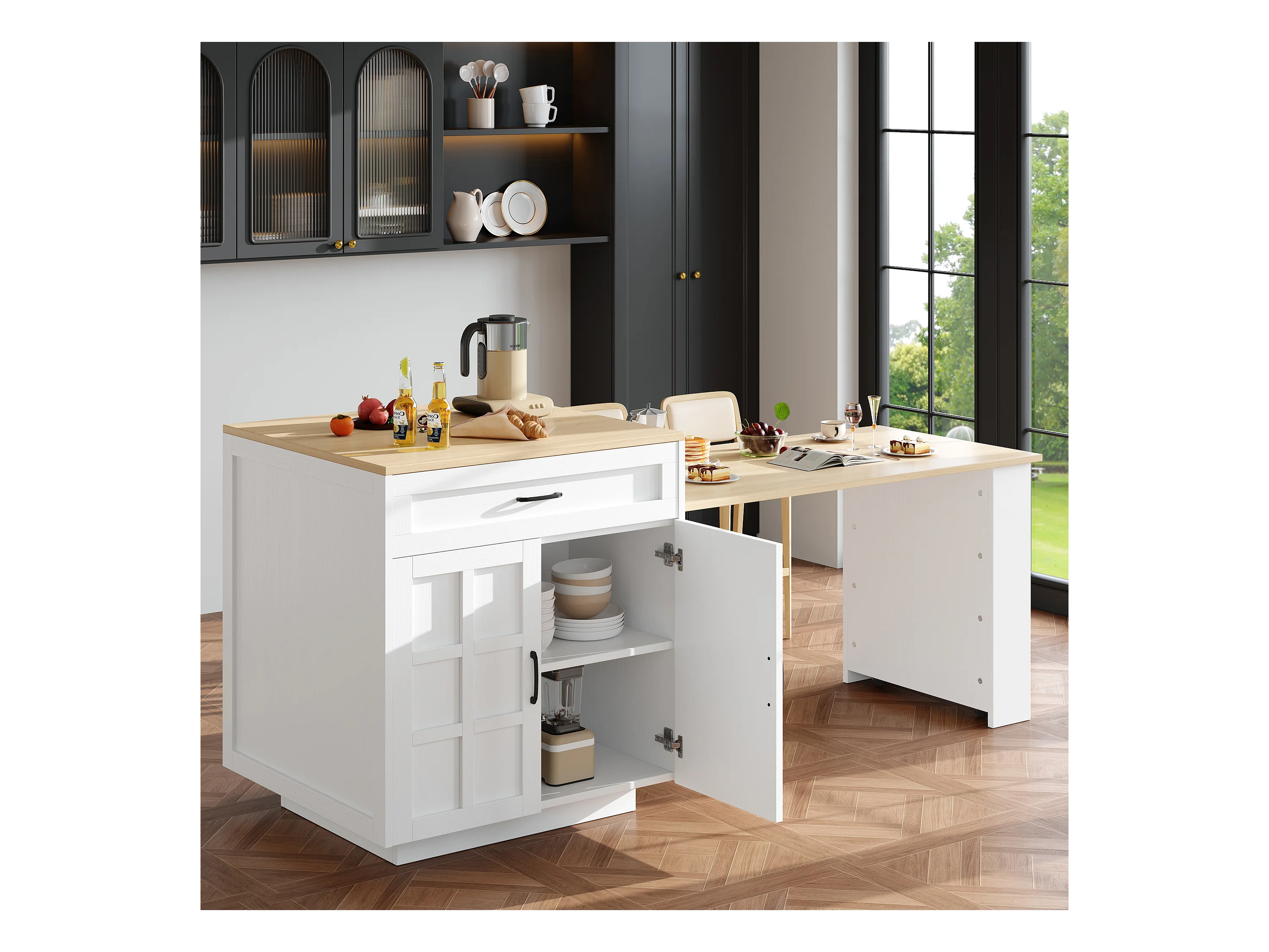 Ilot central de cuisine, table à manger 4 à 6 couverts - 2 tiroirs, 2 portes et étagères - 133/202 x 70 x 93.5 cm - MDF - Blanc