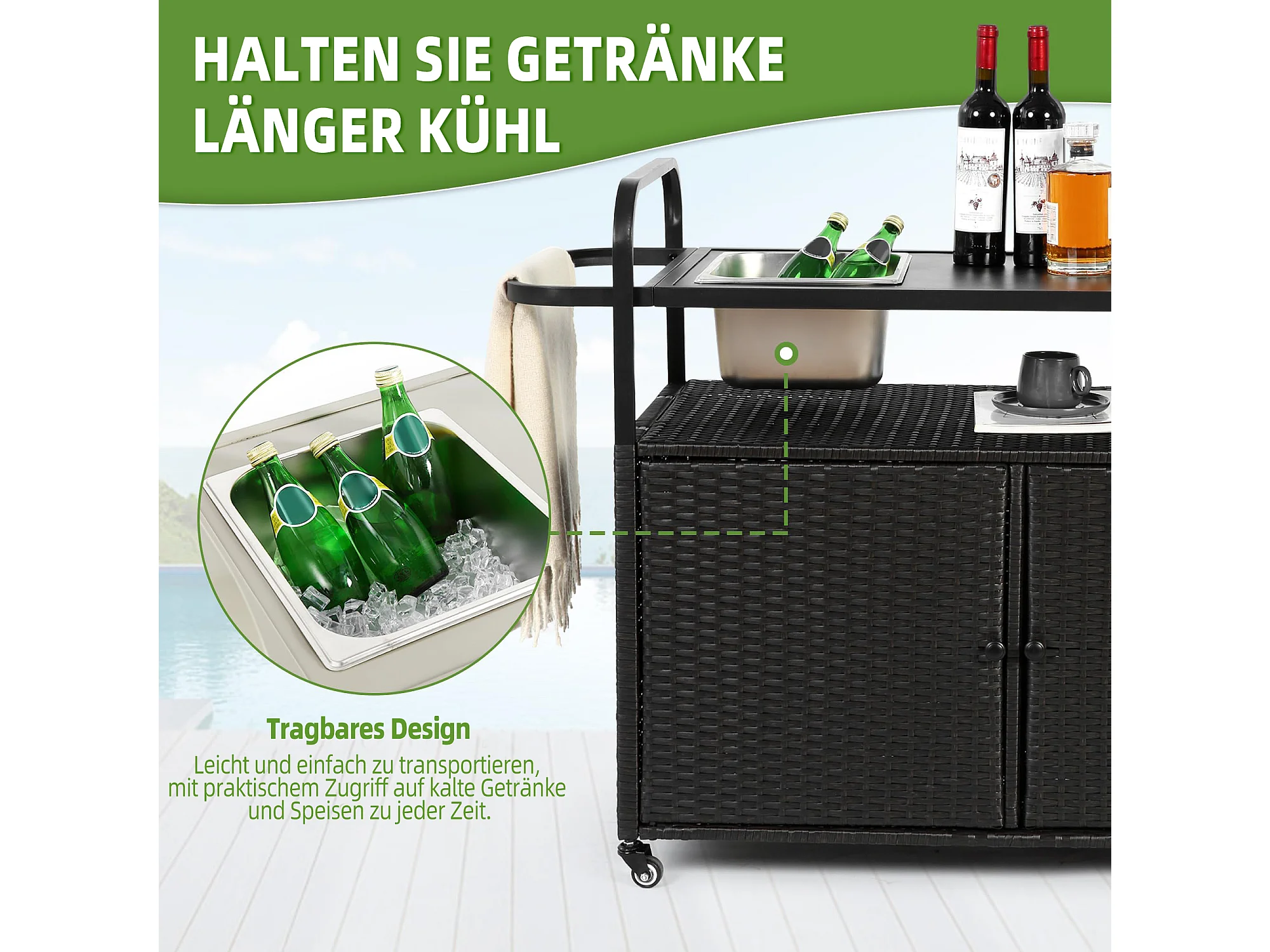 Îlot central en rotin noir - 2 portes - Style bohème naturel avec 2 étagères - Avec roulettes pour déplacement facile - Idéal pour terrasse ou jardin