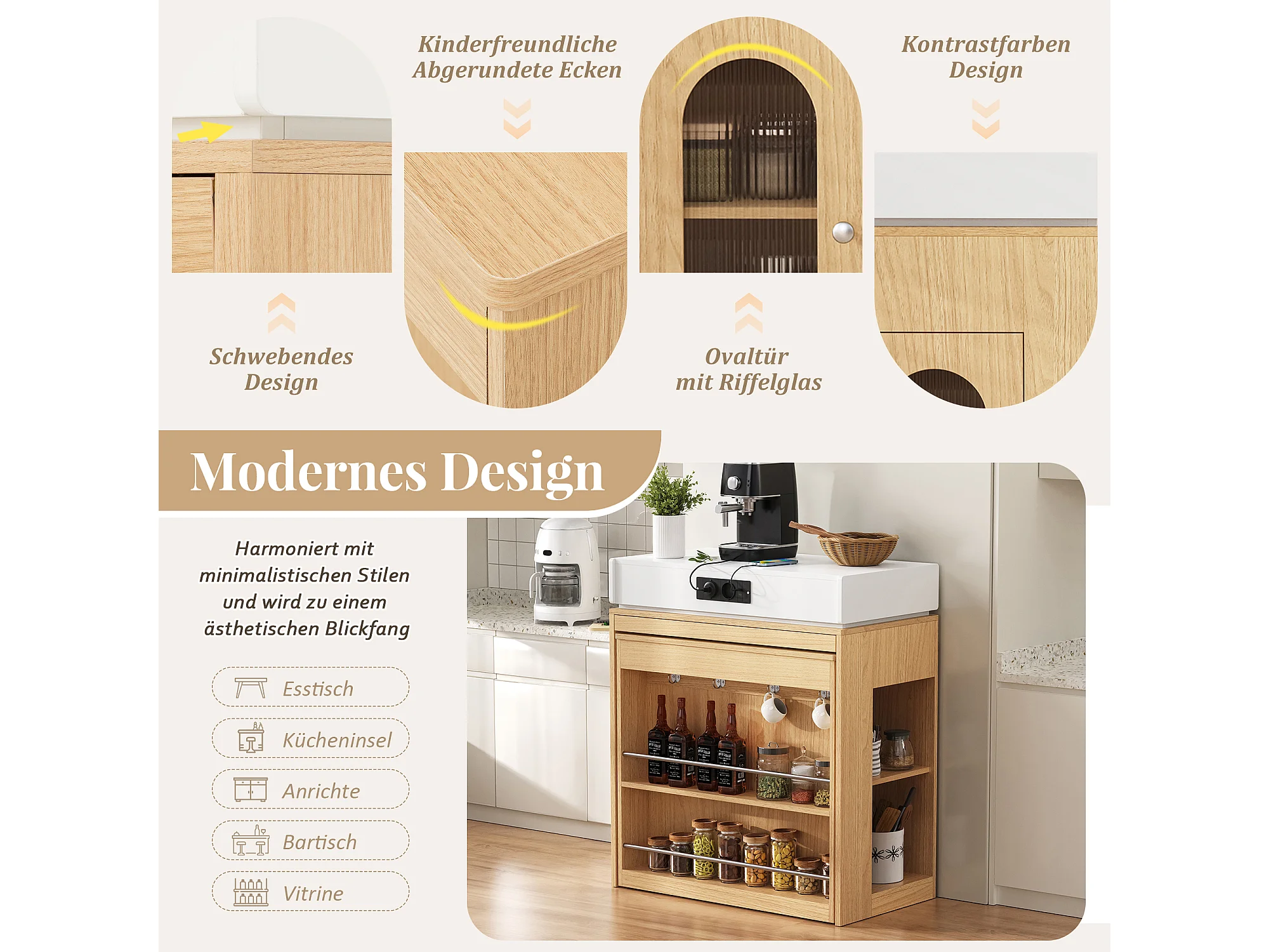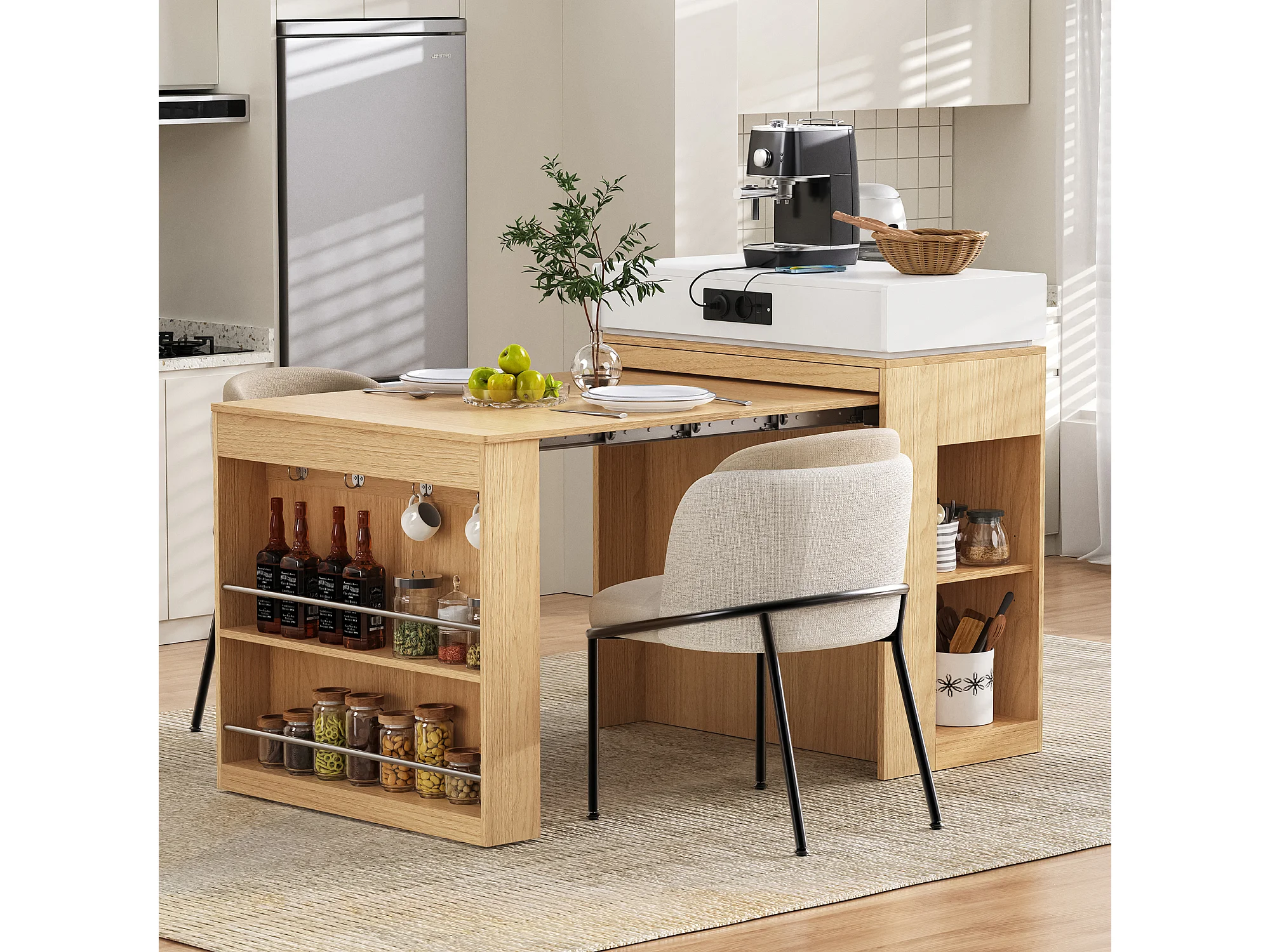 Îlot central extensible sur roulettes avec plateau rabattable - 83 x 46 x 96 cm - table de bar avec porte et tiroir - MDF + verre - naturel