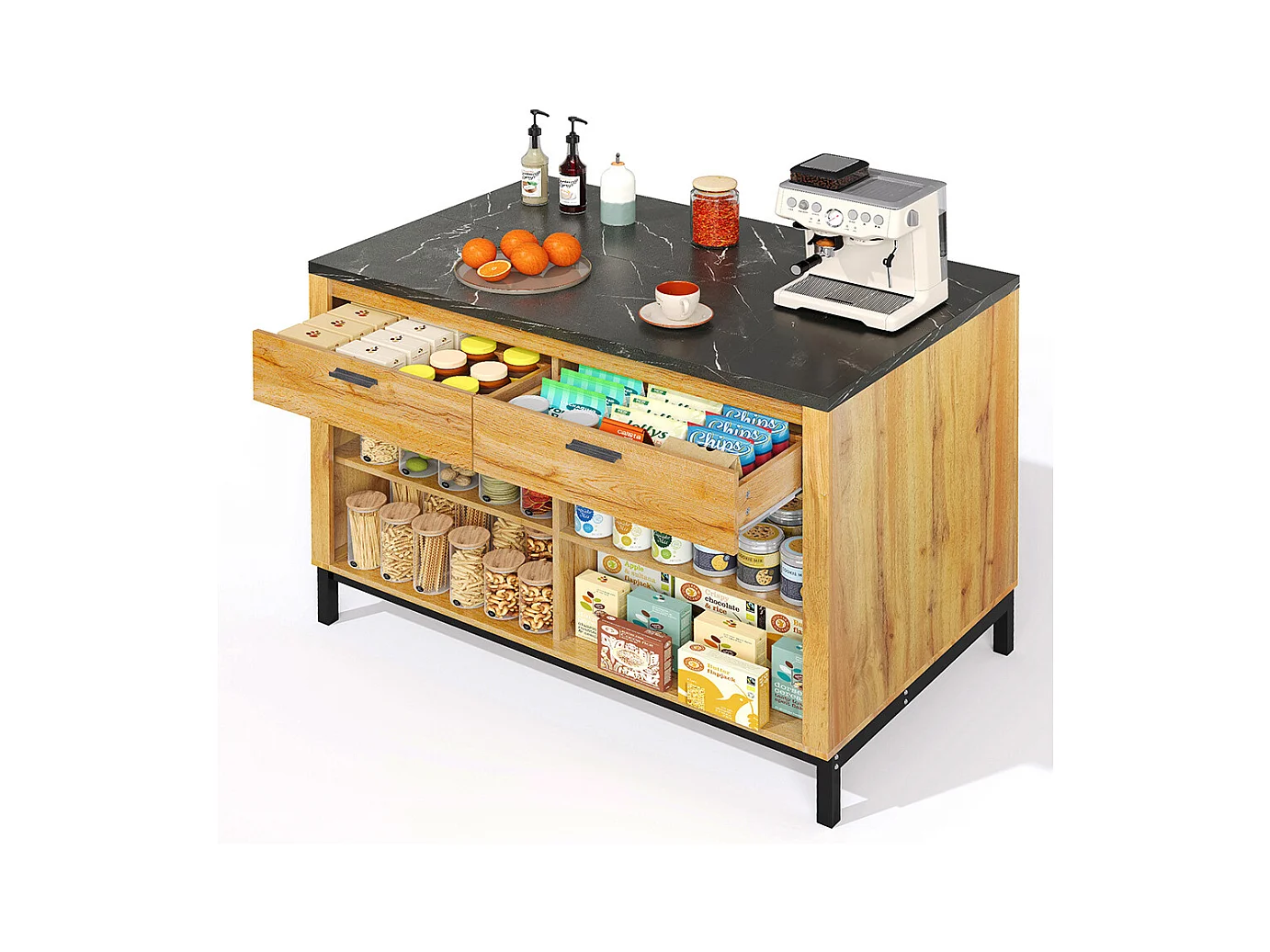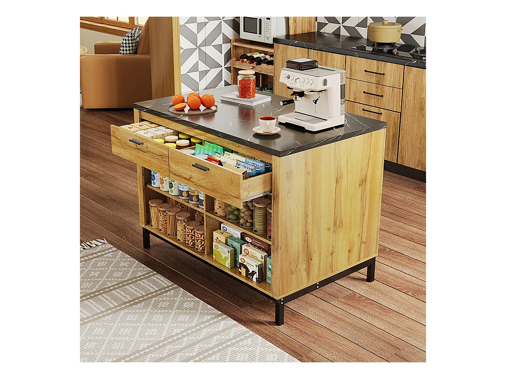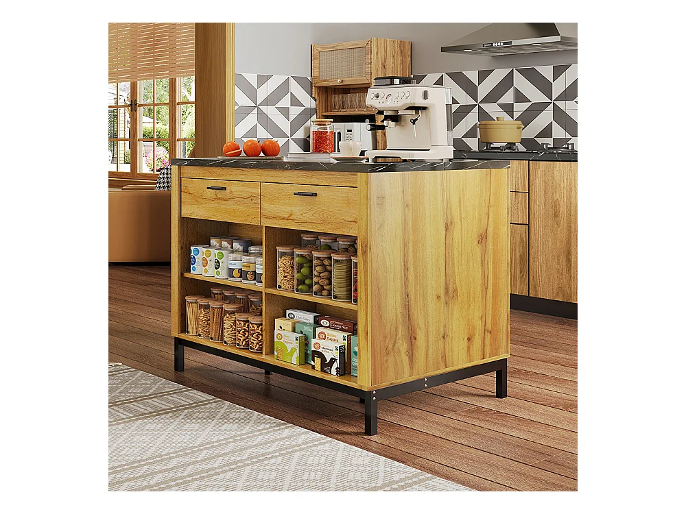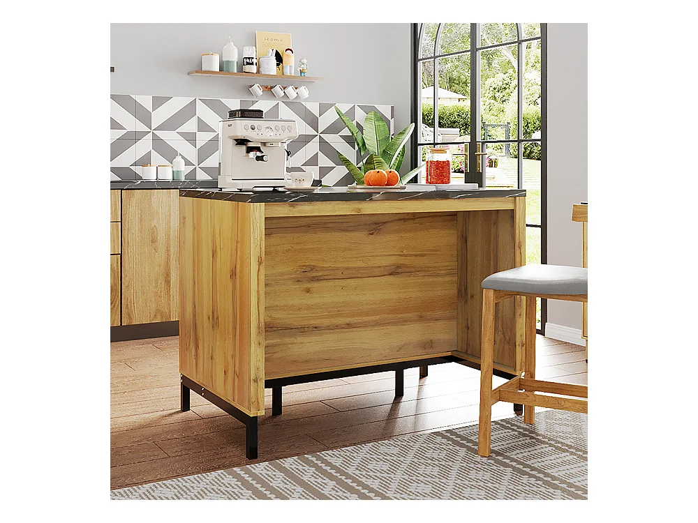 Îlot central rustique 2 tiroirs 4 étagères chêne plateau marbre noir structure métallique coin bar