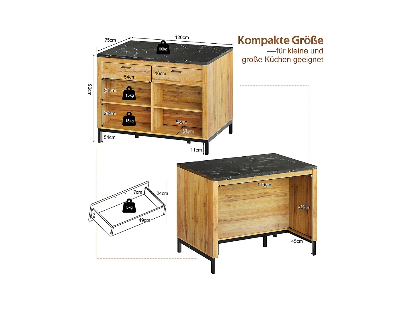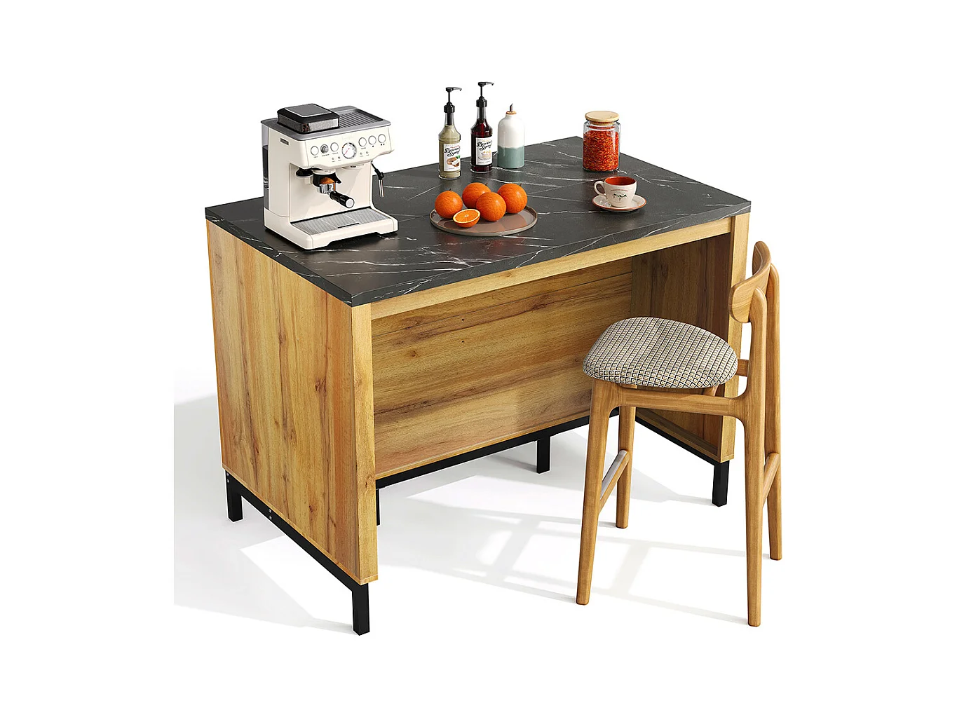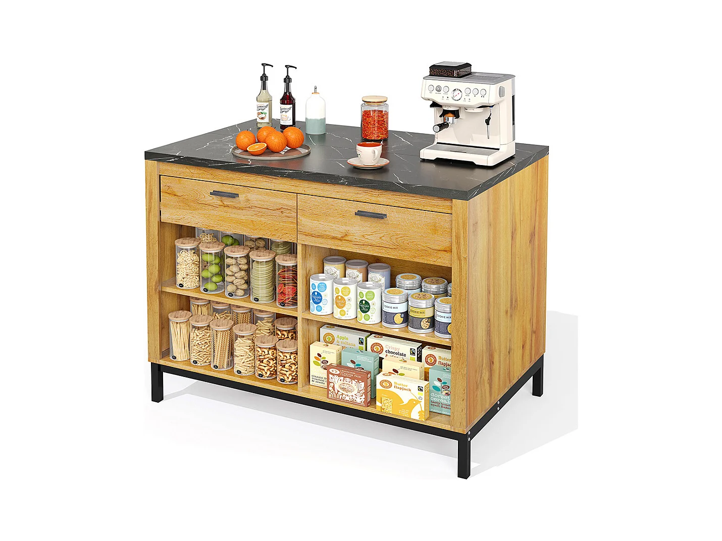 Îlot central rustique 2 tiroirs 4 étagères chêne plateau marbre noir structure métallique coin bar