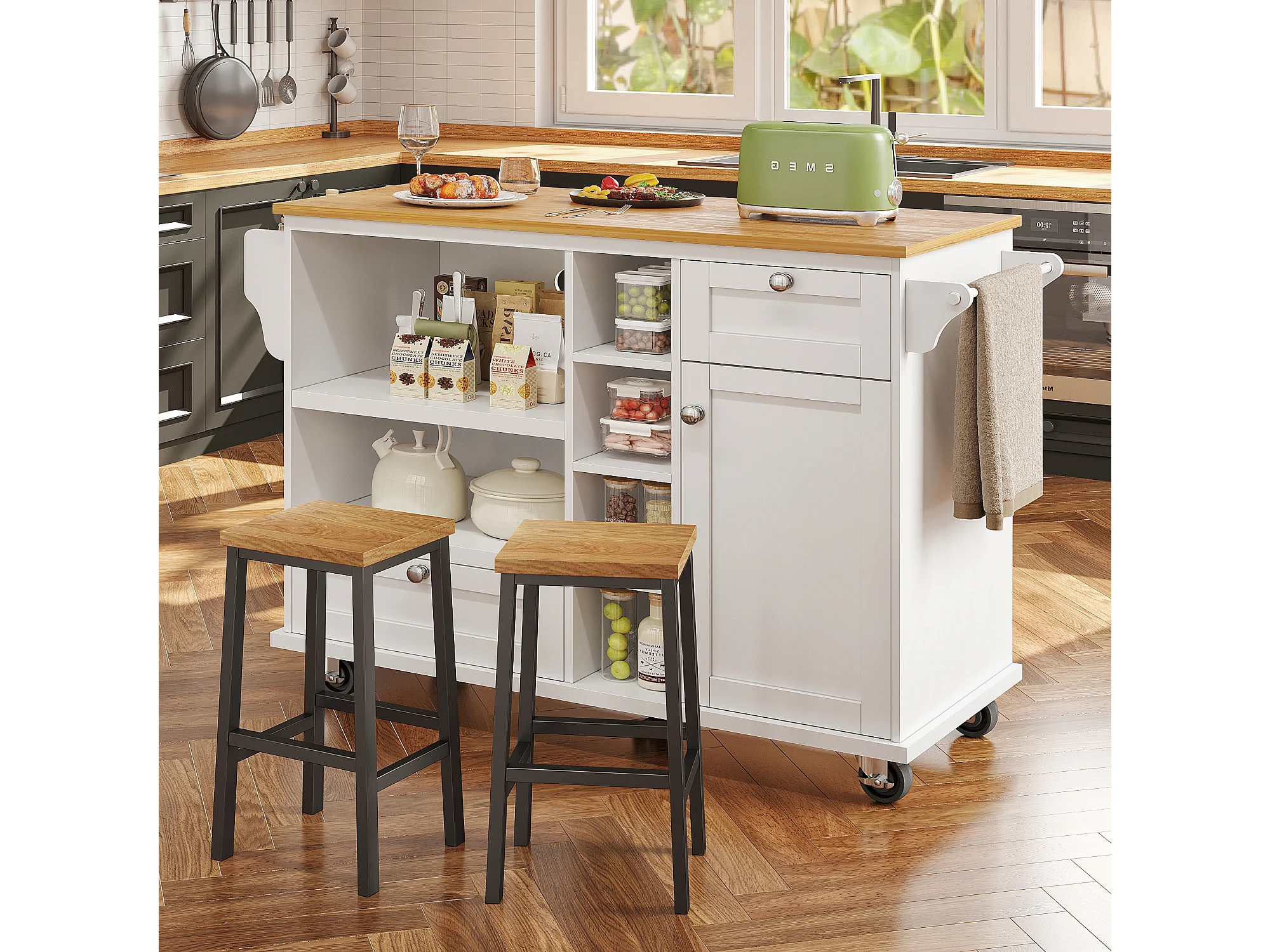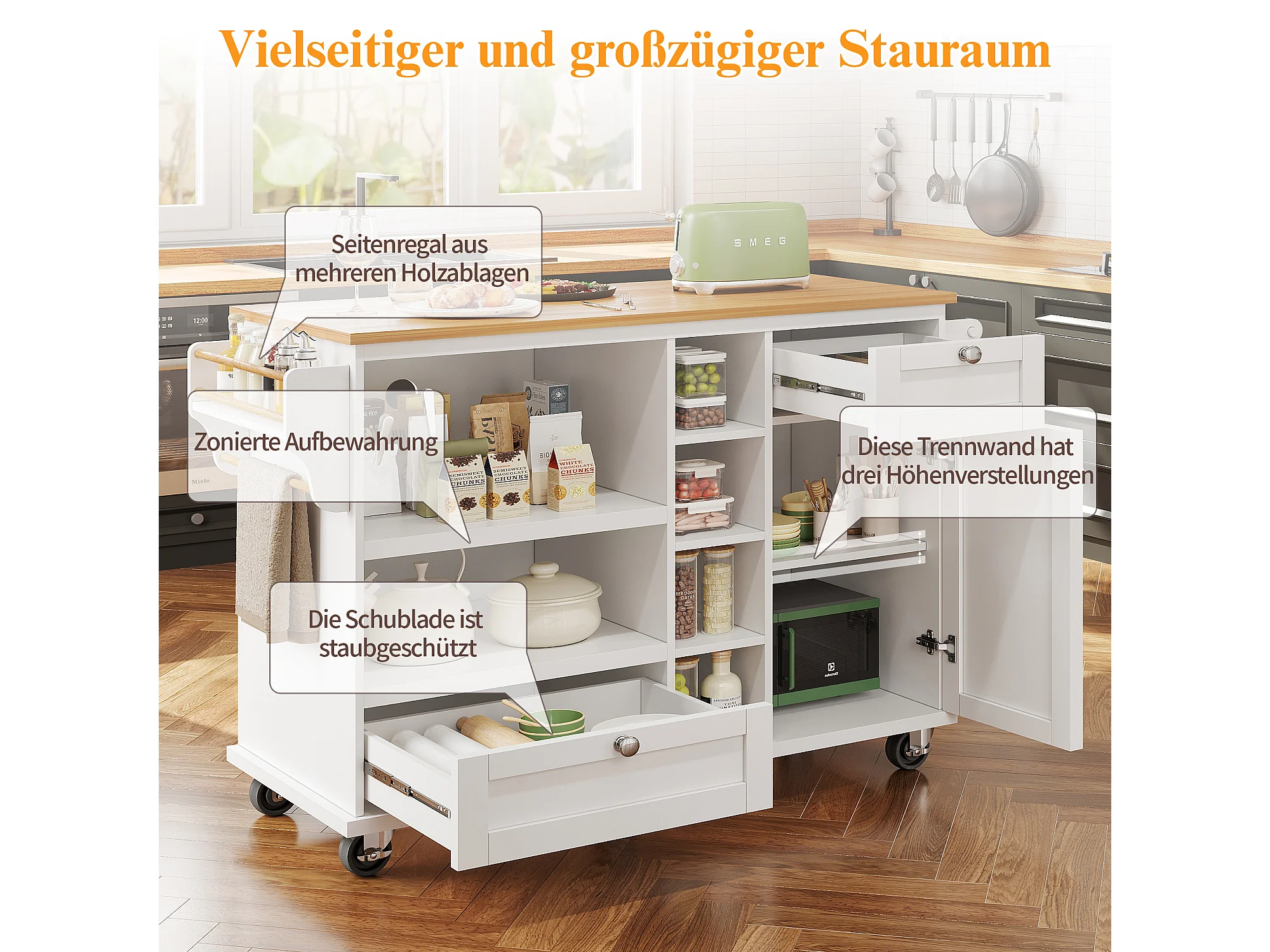 Îlot de cuisine à roulettes - 129 x 46 x 92 cm - avec 2 tiroirs + armoires de rangement + 1 porte - MDF - blanc