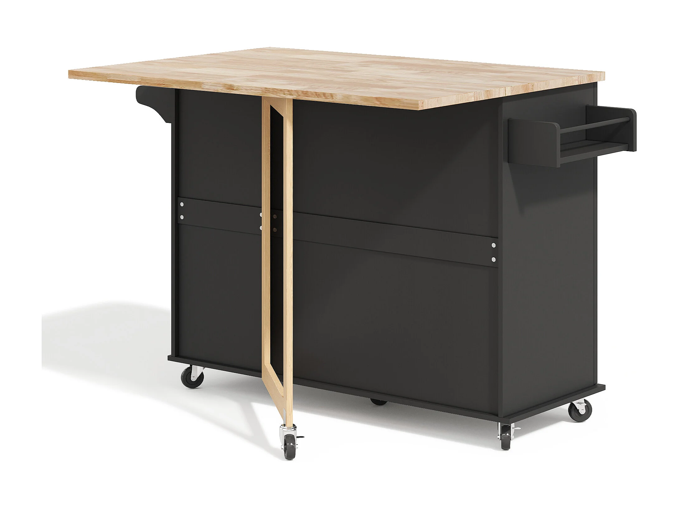Îlot de cuisine à roulettes 137x43/76 cm avec 3 tiroirs et 2 portes - Noir et bois