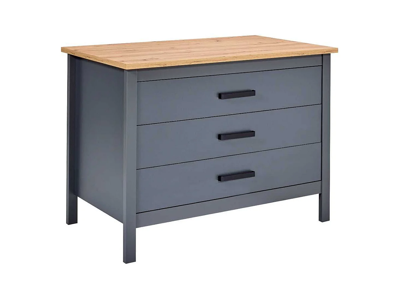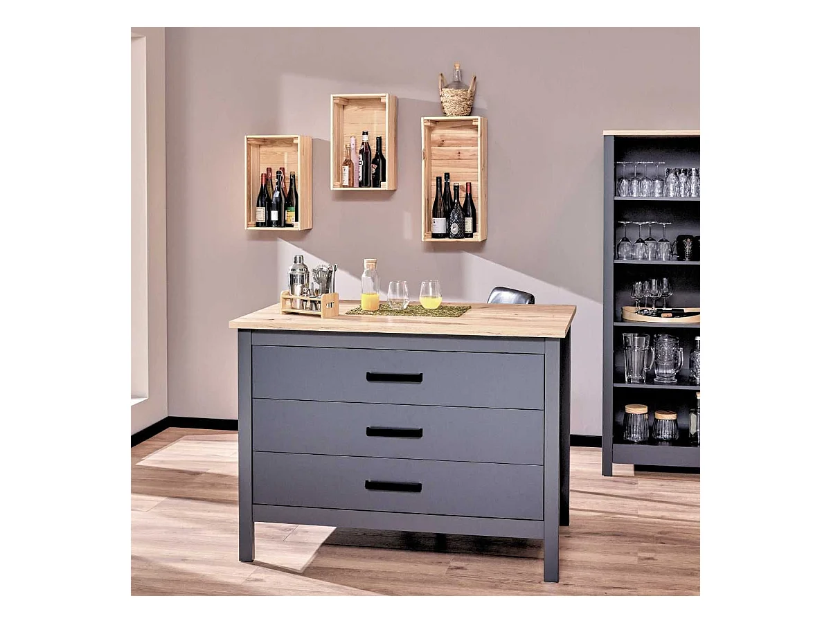 Ilot de Cuisine Anthracite et Plateau Effet Bois avec un côté 3 tiroirs et 1 côté 2 étagères - KENNY