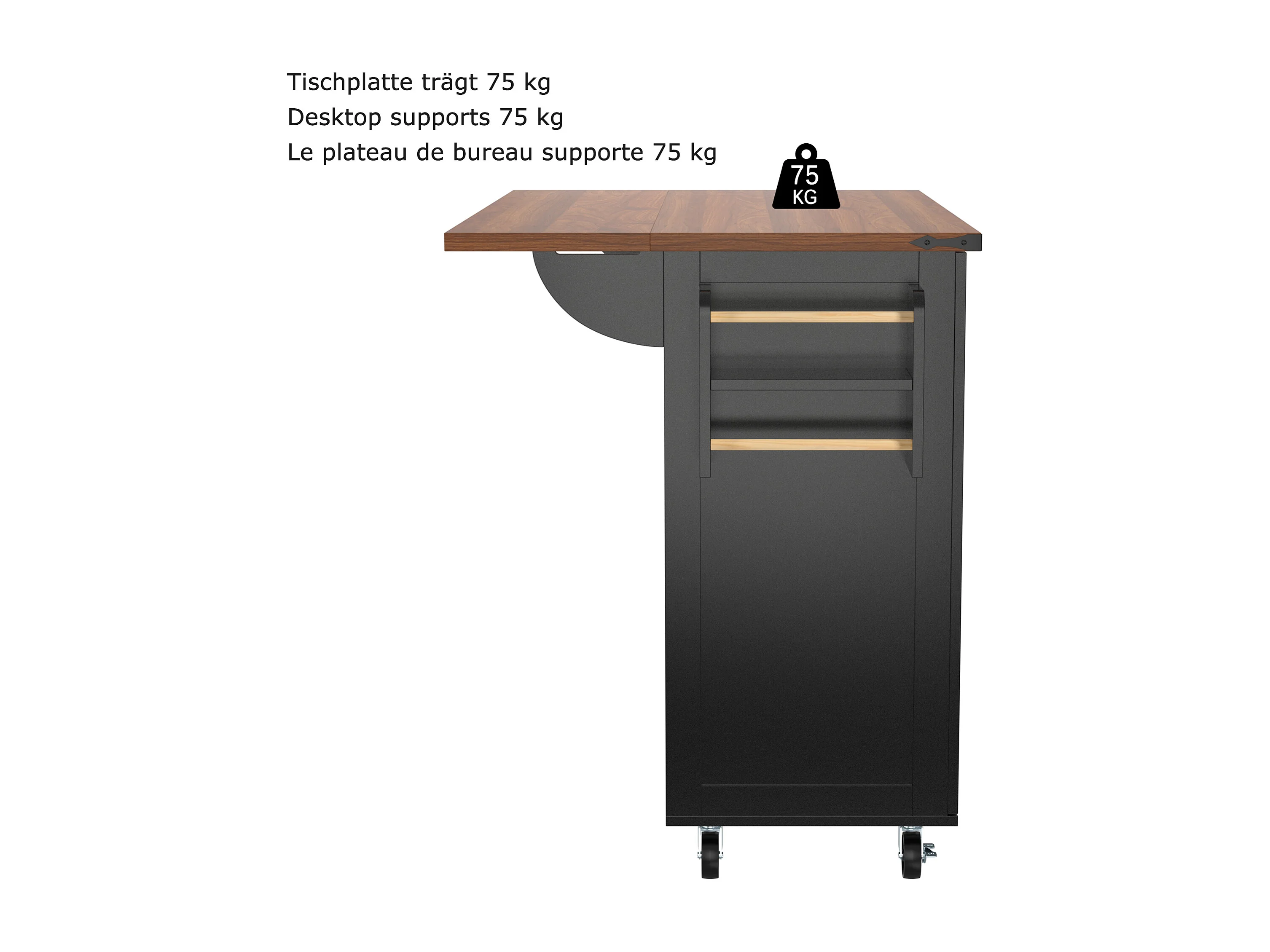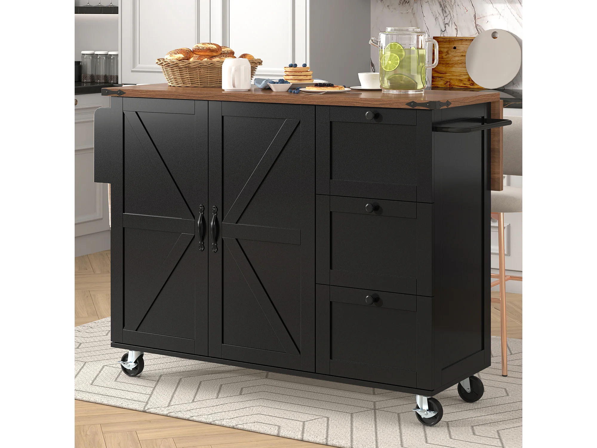 Îlot de Cuisine avec Plateau Rétroéclairé, Design Moderne, MDF, Noir et Noyer, avec 2 Portes et 3 Tiroirs (140x45x92.5 cm)