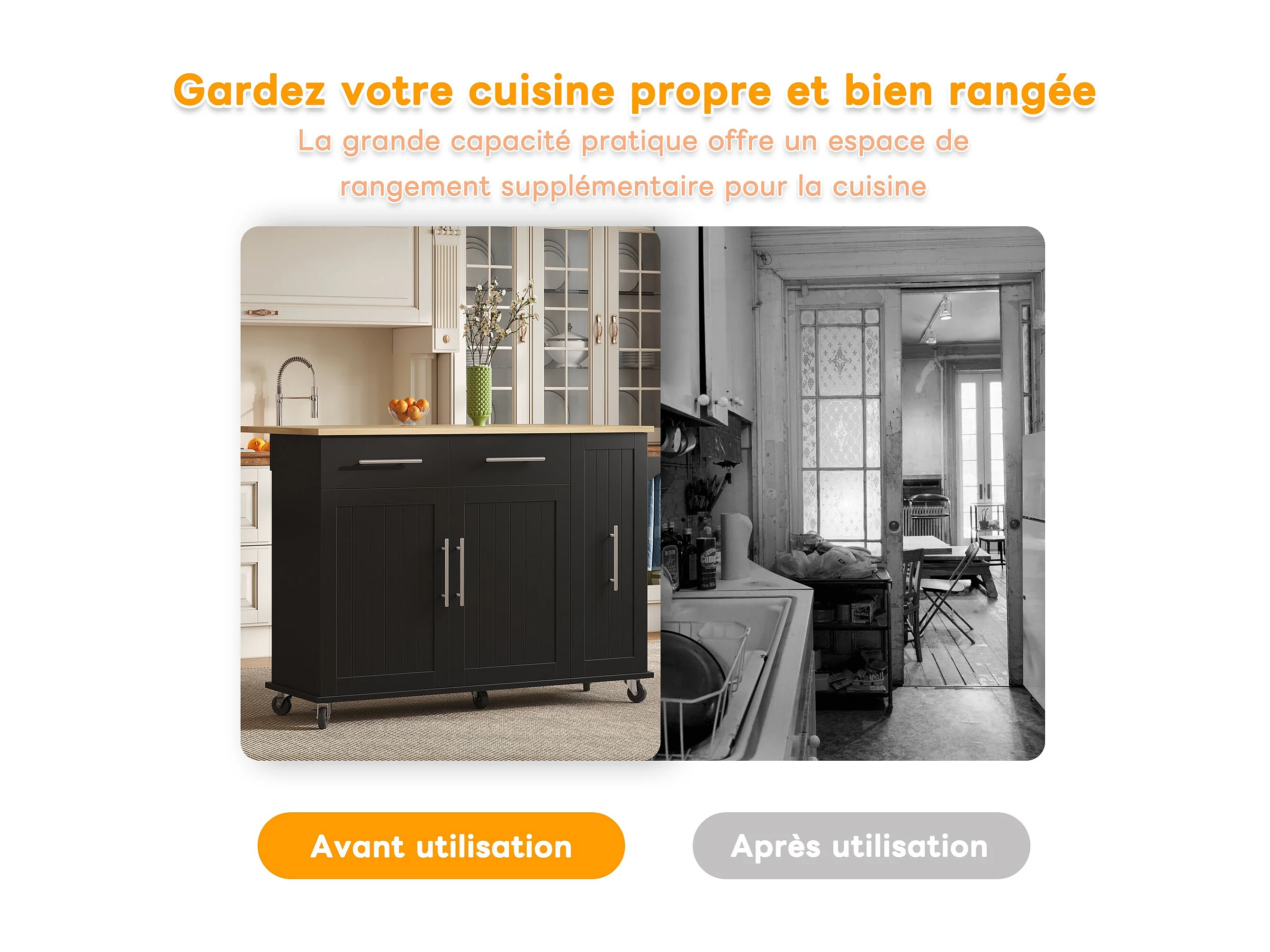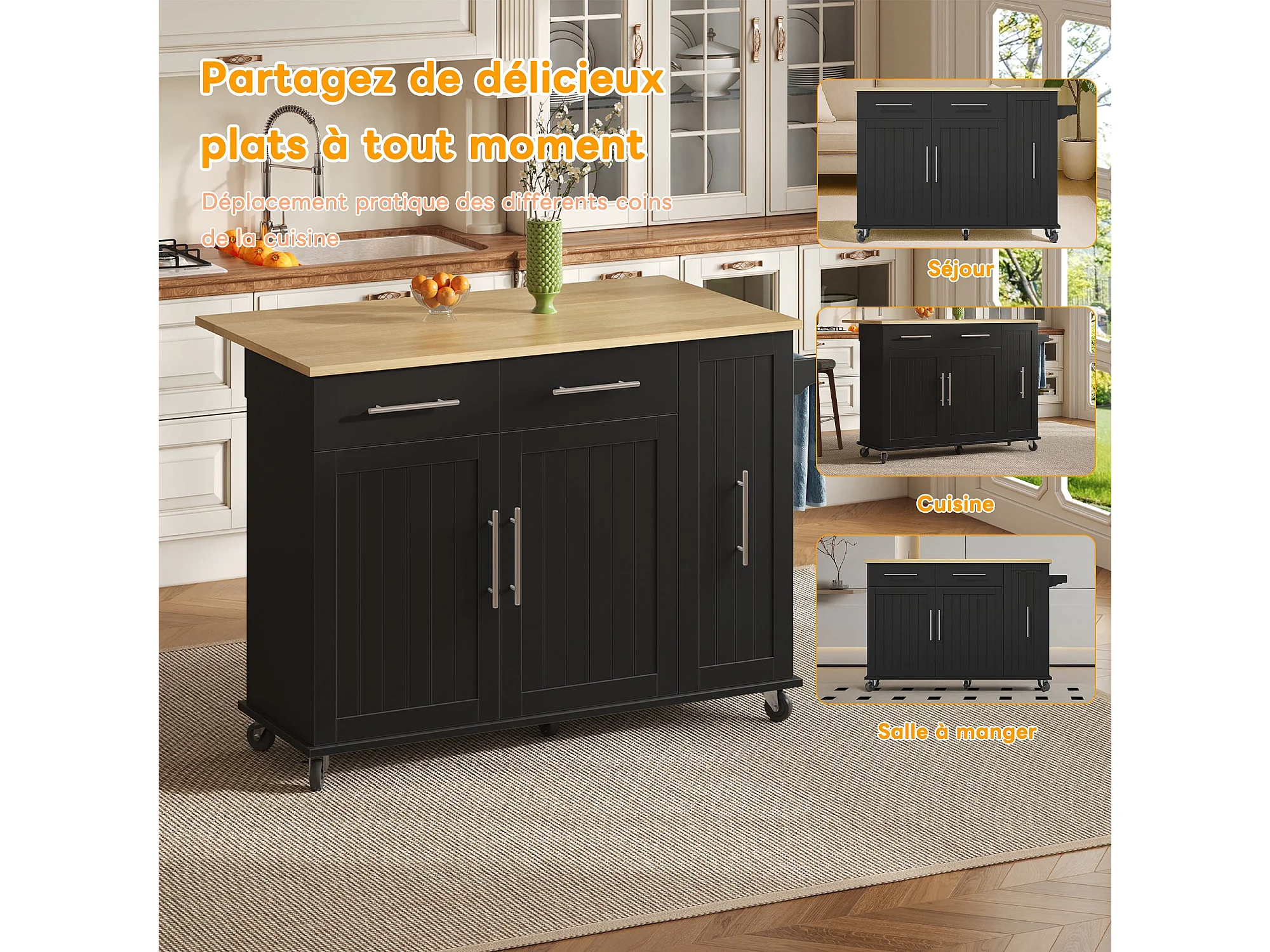 Îlot de cuisine avec tablette rabattable, chariot de rangement avec organiseur, chariot roulant sur roulettes