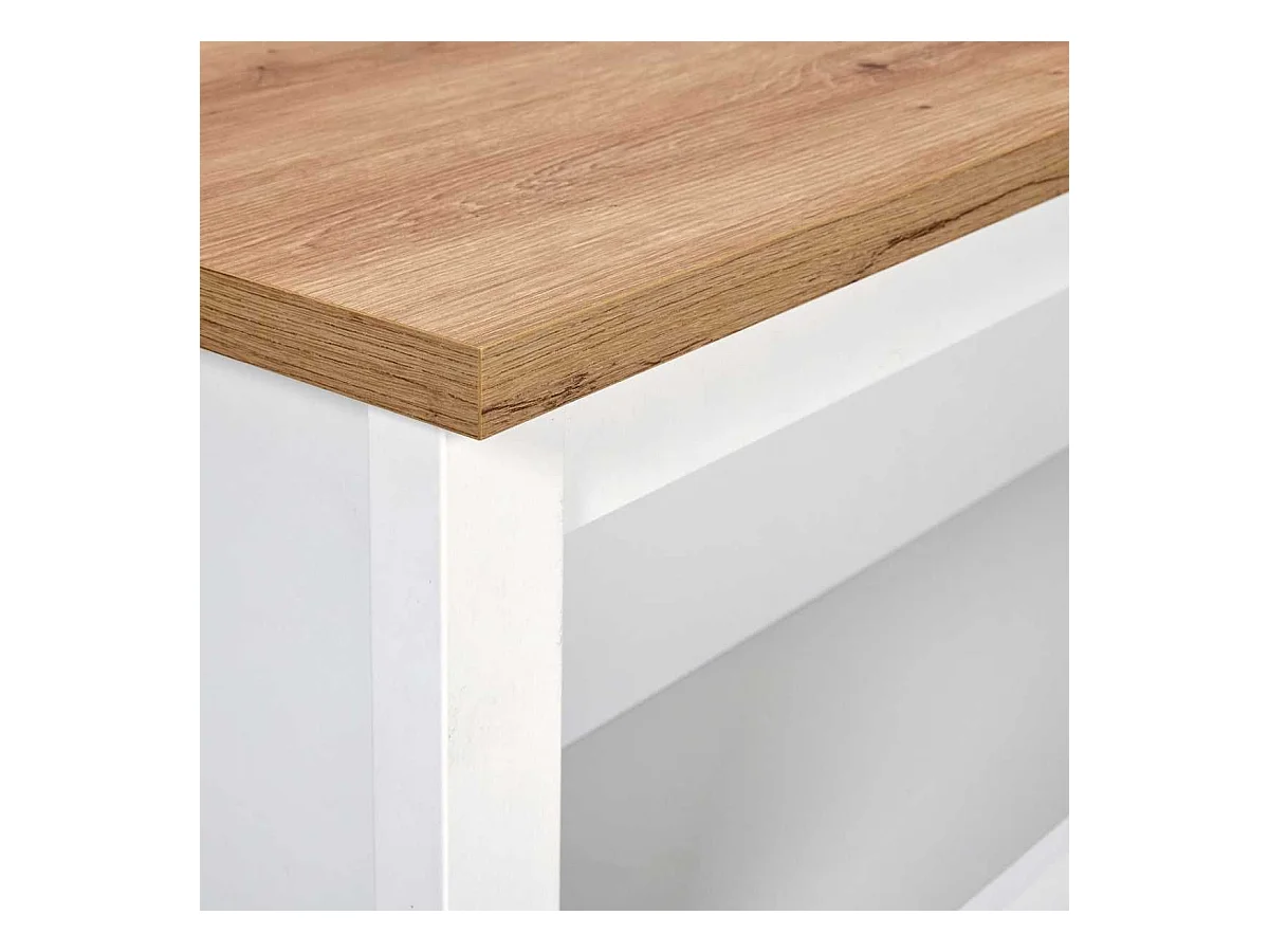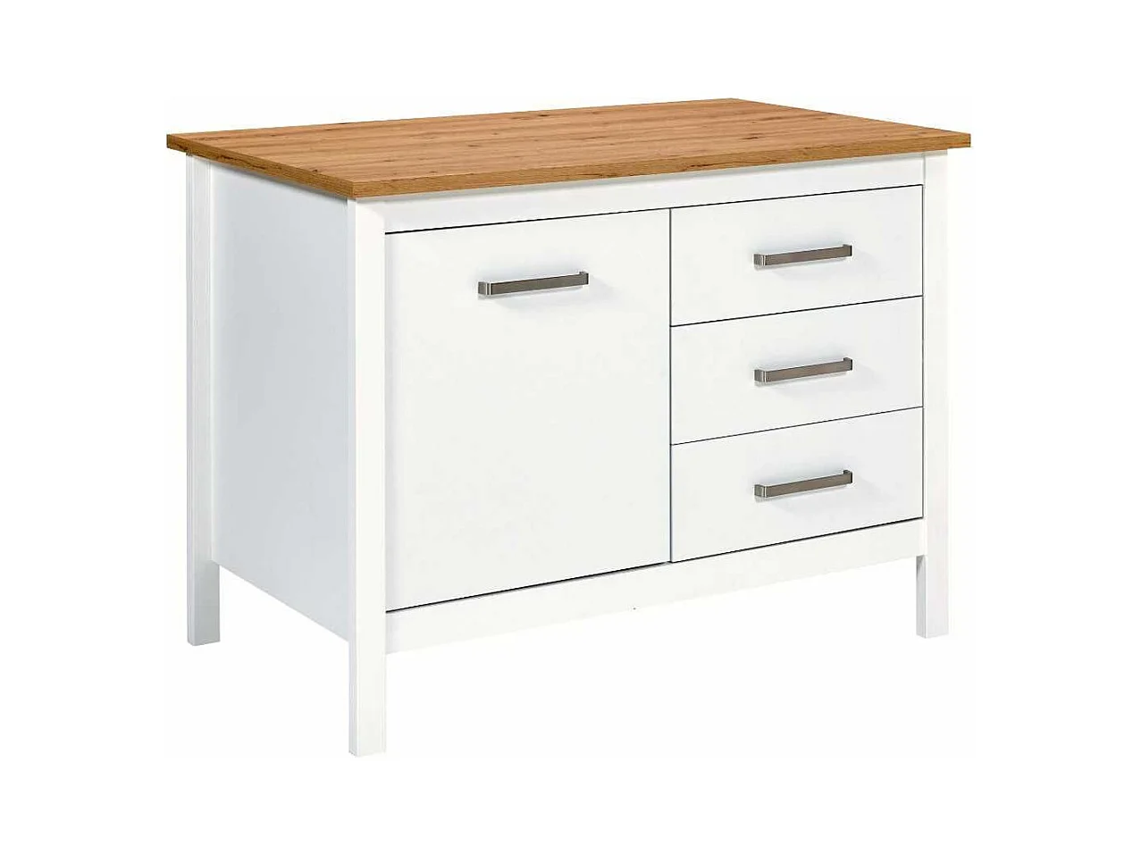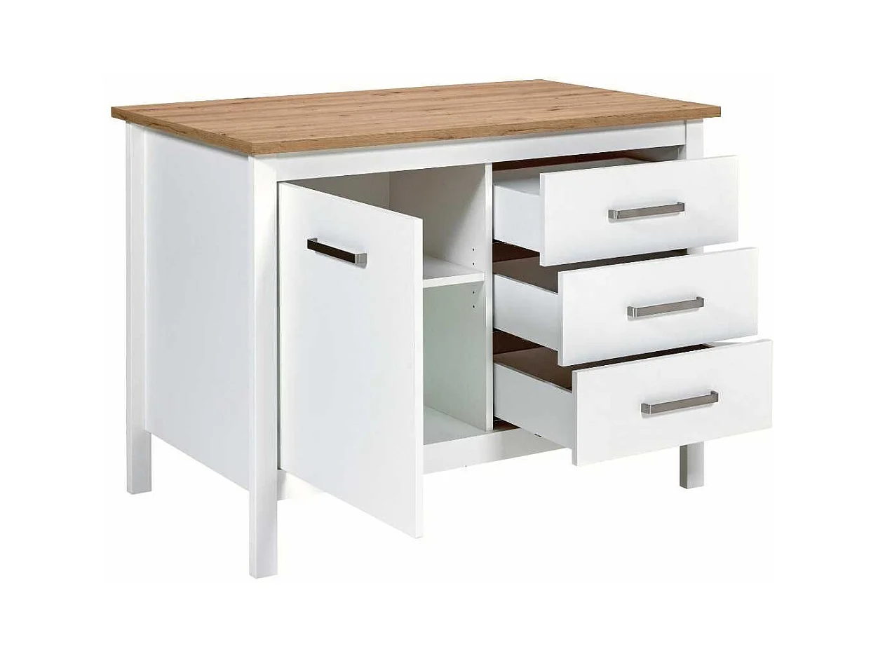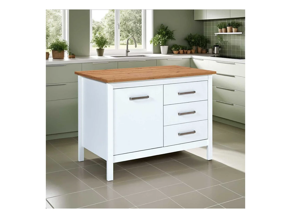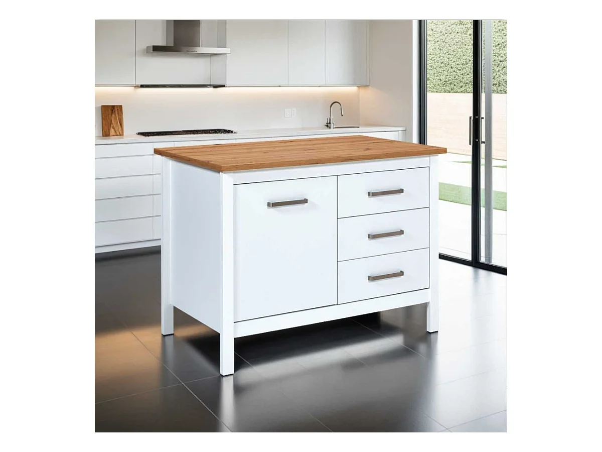 Ilot de Cuisine Blanc et Plateau Effet Bois avec un côté 1 porte 3 tiroirs et 1 côté 2 étagères - KENNY