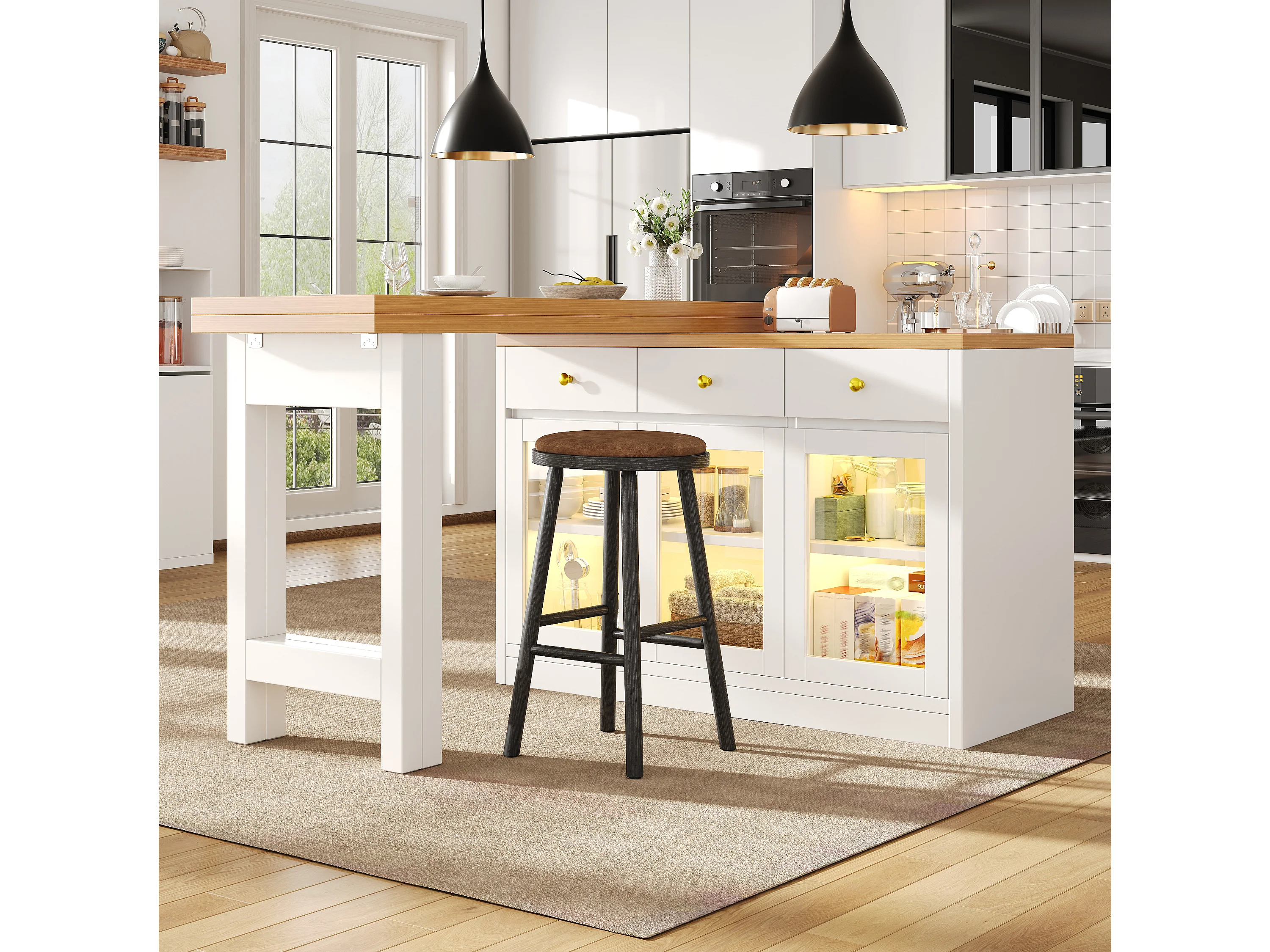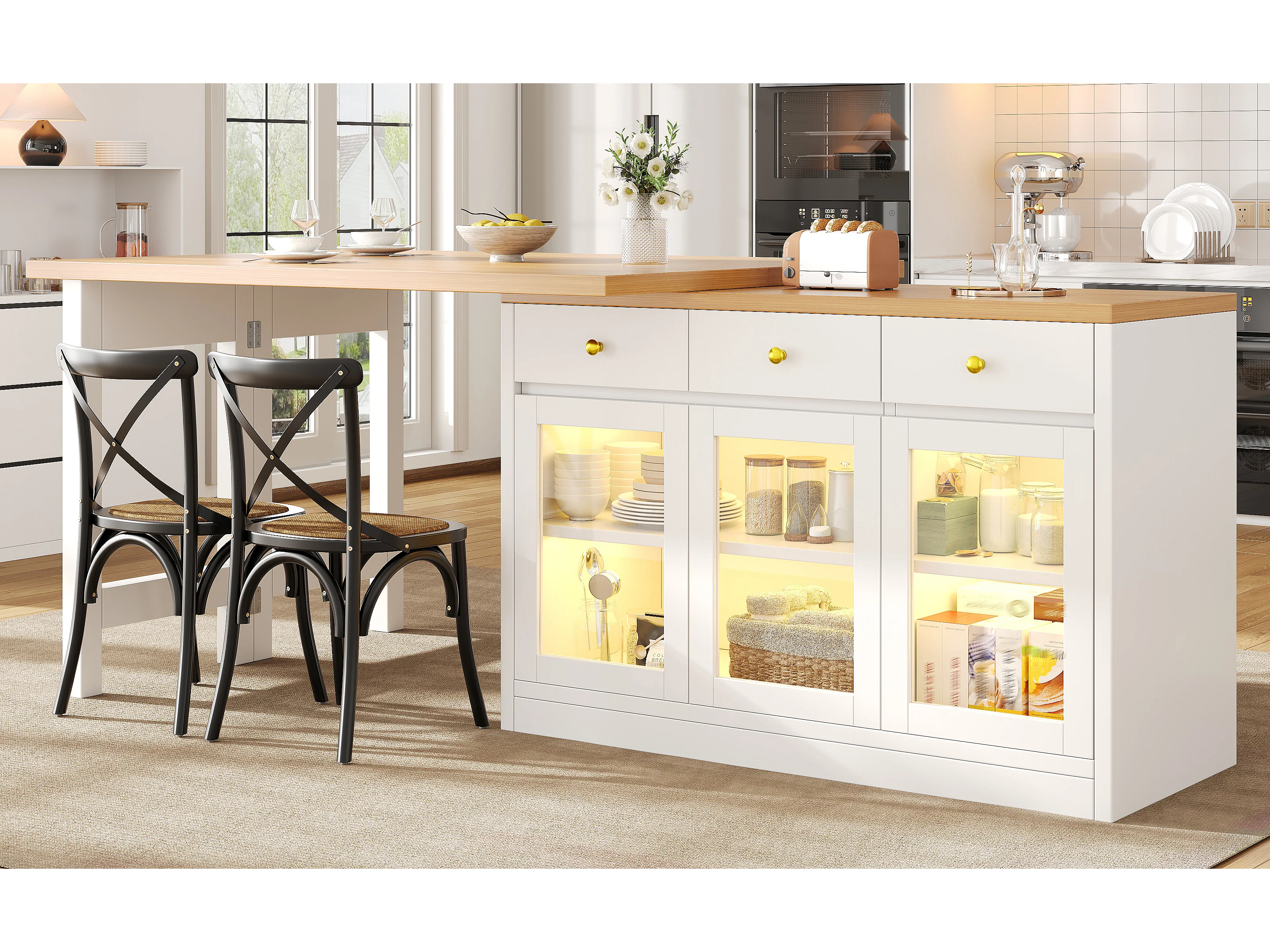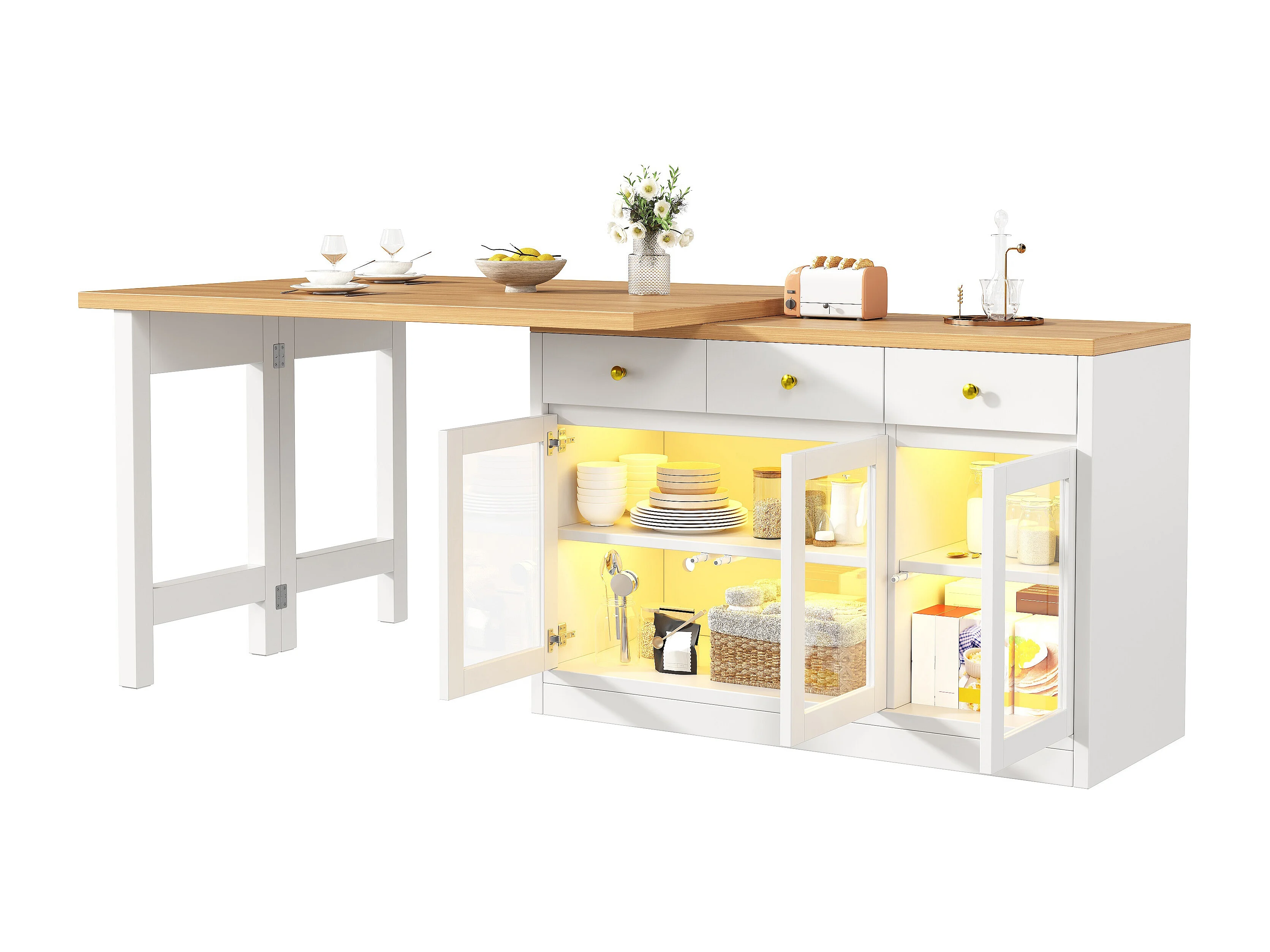 Îlot de cuisine extensible - 120-200 x 40 x 75 cm - avec Leds + tiroirs + portes vitrées - MDF - blanc