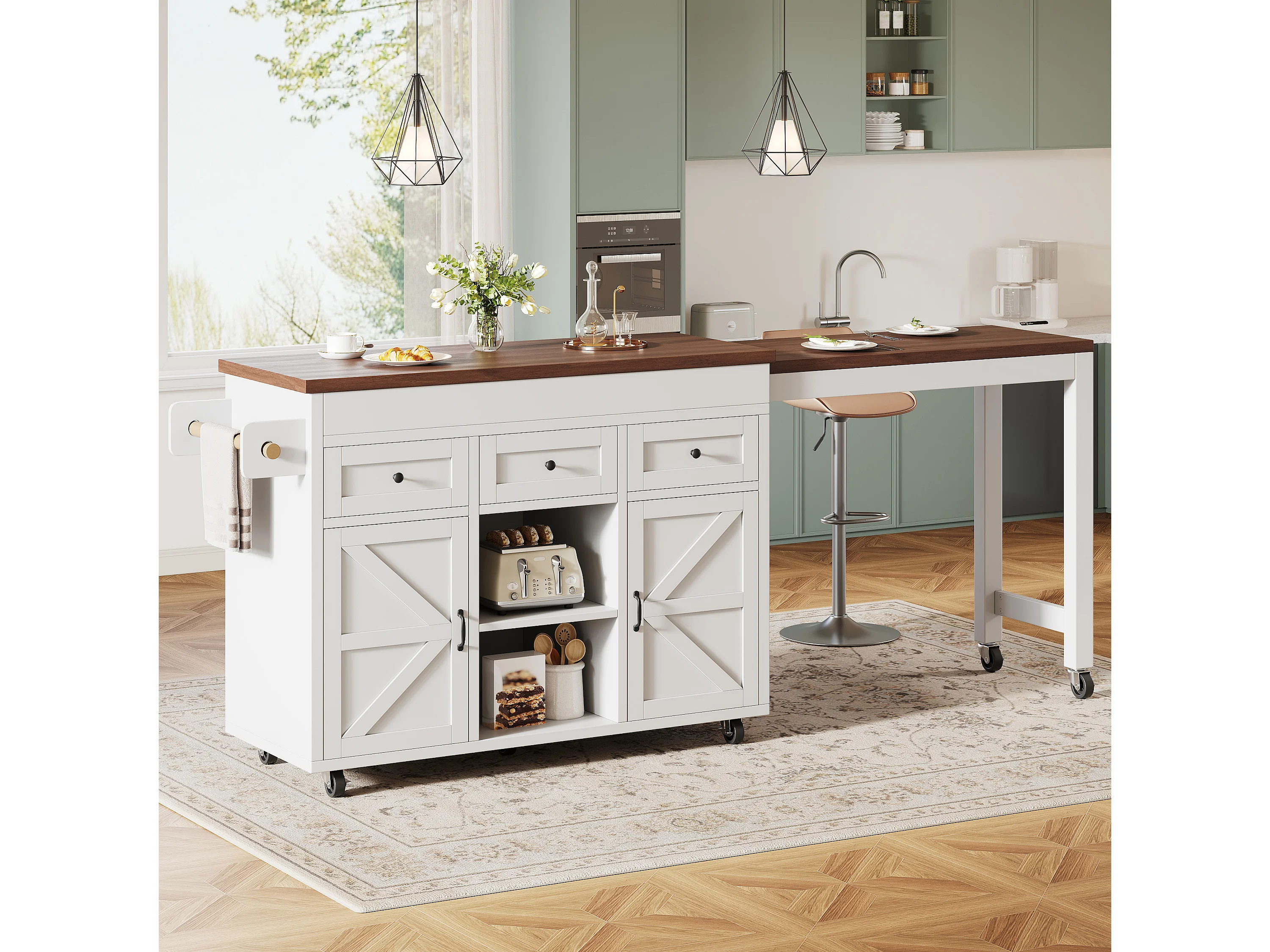 Îlot de cuisine extensible - 1315-210 cm x 40 x 92 cm - pivotante à 360°- avec 3 tiroirs + 2 portes - MDF - blanc