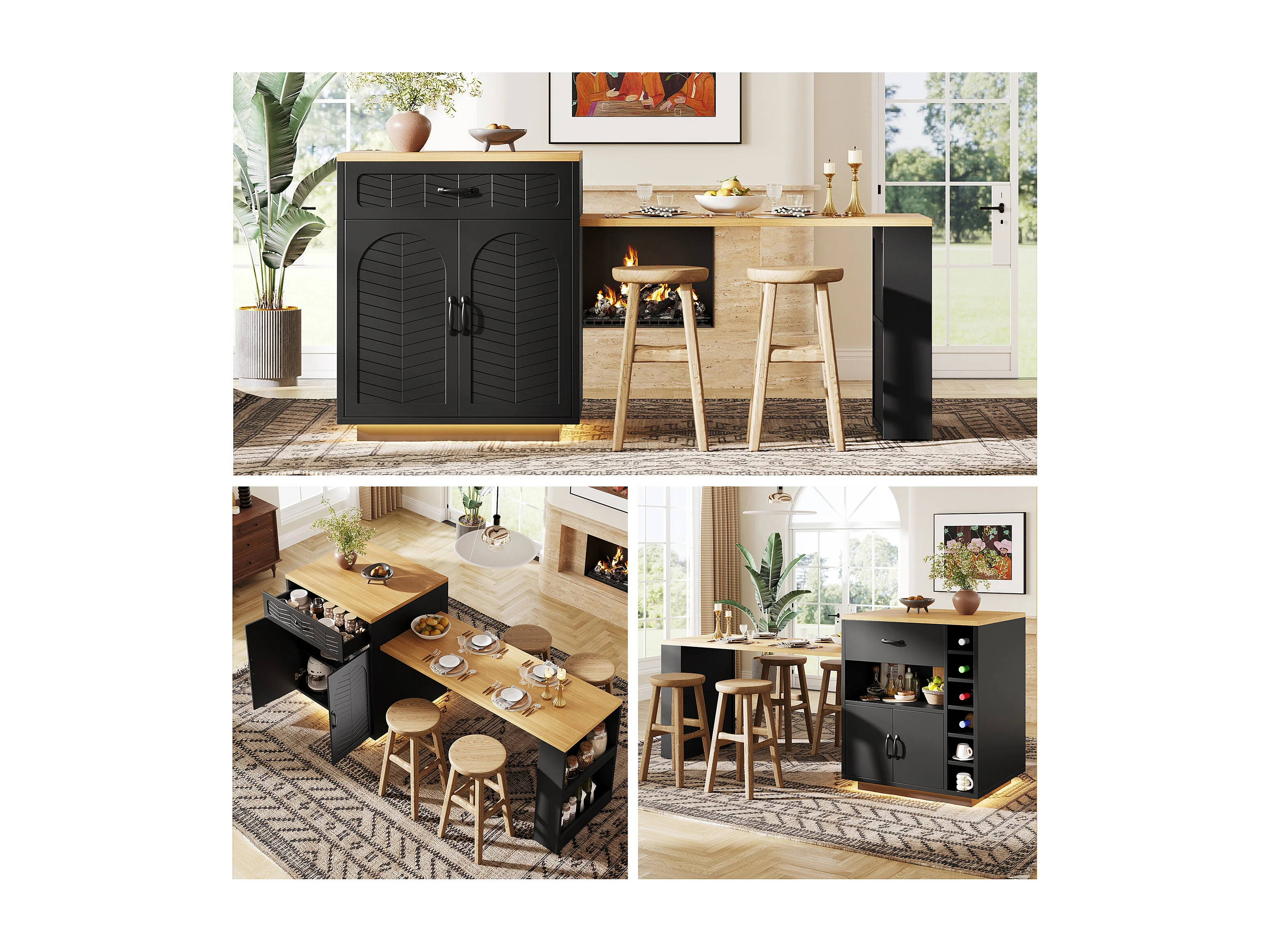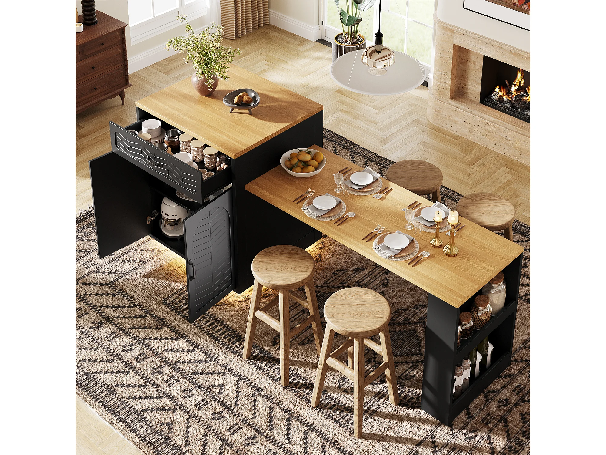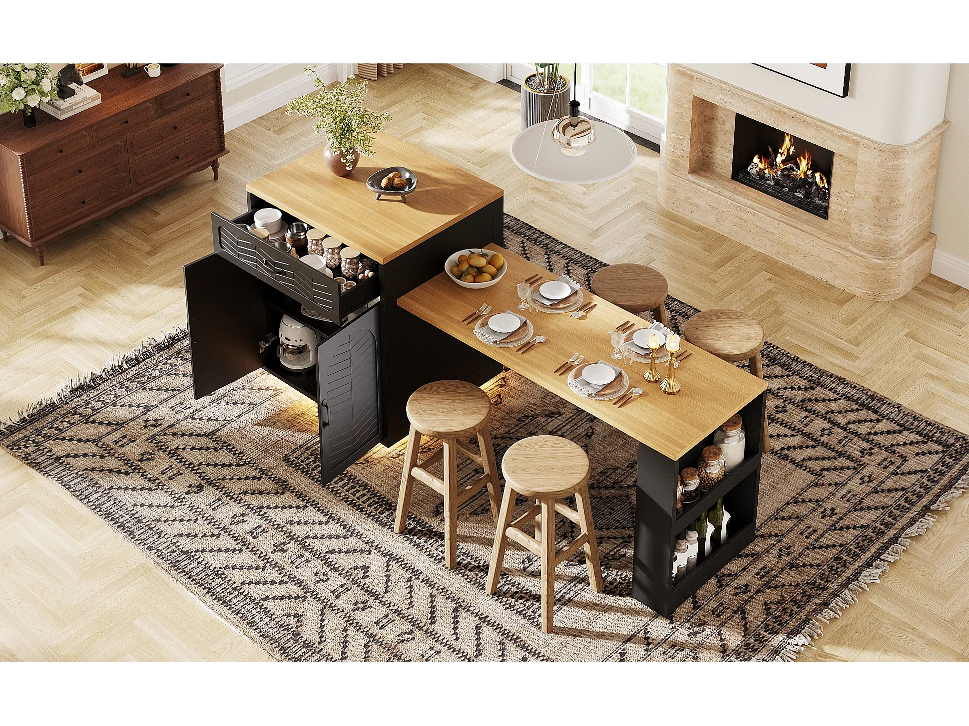 Îlot de cuisine / meuble bar - 193.5 x 70 x 95.5 cm - avec table coulissante + 2 tiroirs + 4 portes - MDF + métal - noir