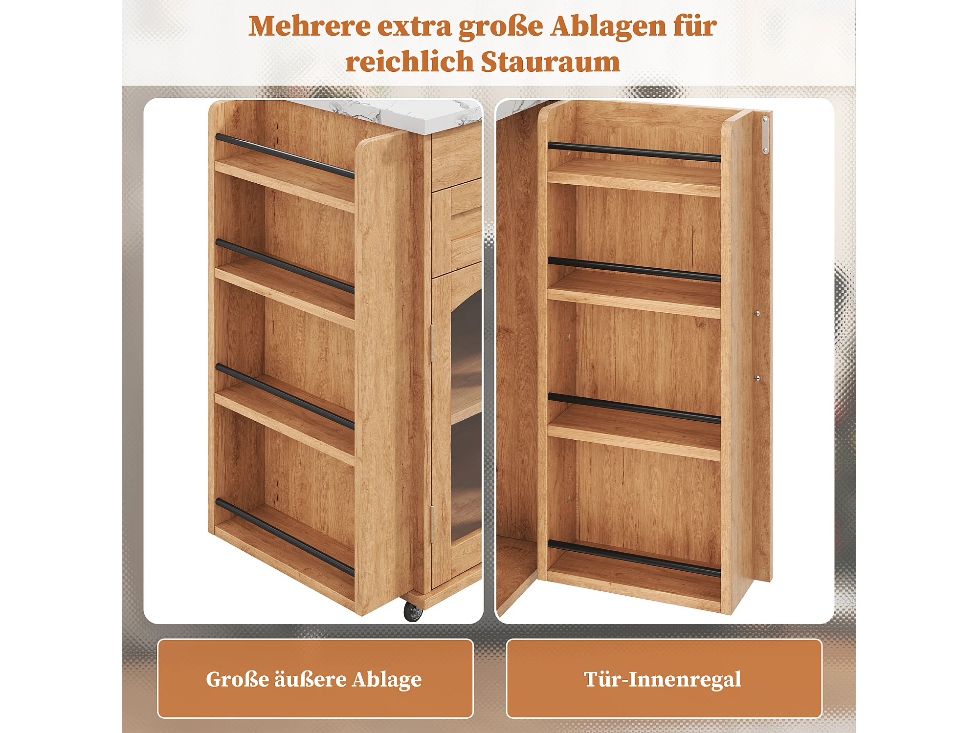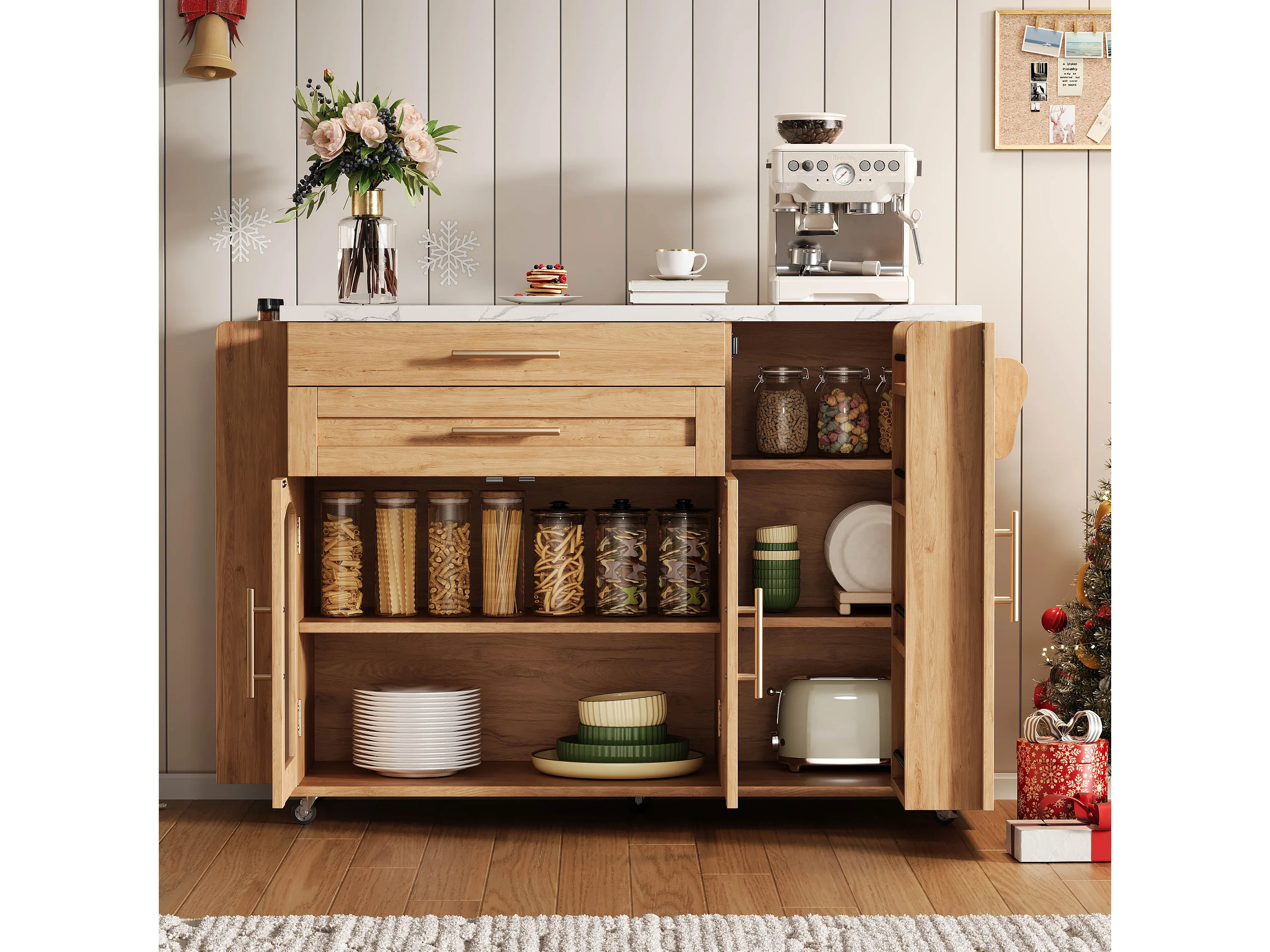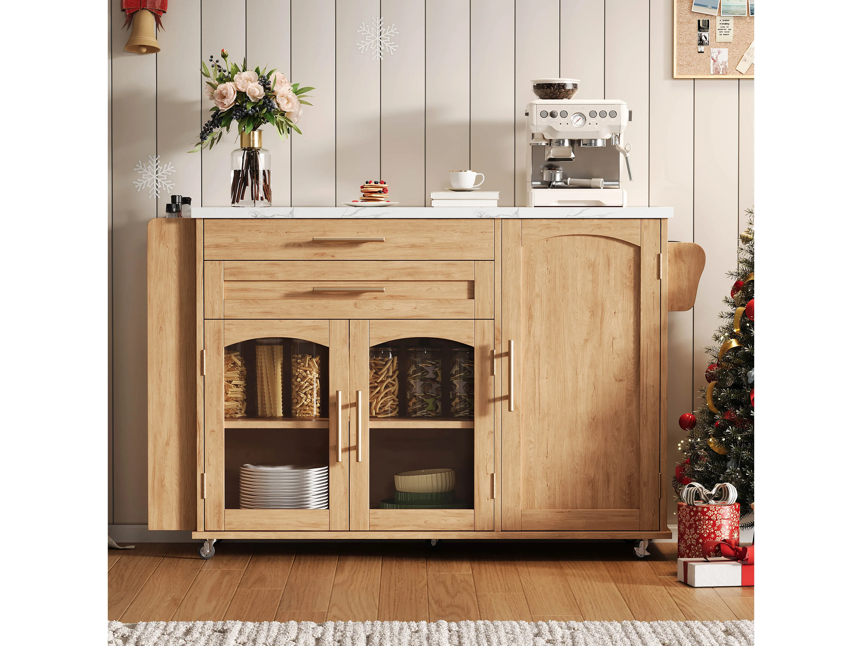 Îlot de cuisine mobile avec plan de travail pliable - 138 x 45 (70) x 90 cm - avec étagère + 2 tiroir + 3 portes - MDF - naturel